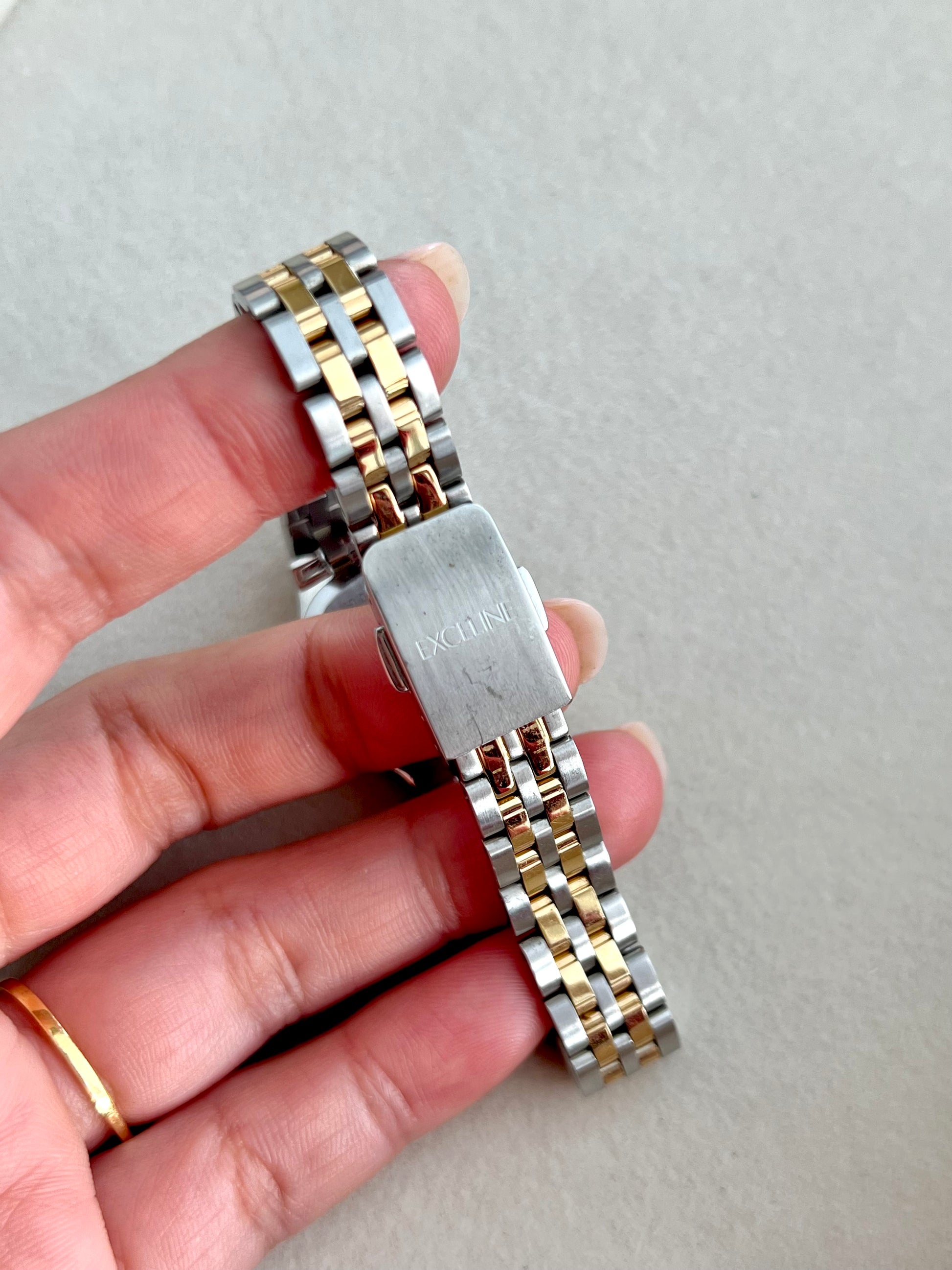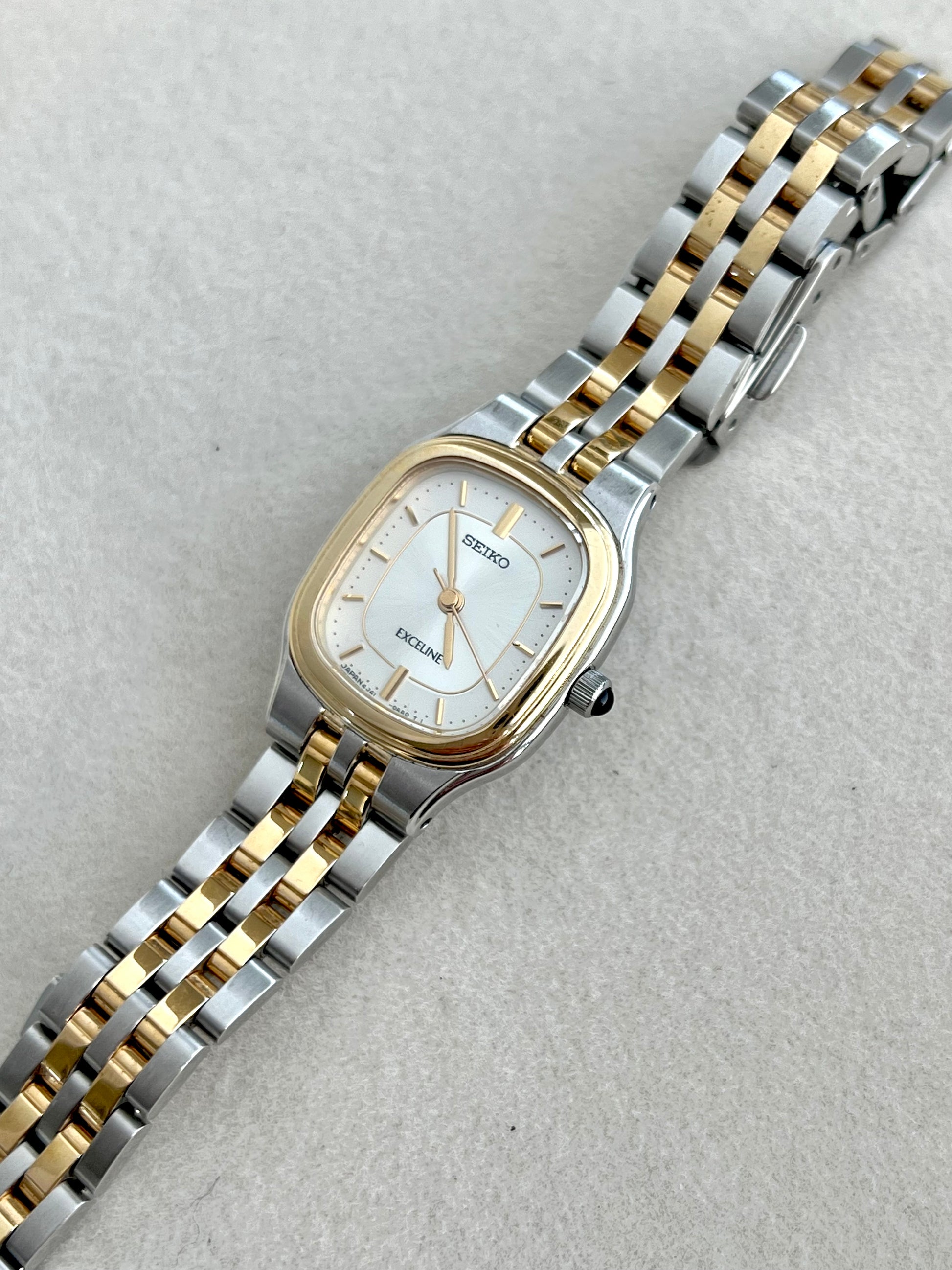 This Seiko Exceline embodies late twentieth century Japanese design at its most refined. The softly contoured cushion case and warm gold tone bezel create a jewellery led silhouette that feels intentional and balanced, never ornamental. Its proportions are elegant and wearable, designed to sit naturally on the wrist.