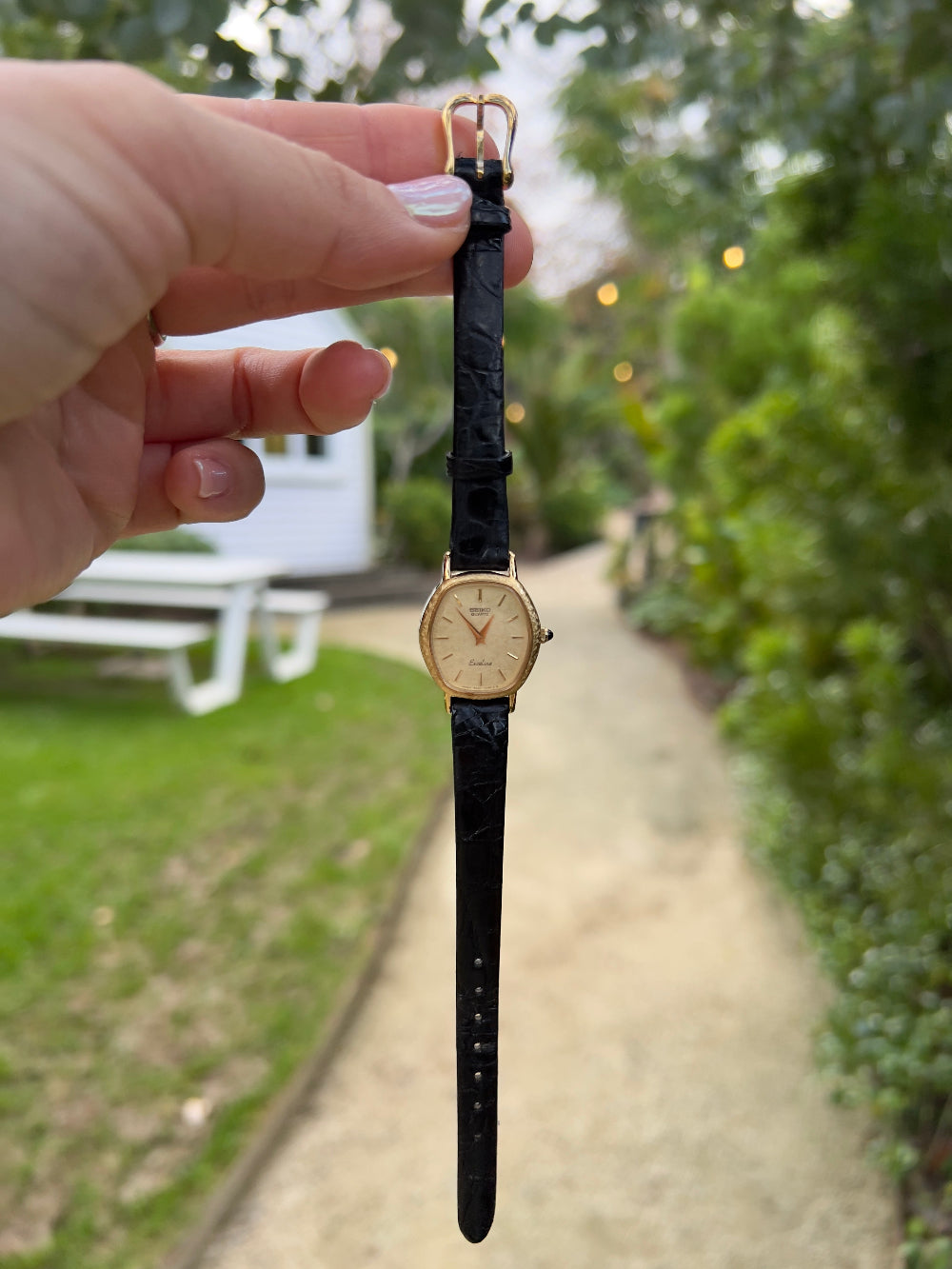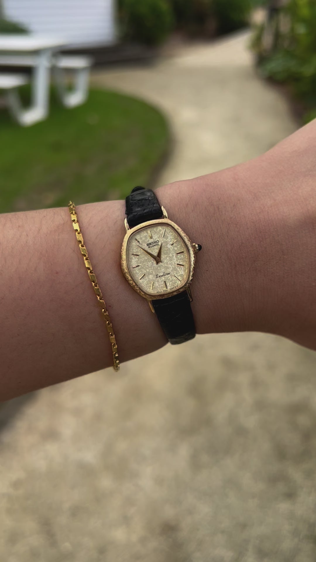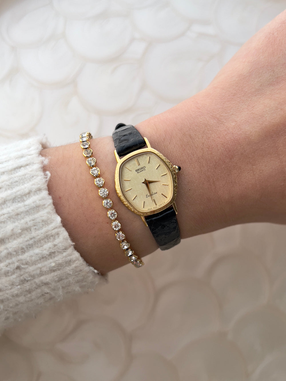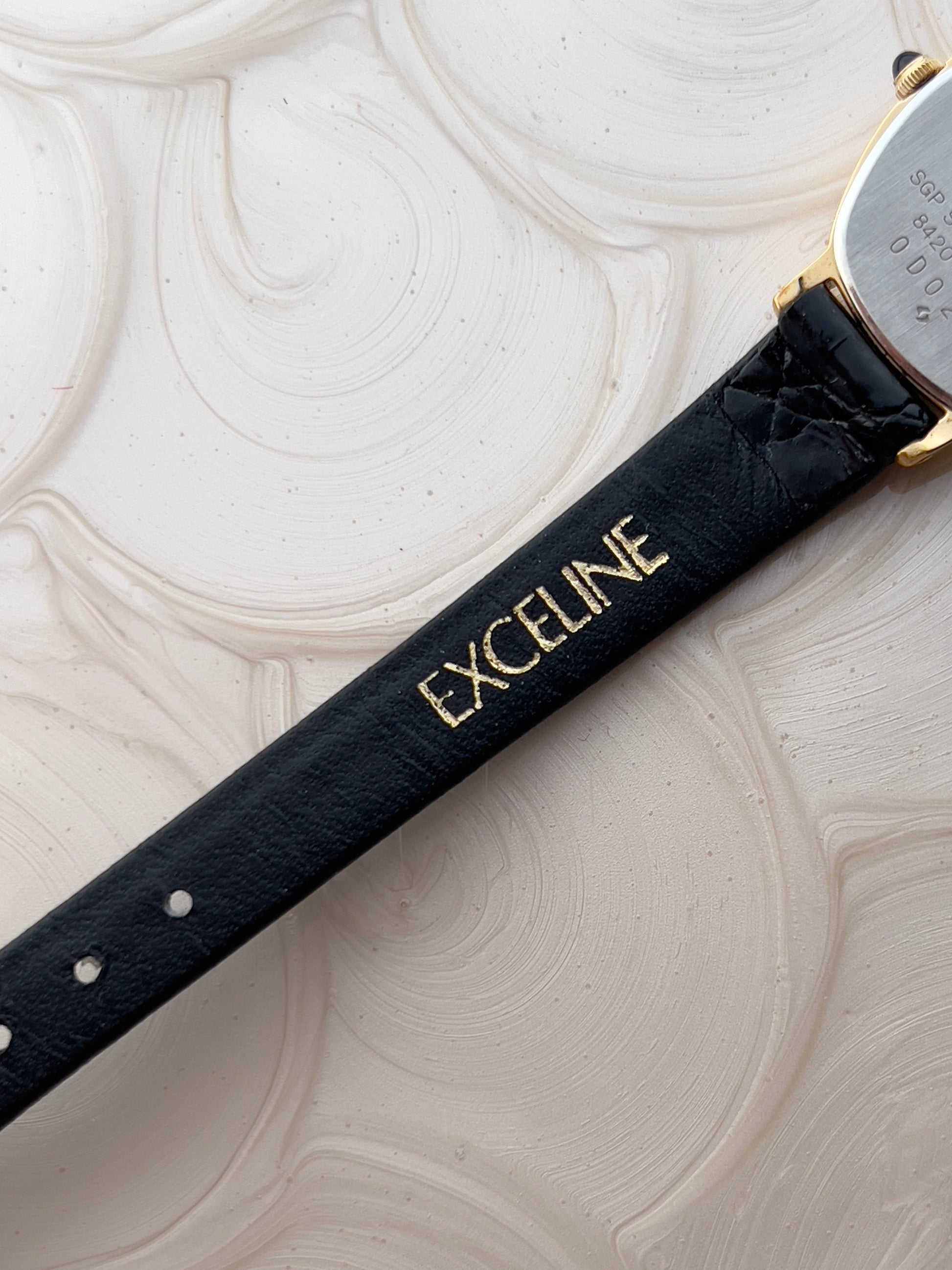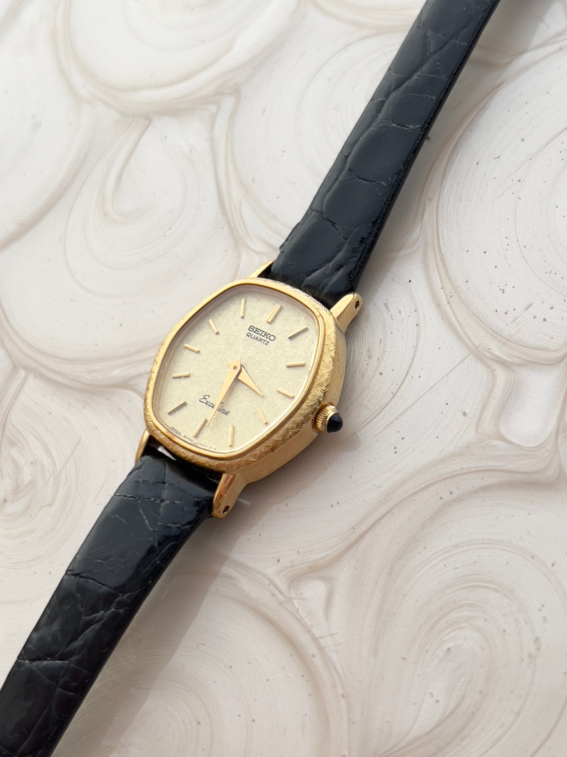 This vintage Seiko Excelline ladies’ watch is a graceful expression of refined Japanese design from the golden era of timepieces. The softly contoured tonneau case, finished in a warm gold tone, encases a minimal stardust champagne dial with fine baton indices and slender hands hallmarks of understated luxury. Topped off with a black stone on the crown, this piece can be proudly worn on the wrist.