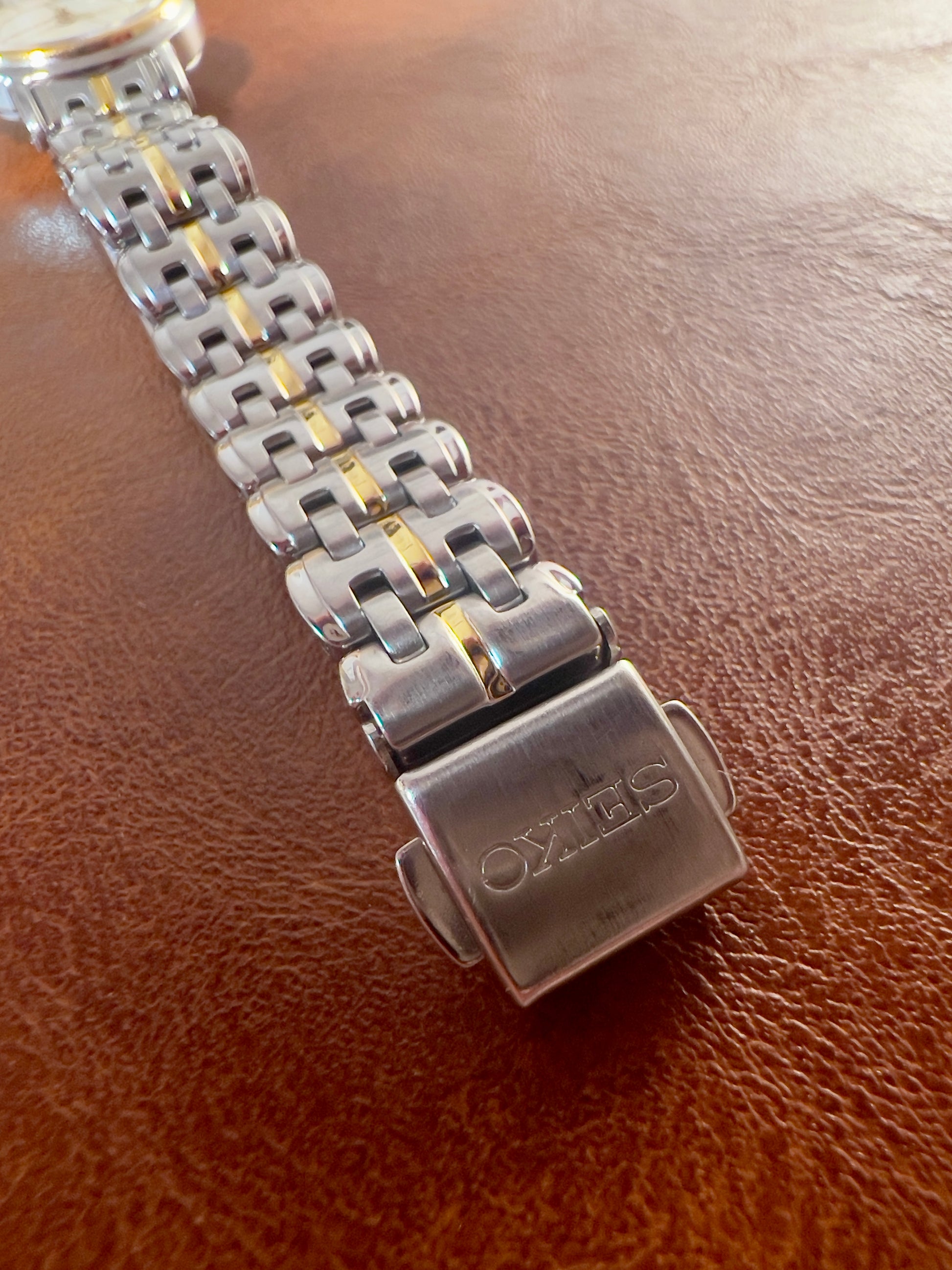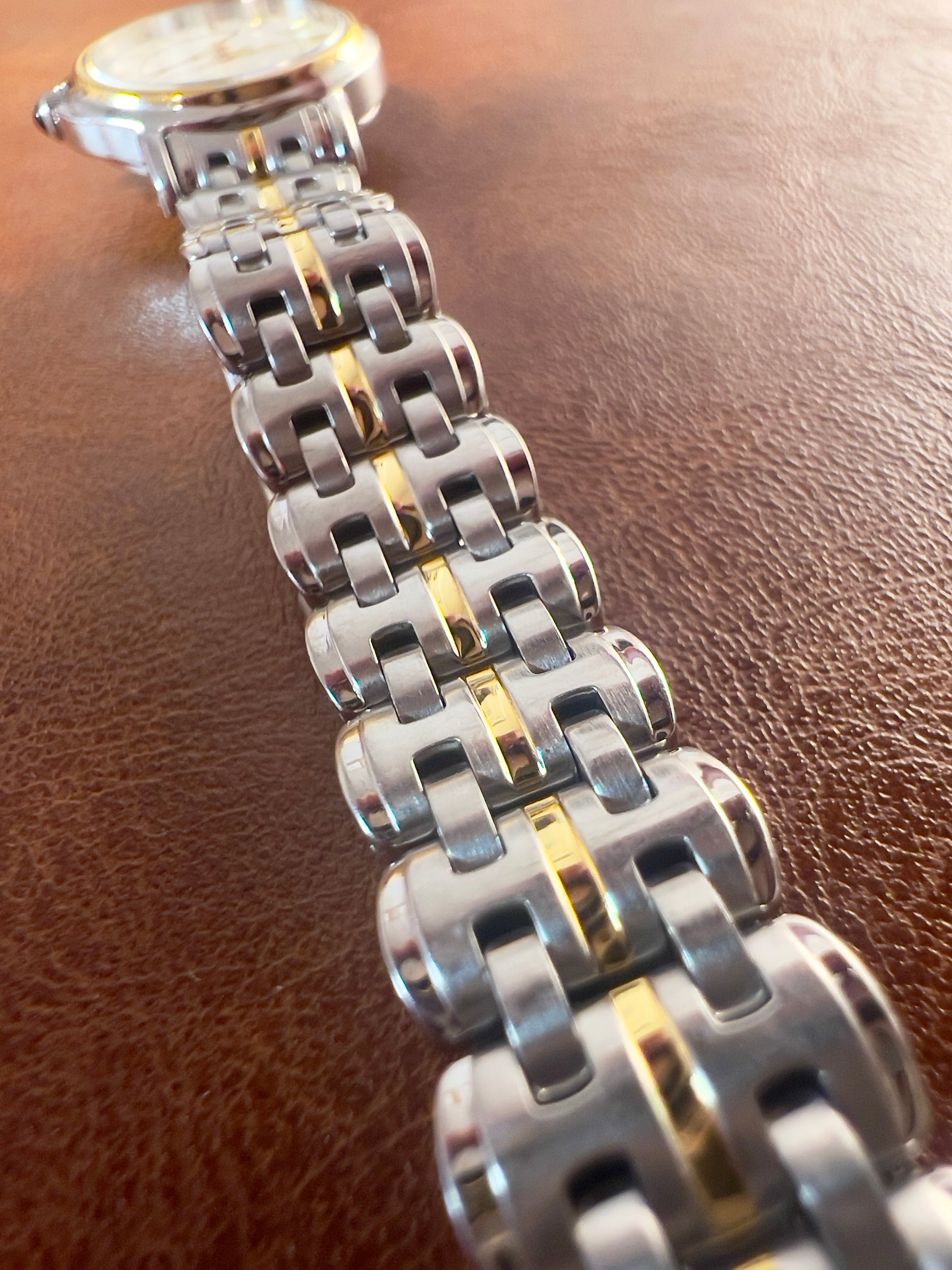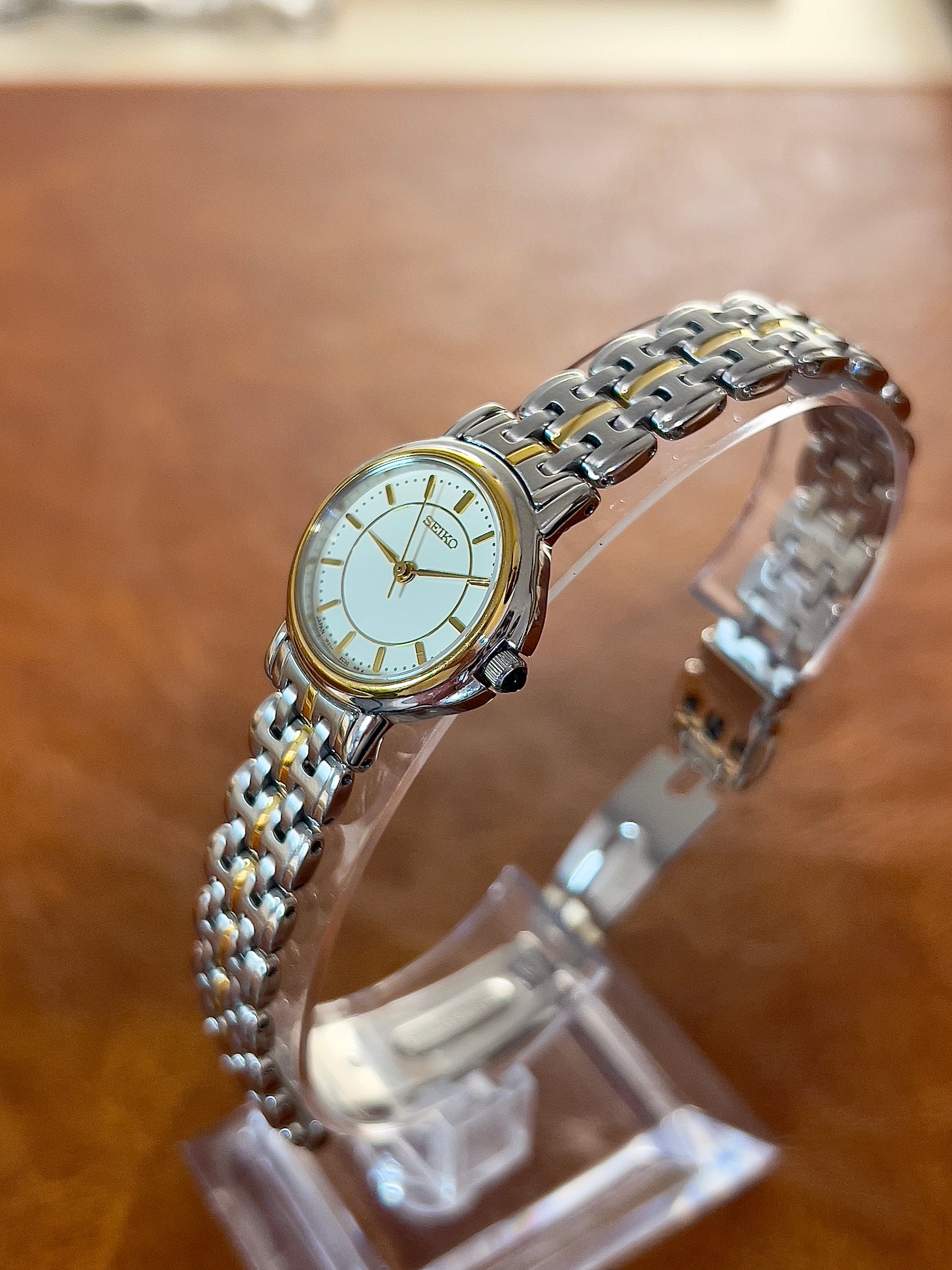 A graceful blend of bygone era charm and modern minimalism, this Seiko ladies’ watch is the embodiment of quiet elegance. Its petite round case features a soft ivory dial with minimalist golden accents delicately punctuated with a dot-and-stick hour index and slender golden hands. The two-tone bracelet, with its brushed steel and polished gold-tone centre links, completes the sophisticated silhouette with ease.