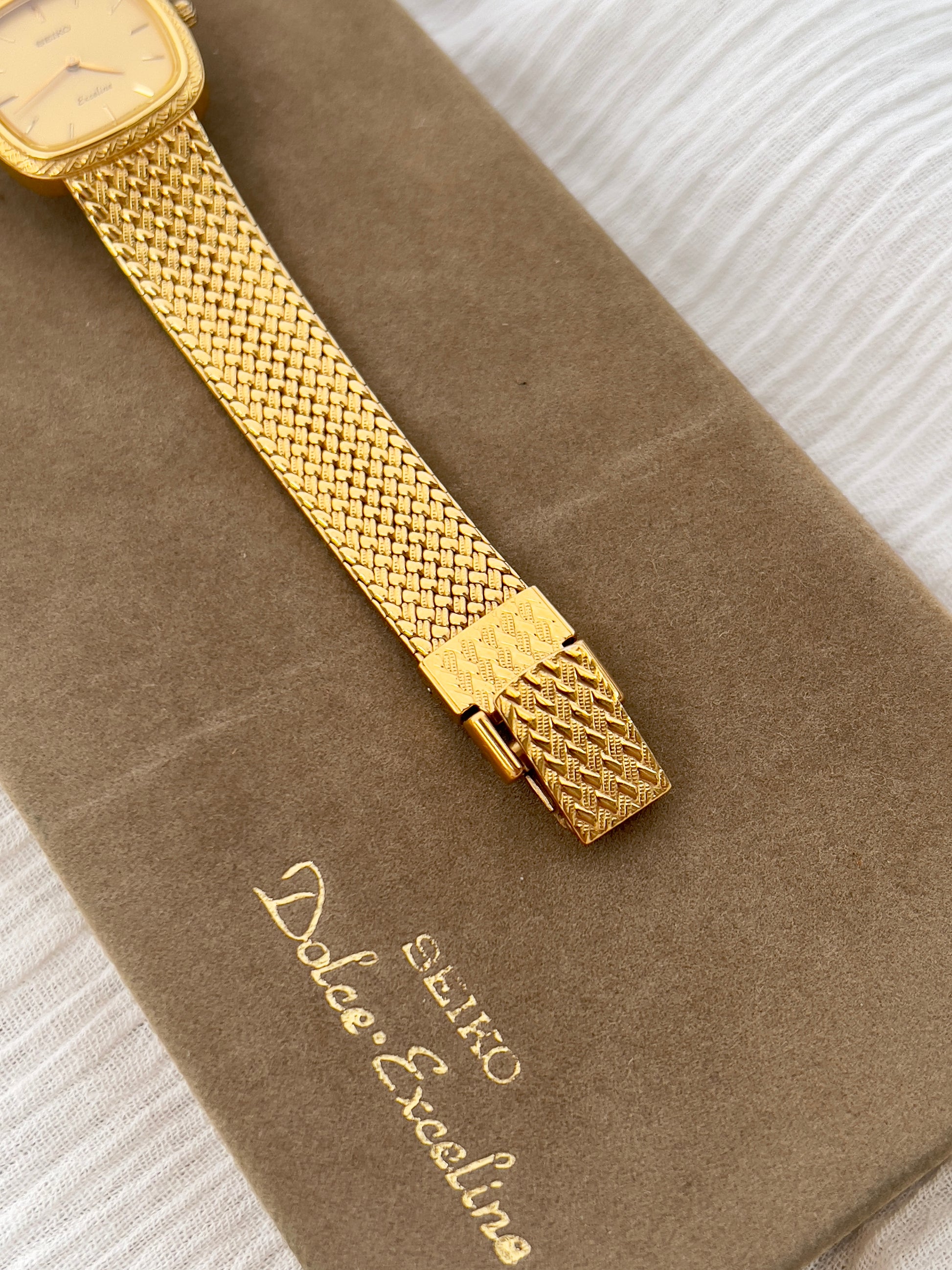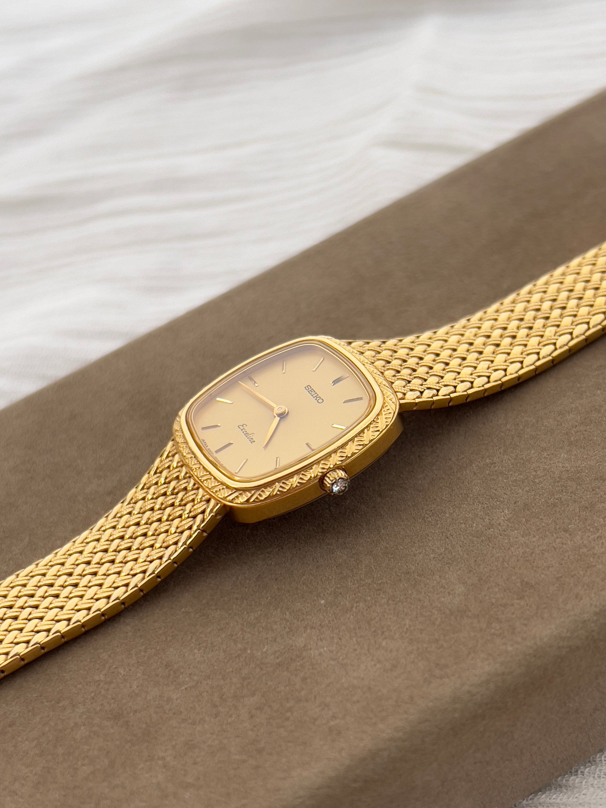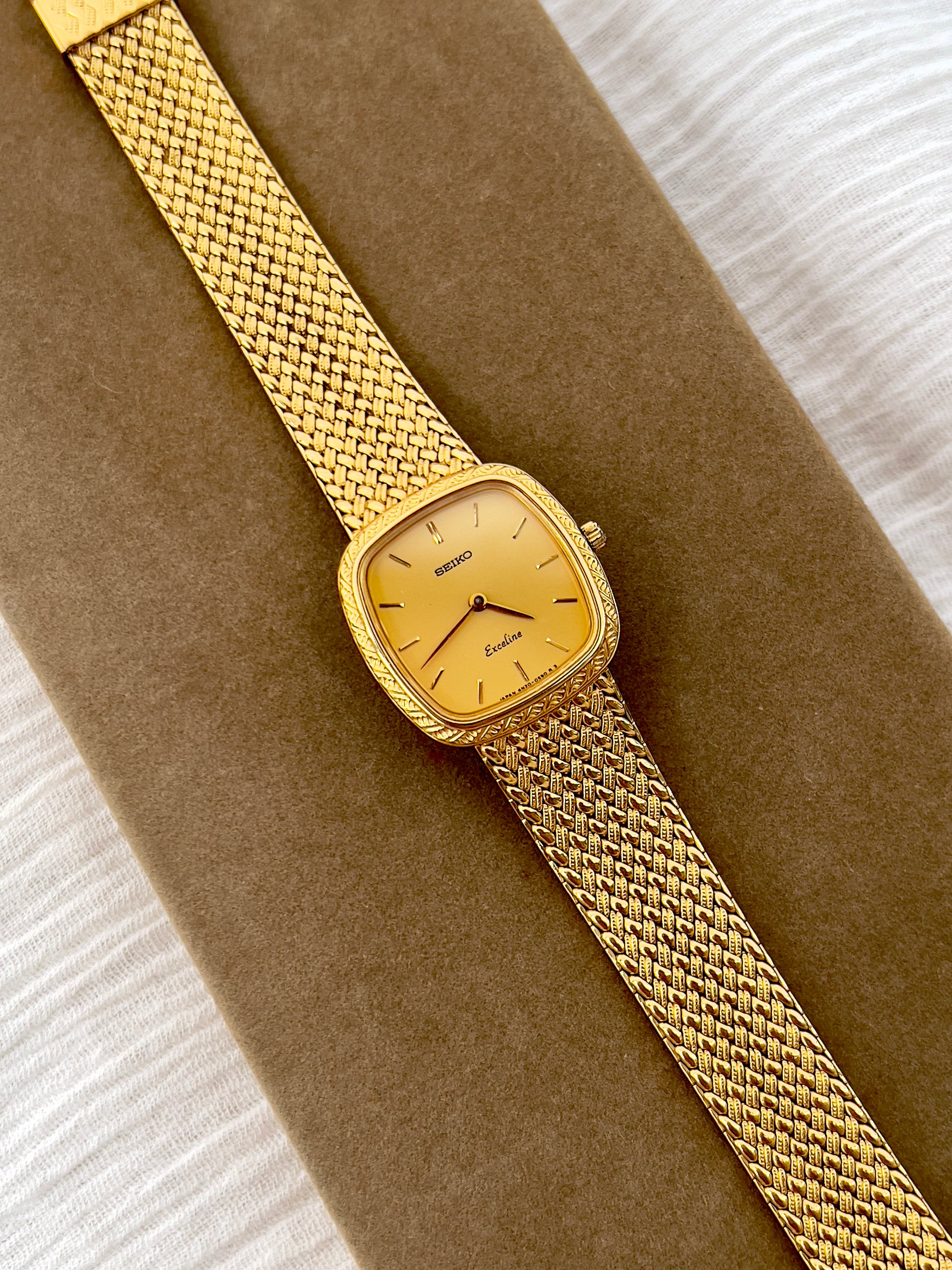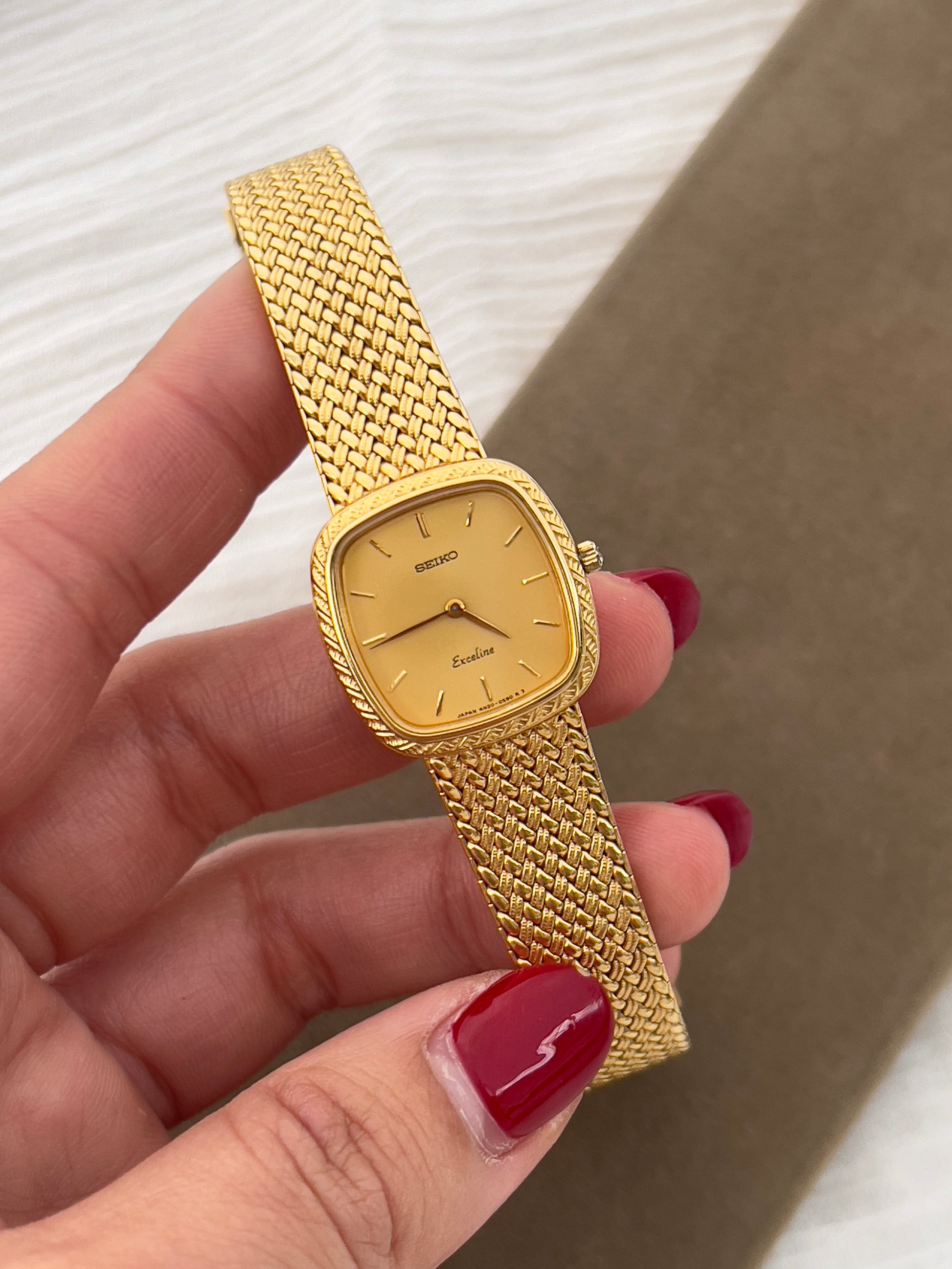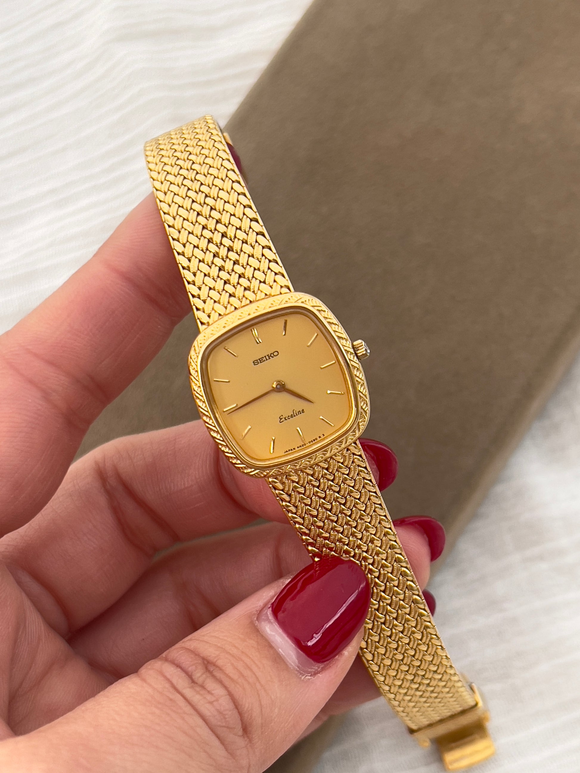 Embrace timeless elegance with this exquisite vintage Seiko Exceline ladies watch, crafted in a radiant gold-tone finish. Featuring a finely woven mesh bracelet and a soft square case with textured bezel, this piece epitomizes refined femininity. A subtle yet luxurious detail: a diamond-set crown, adding a discreet touch of sparkle that elevates its sophistication. The details on this Seiko square watch is absolutely majestic.