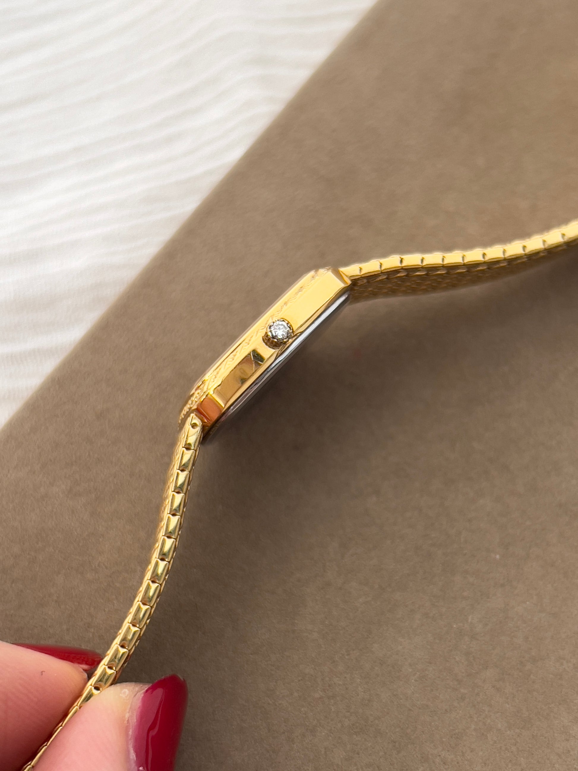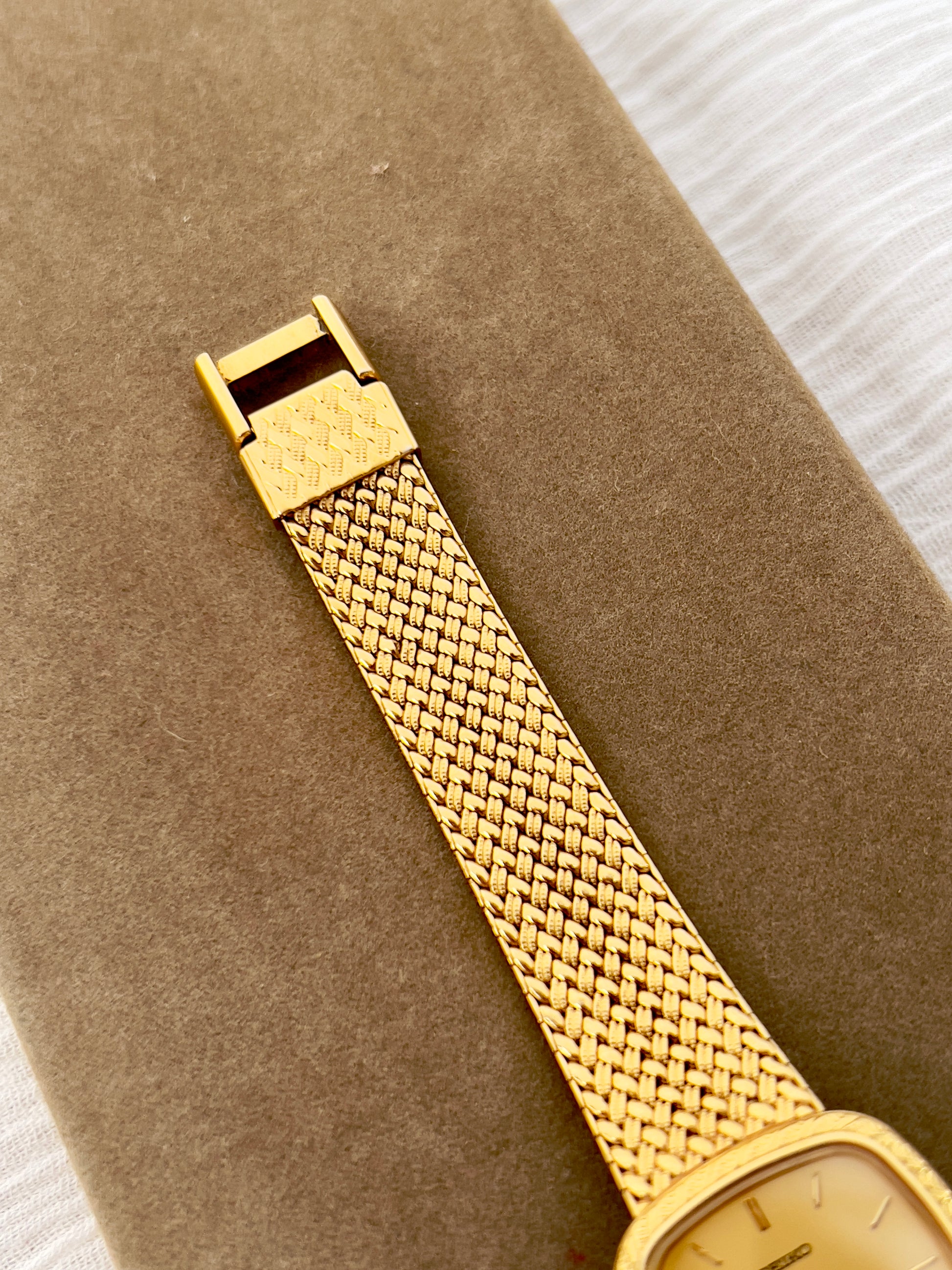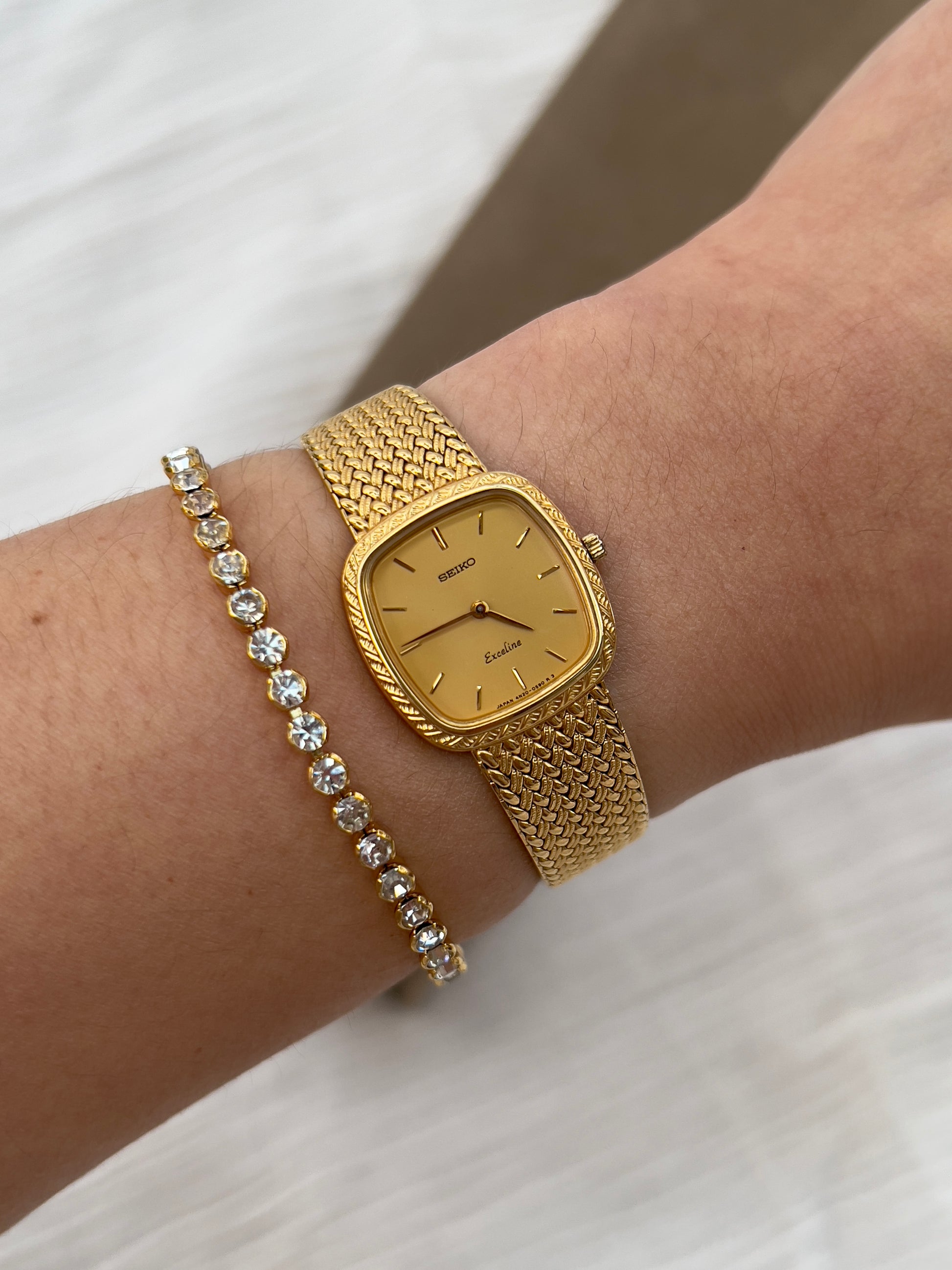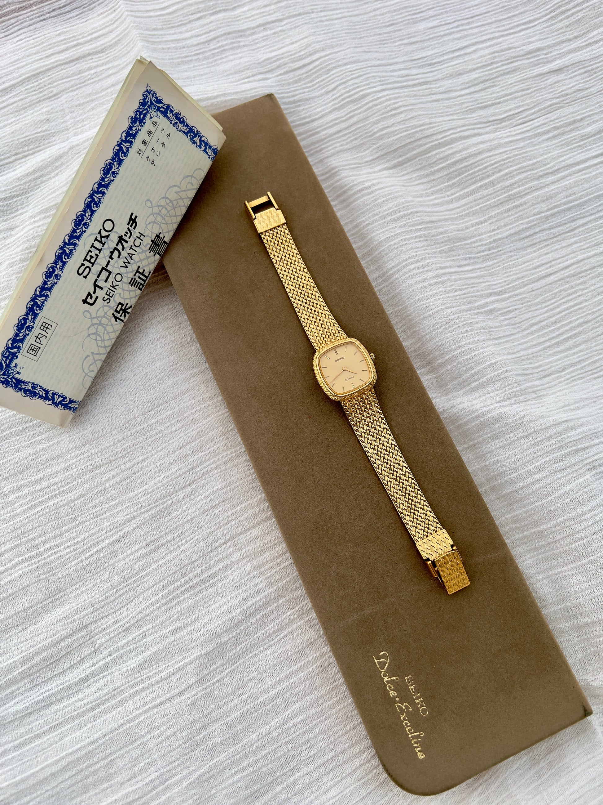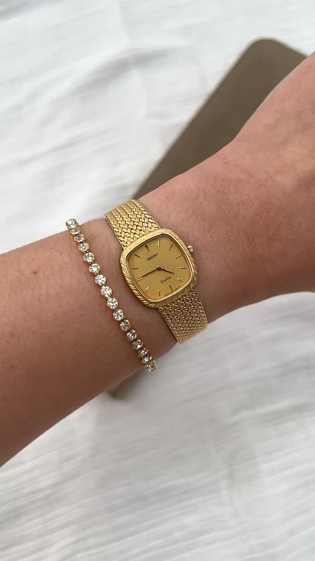 Embrace timeless elegance with this exquisite vintage Seiko Exceline ladies watch, crafted in a radiant gold-tone finish. Featuring a finely woven mesh bracelet and a soft square case with textured bezel, this piece epitomizes refined femininity. A subtle yet luxurious detail: a diamond-set crown, adding a discreet touch of sparkle that elevates its sophistication. The details on this Seiko square watch is absolutely majestic.