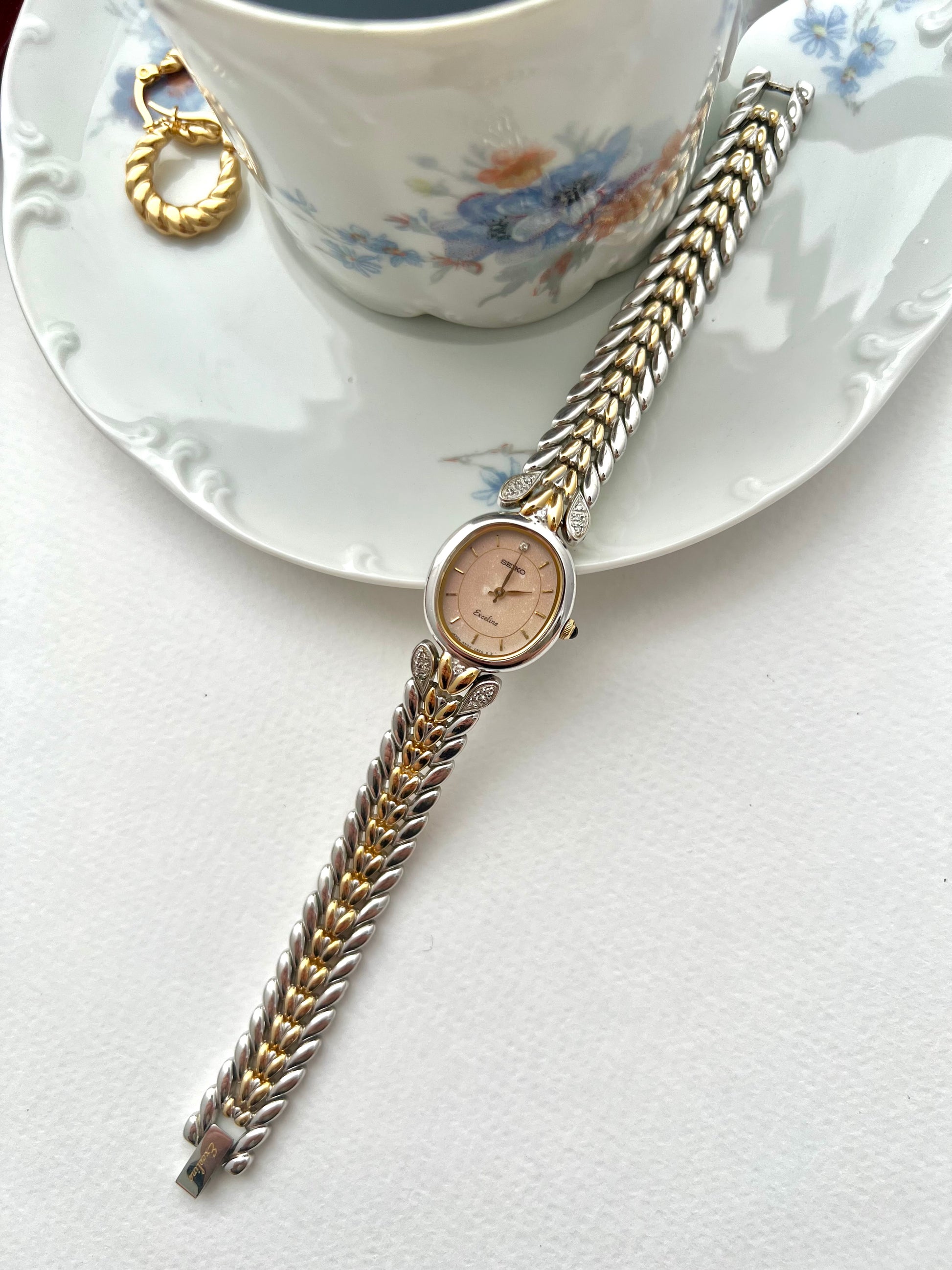 An ode to softness and shimmer. Champagne tones meet polished two tone metal, diamonds accentuate the lugs, and the oval silhouette gives it the grace of fine jewellery.