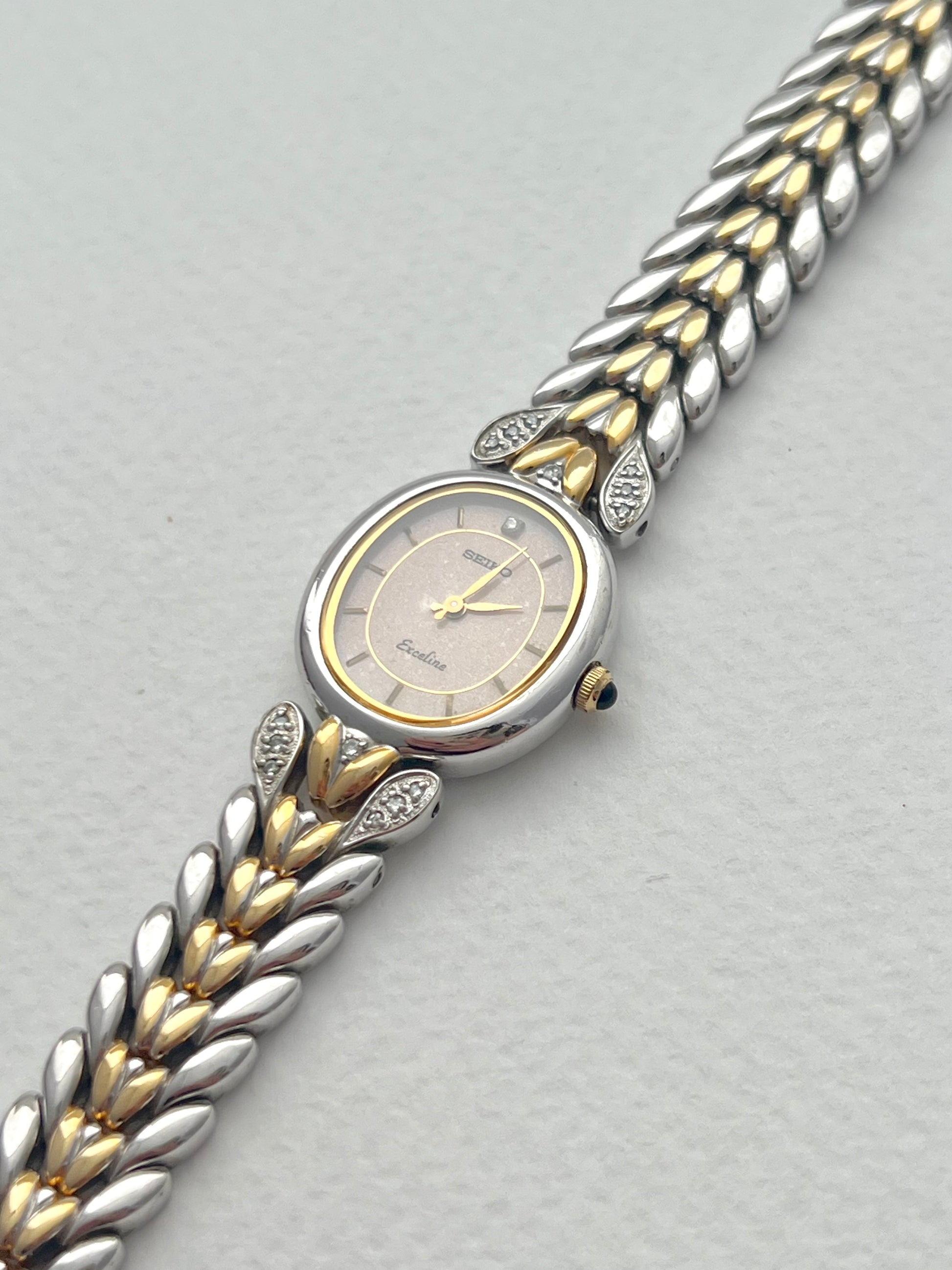 Seiko Exceline Ladies Oval Watch with Stardust Salmon Dial and Diamond Leaf Bracelet