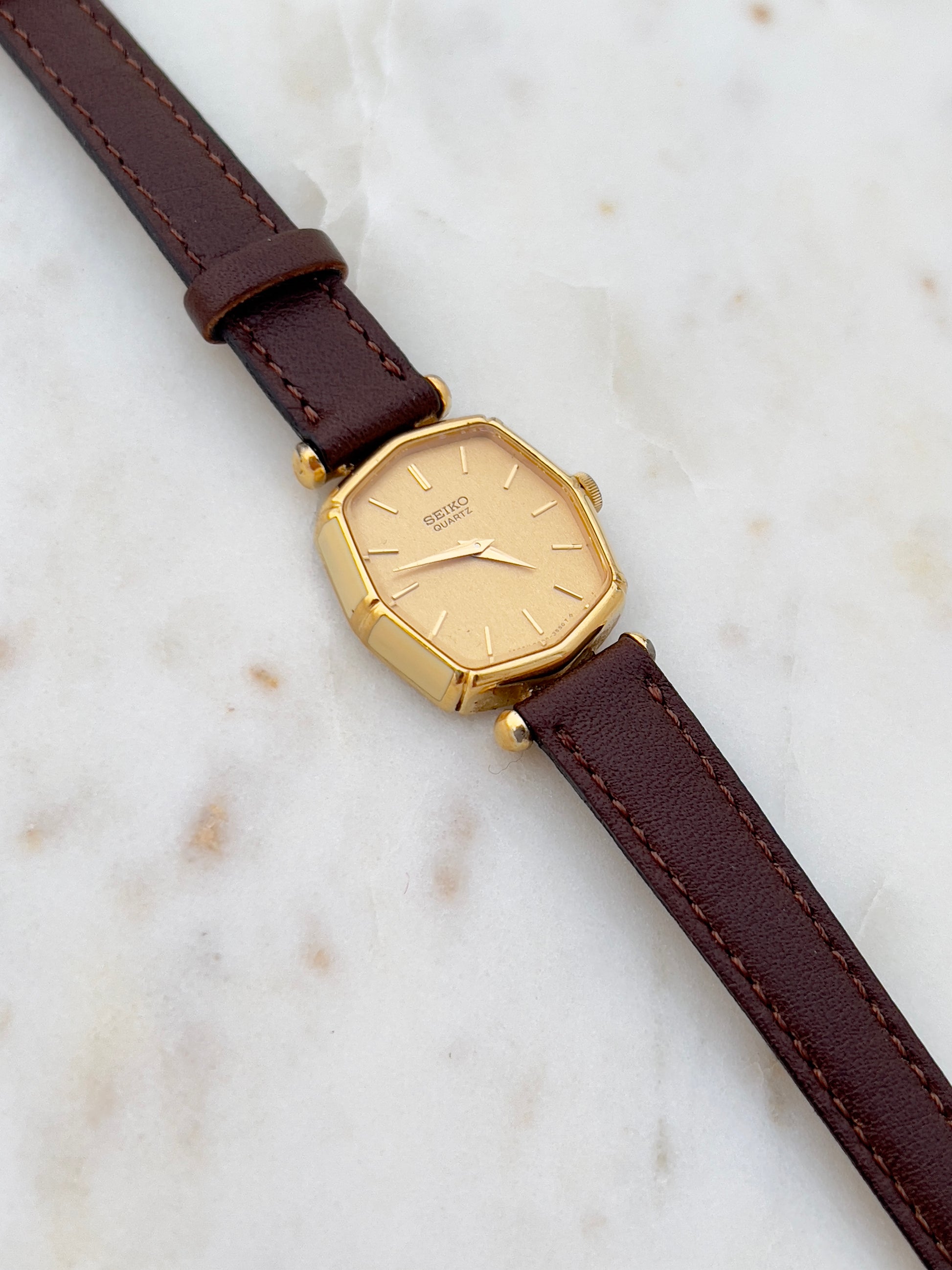 Finished with a rich brown strap that enhances the case’s warmth, this watch captures the essence of understated sophistication. A versatile choice for both everyday refinement and graceful occasion wear, powered by a reliable Seiko quartz movement.
