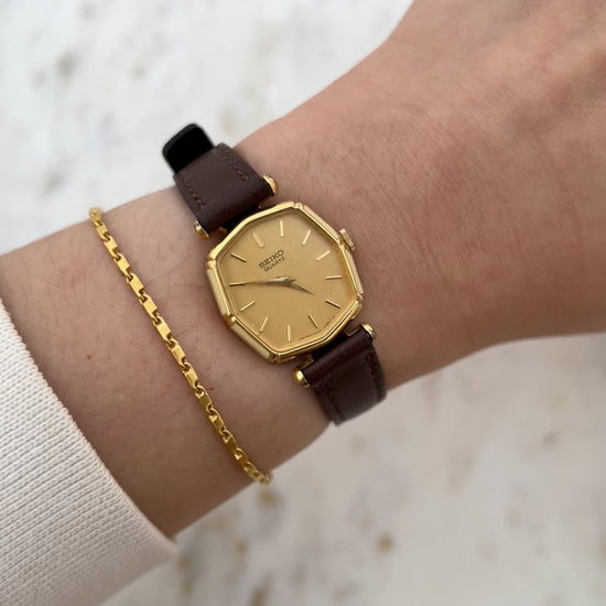 A subtle study in elegance, this Seiko timepiece blends geometric precision with a refined warmth. The gold tone cushion case features an uncommon faceted silhouette, where crisp edges are softened by smooth enamel-style white corner accents, adding quiet contrast and a hint of architectural flair. The dust champagne dial keeps the aesthetic minimal, with fine baton indices and slim gold hands for a clean, uncluttered presence.
