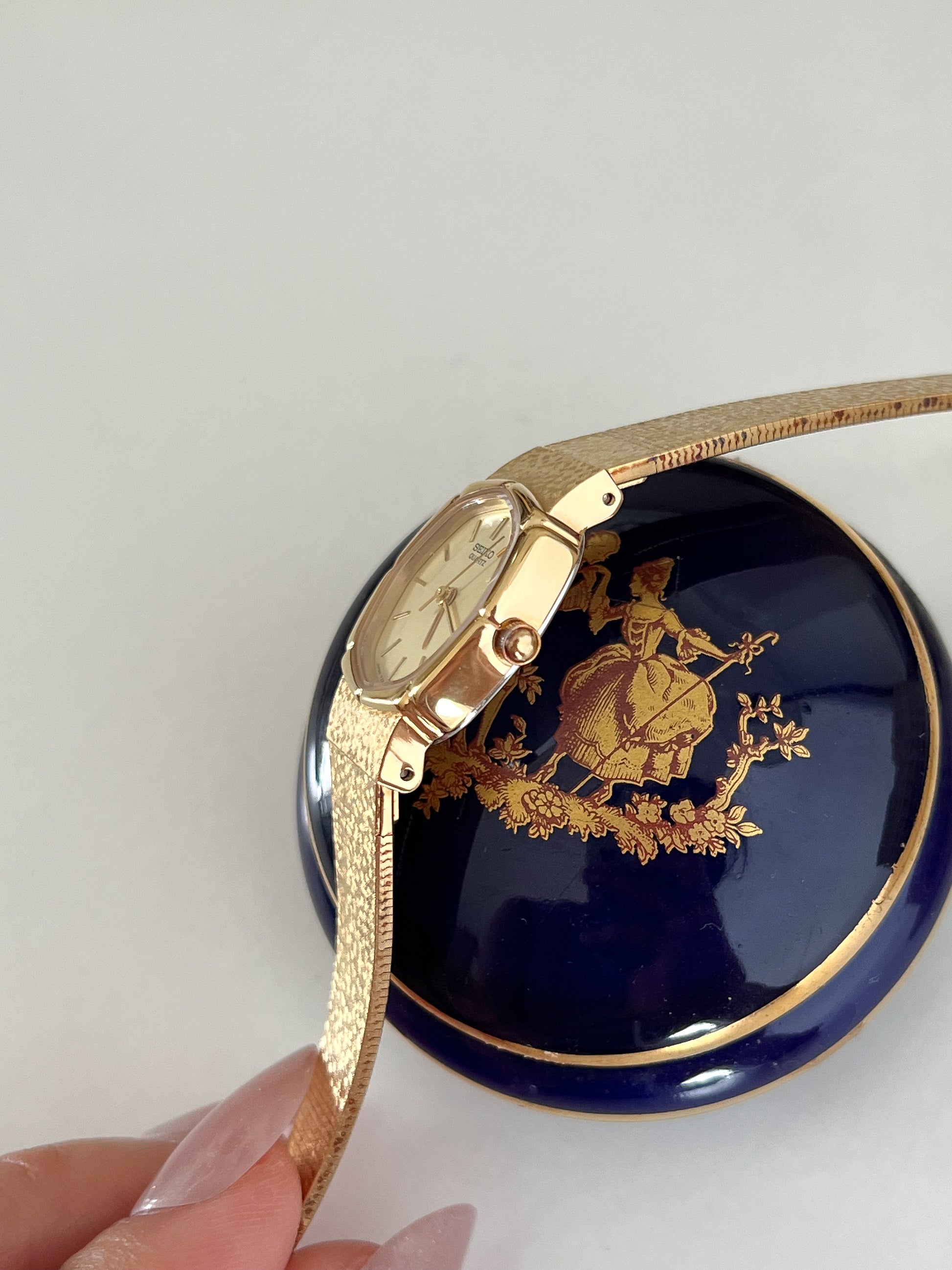 The champagne dial is restrained and deliberate, featuring slim applied baton markers and a clean two-hand quartz layout. Subtle surface texture catches the light softly, reinforcing Seiko’s quiet design language of the era, timeless, purposeful, and composed. A piece that lives comfortably between watch and jewellery, ideal for those drawn to understated luxury and enduring vintage style.