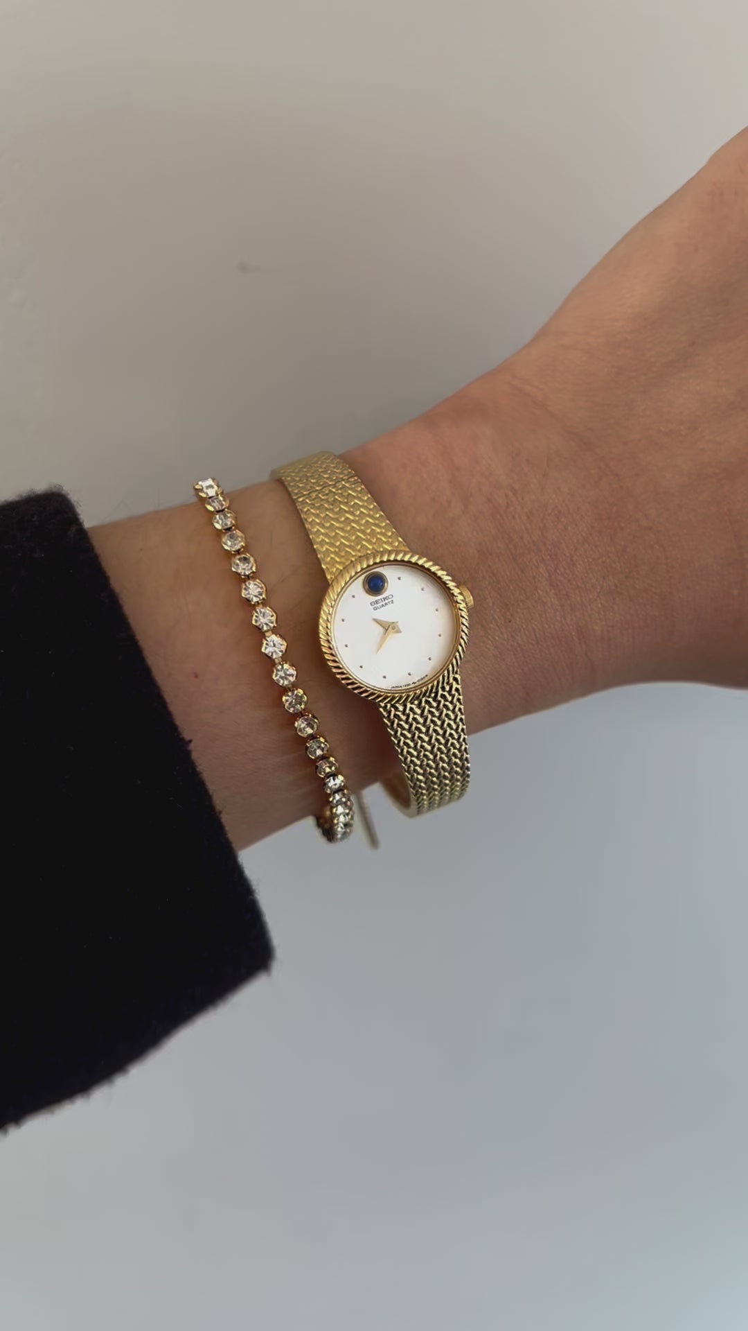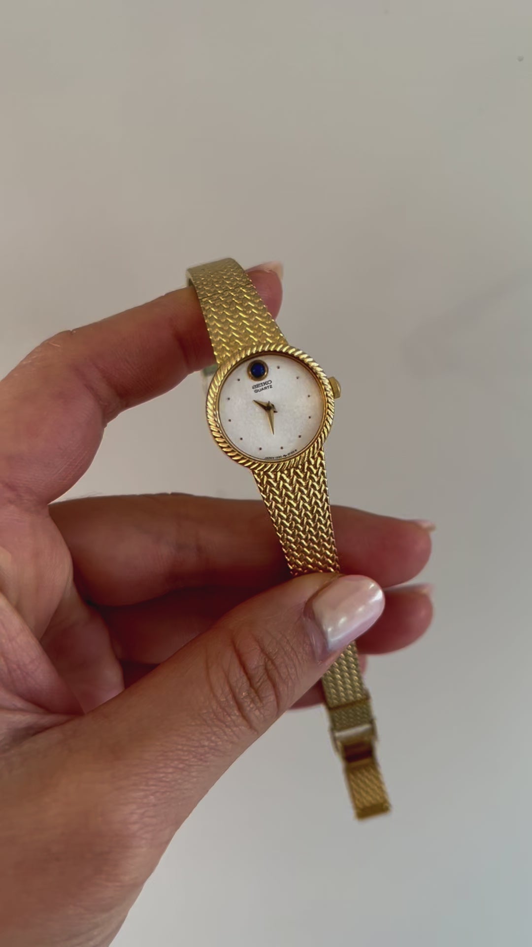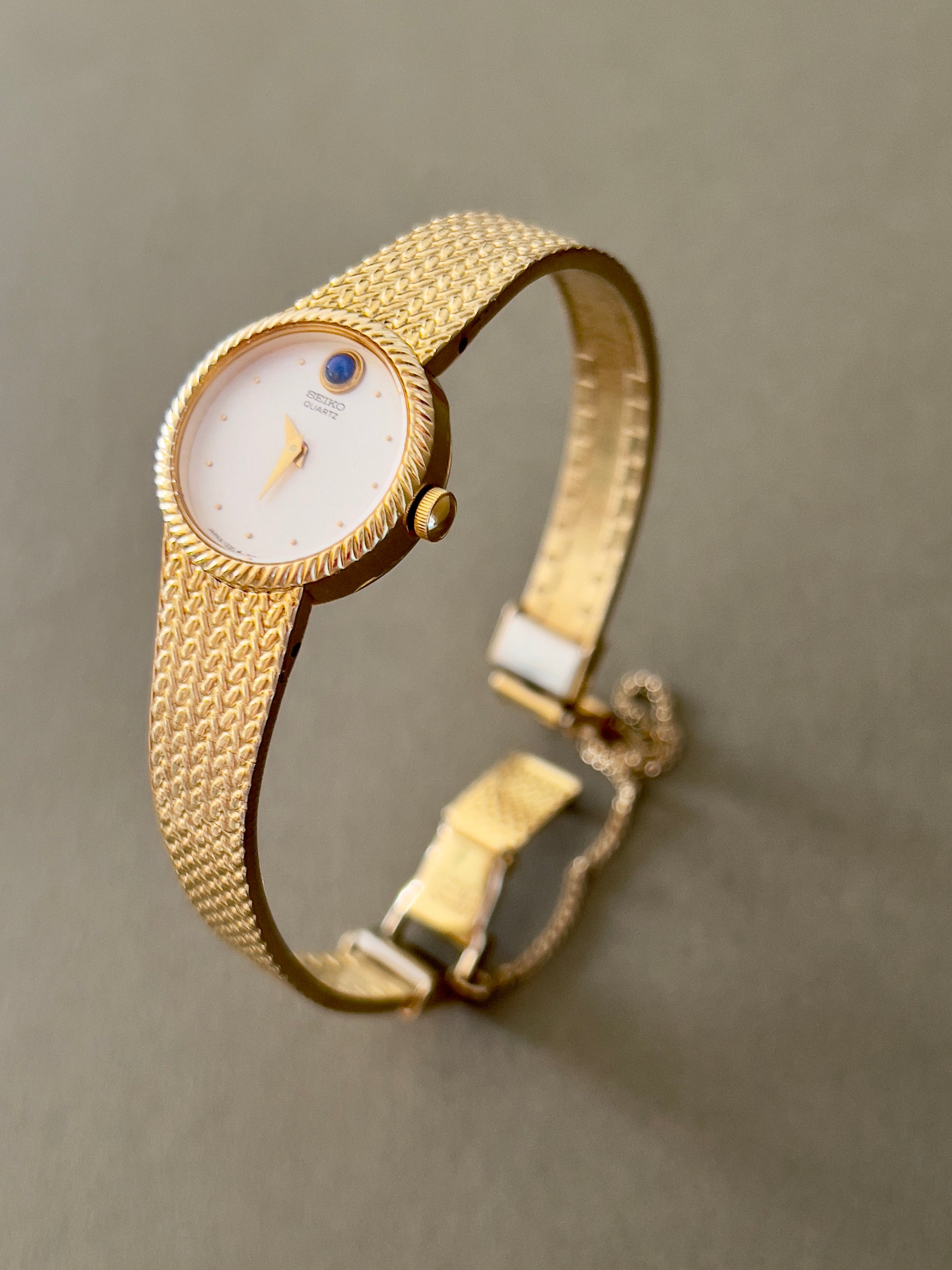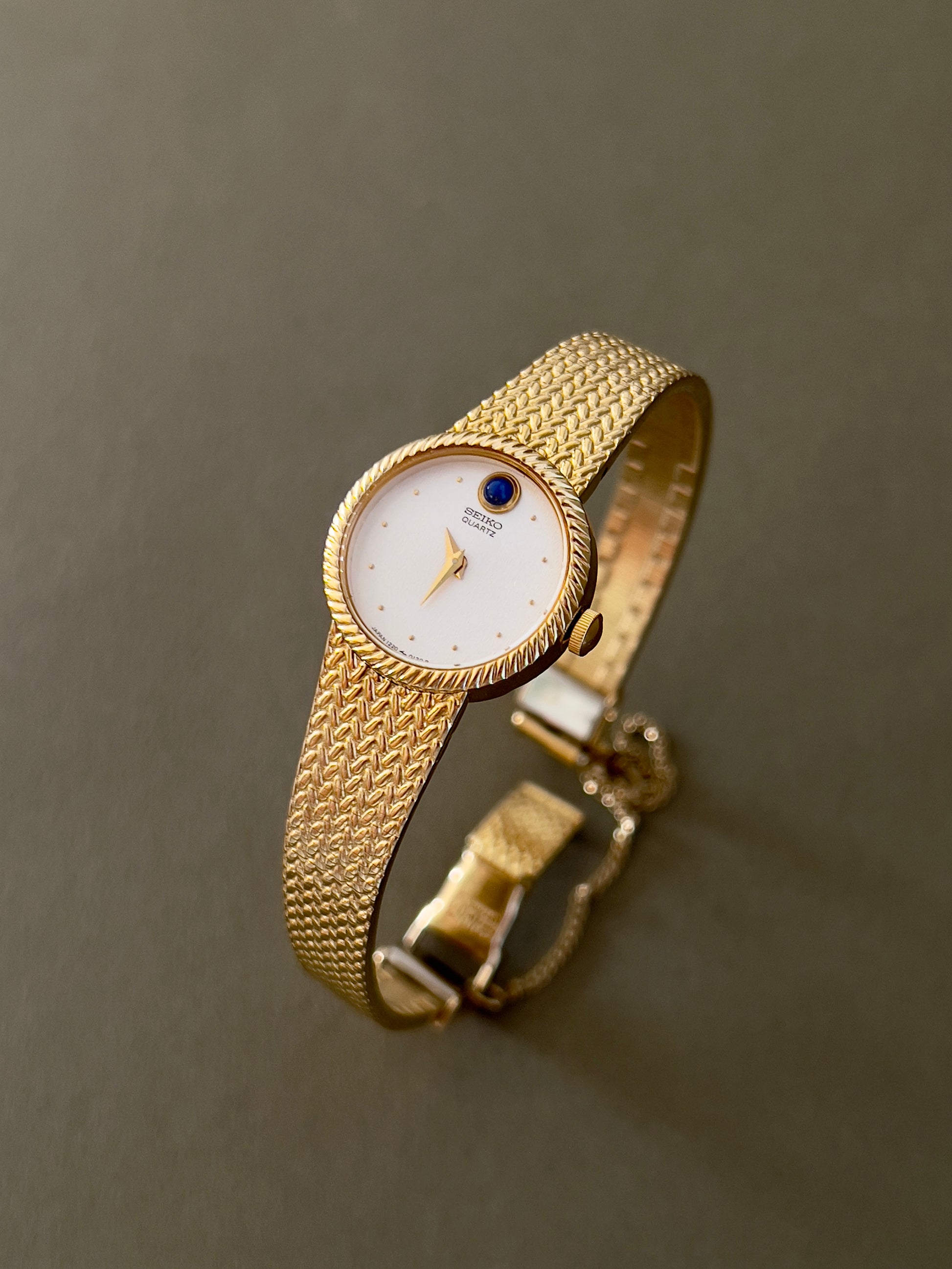 Delicate yet undeniably refined, this vintage Seiko dress watch captures the quiet luxury of post-modernist design. Its soft rectangular case is finished in warm gold tone, framing a velvety cream dial adorned with slender gold hour markers and dauphine hands. At 12 o’clock, a polished blue cabochon glows like a fine jewel, an elegant touch that elevates the entire piece.