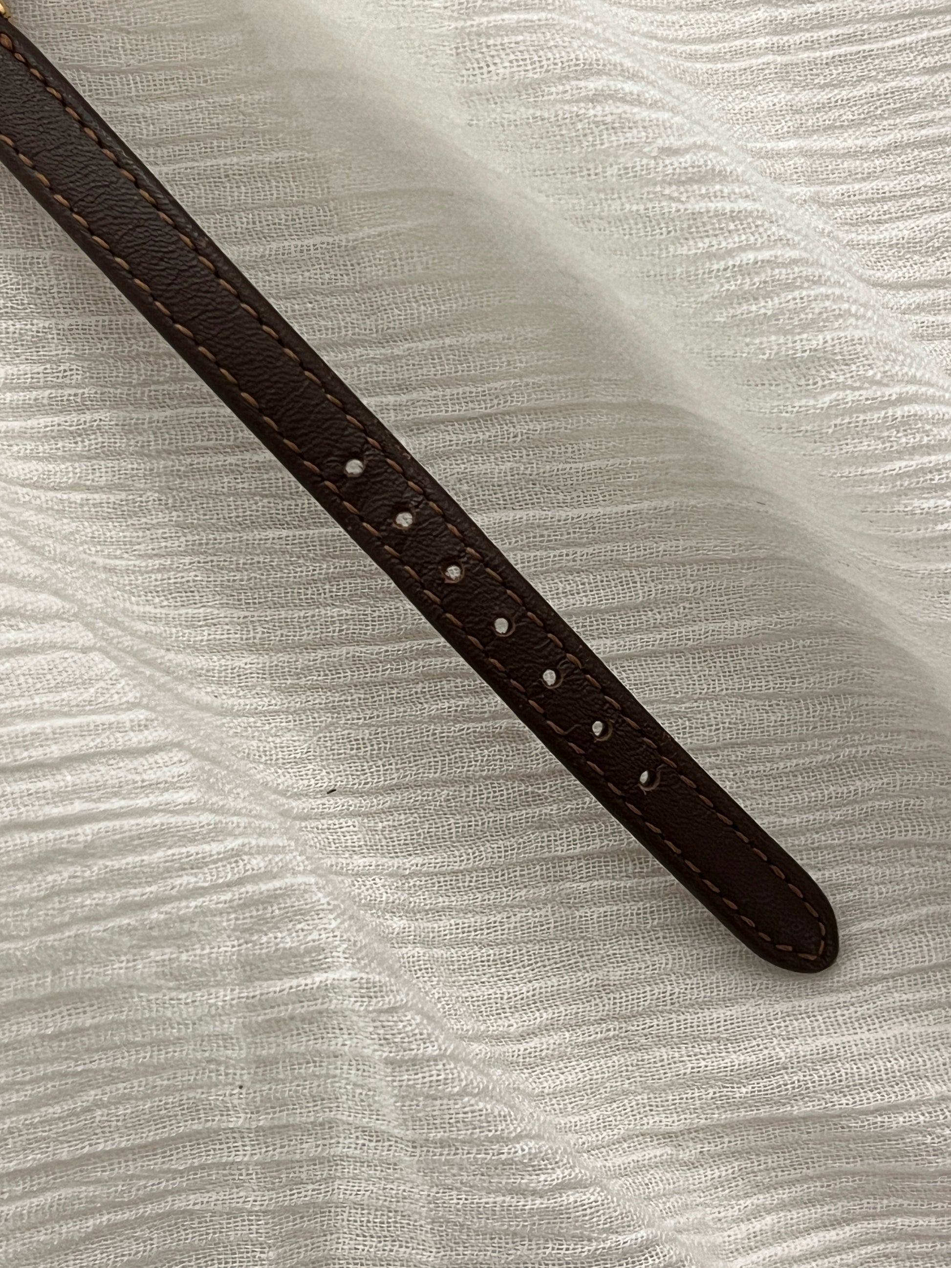 Refined and full of vintage charm, this Seiko ladies’ watch is a study in subtle sophistication. Featuring a champagne-toned dial with minimalist gold-tone markers, it is framed by a gently rounded hexagonal gold-tone case that lends a unique, elegant silhouette. Paired with a rich brown leather strap accented by matching stitching, this piece offers an effortless balance between classic and distinctive, perfect for understated everyday elegance or a polished finishing touch for special occasions.