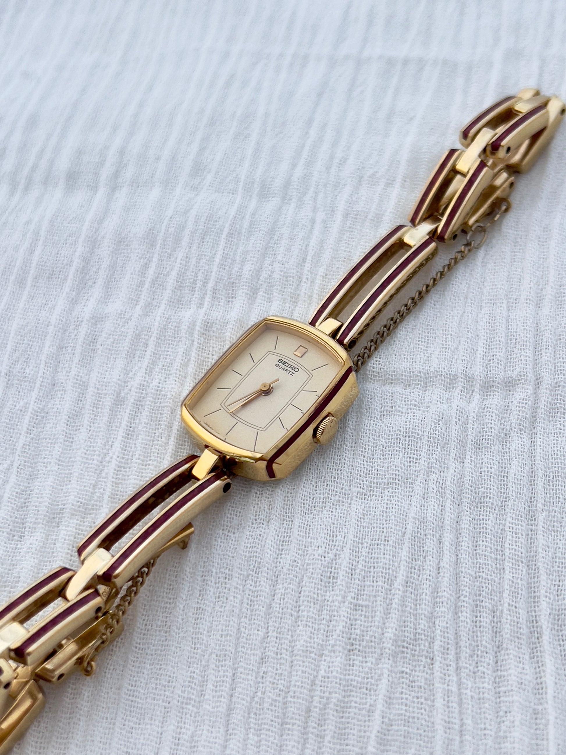 Seiko Ladies Gold Bracelet Watch with Crimson Enamel Accents
