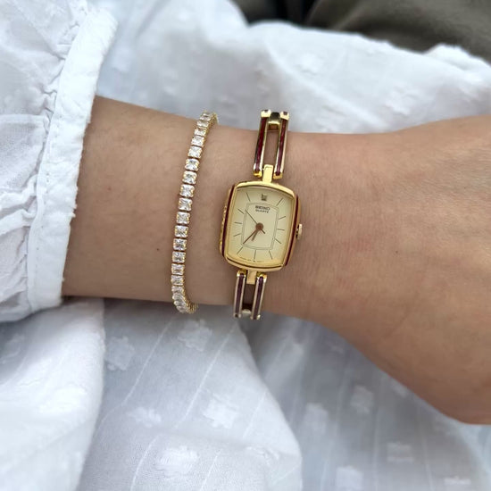 Every curve of its elongated case feels sculpted, from the polished bezel to the twin gold links that flow like fine jewellery. The bracelet wraps softly around the wrist, echoing the hues of ruby and gold in perfect harmony.