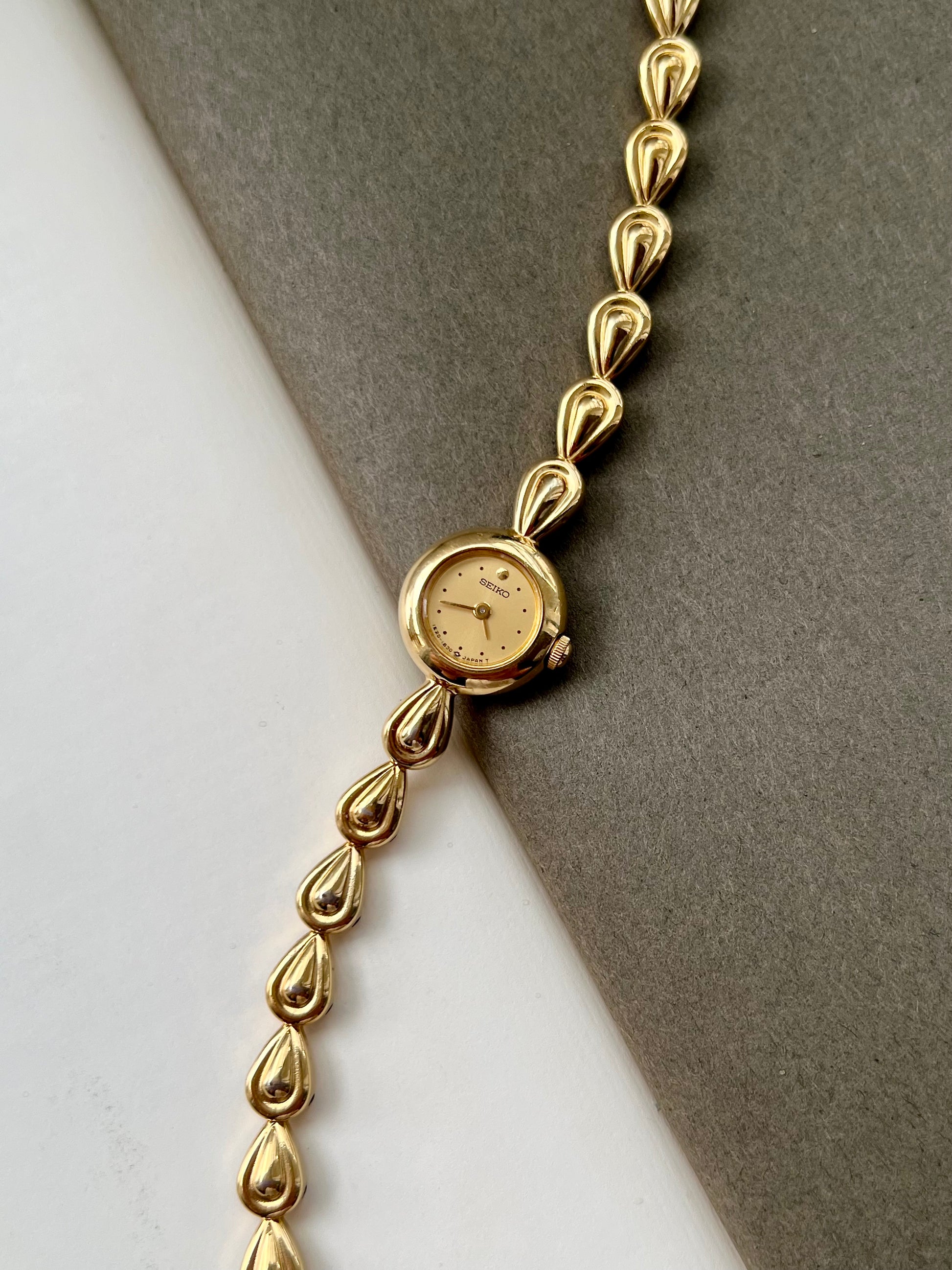 A creation that feels more jewel than timepiece, this Seiko watch drapes along the wrist in a cascade of polished teardrop links that gleam like liquid gold. The round champagne dial rests delicately at the centre, understated and graceful, its minimalist design allowing the sculptural bracelet to command attention.