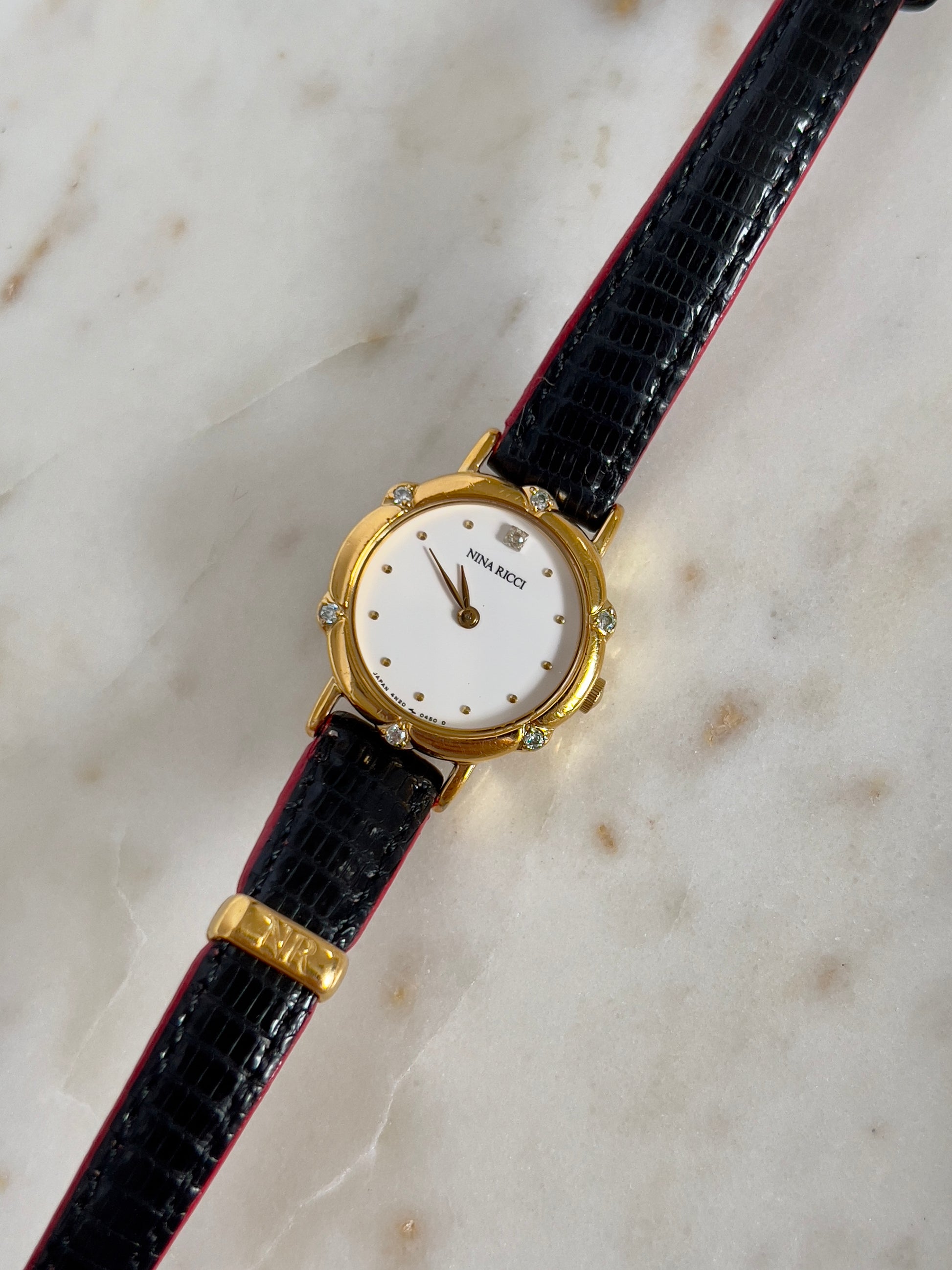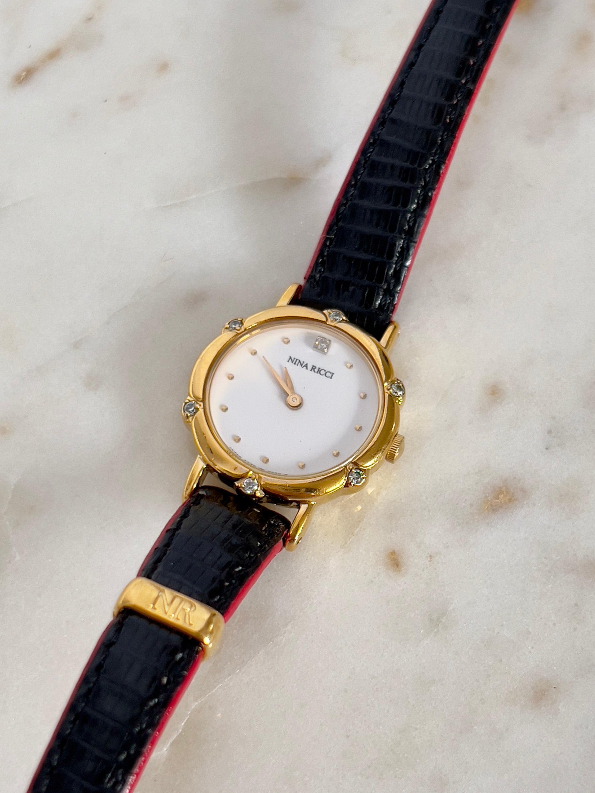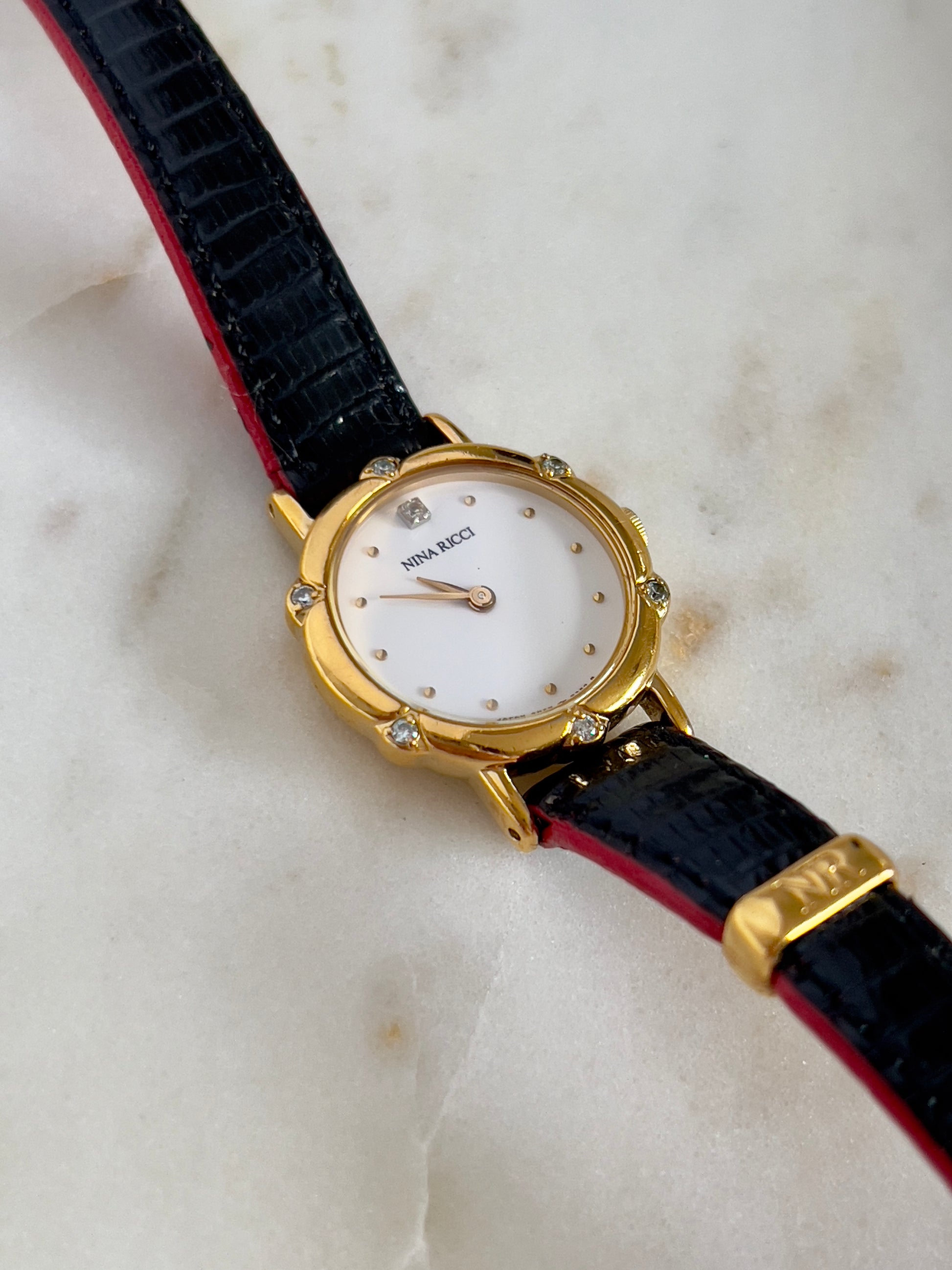 Nina Ricci x Seiko Ladies Vintage Watch – Gold Case, Crystal Accents, Black Leather Strap
