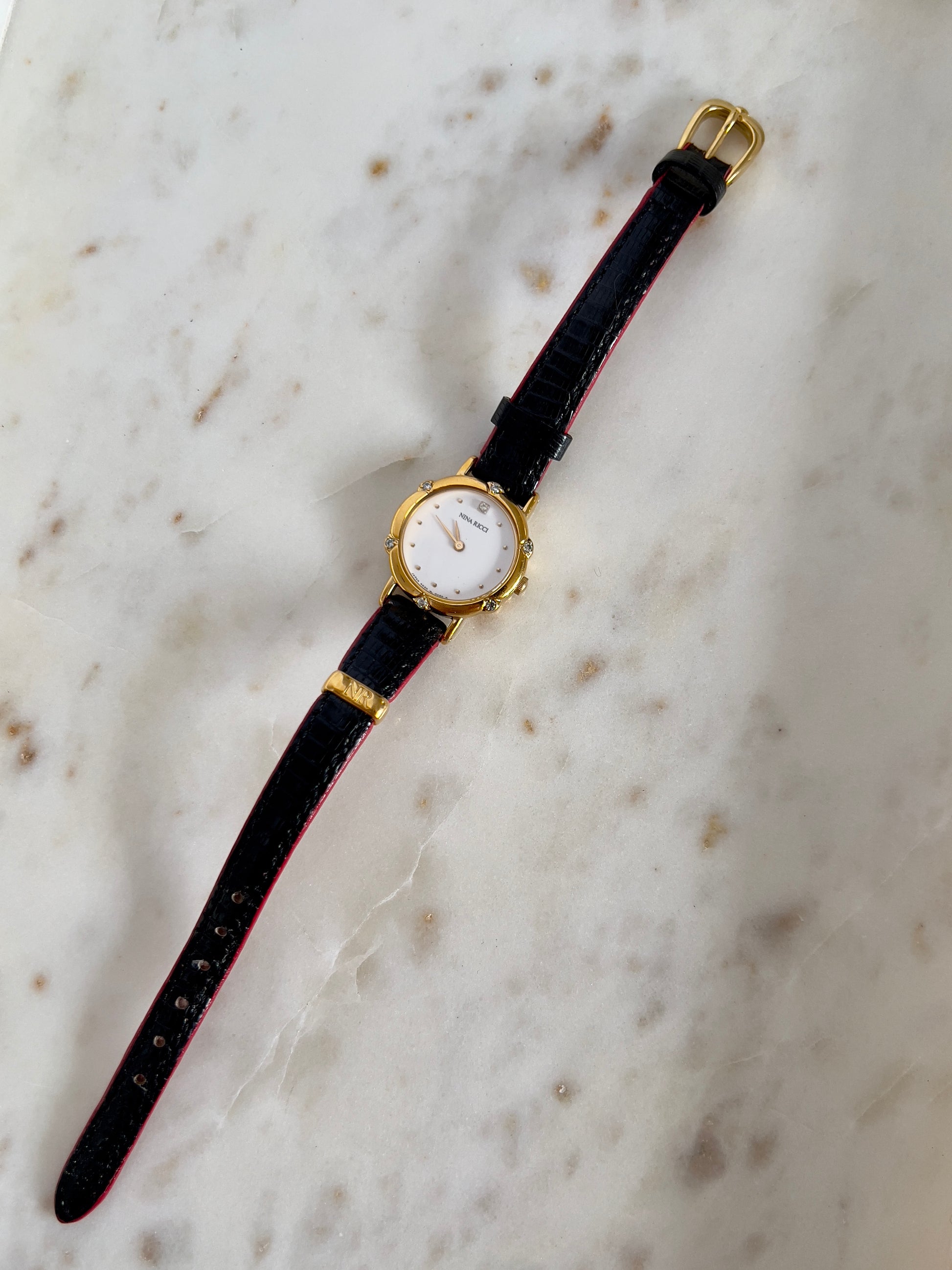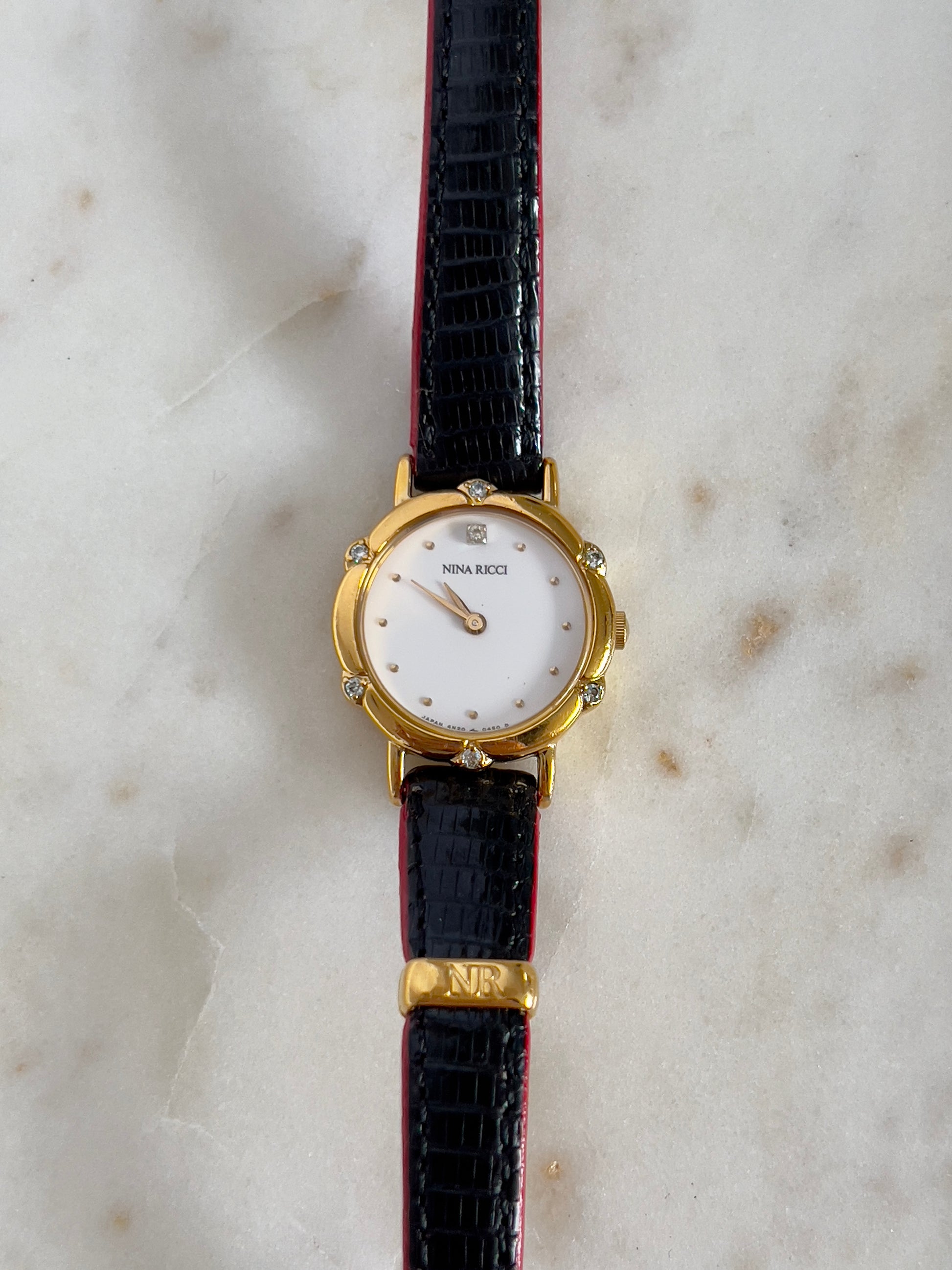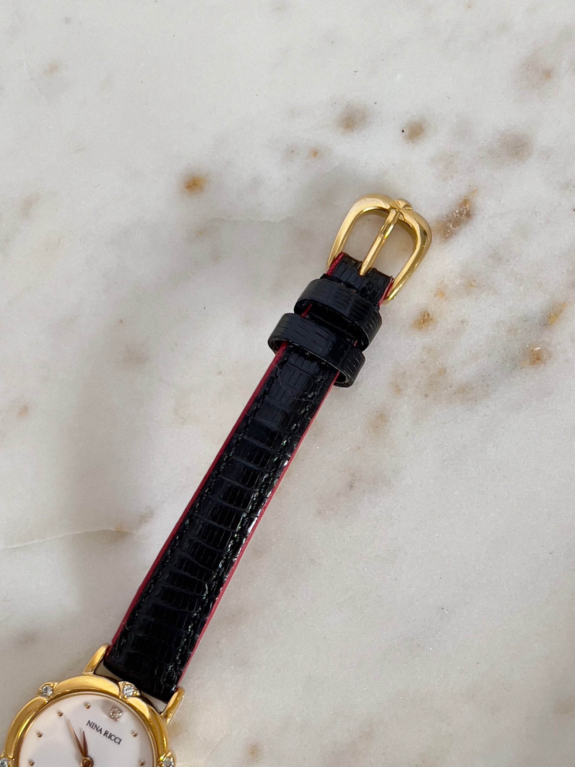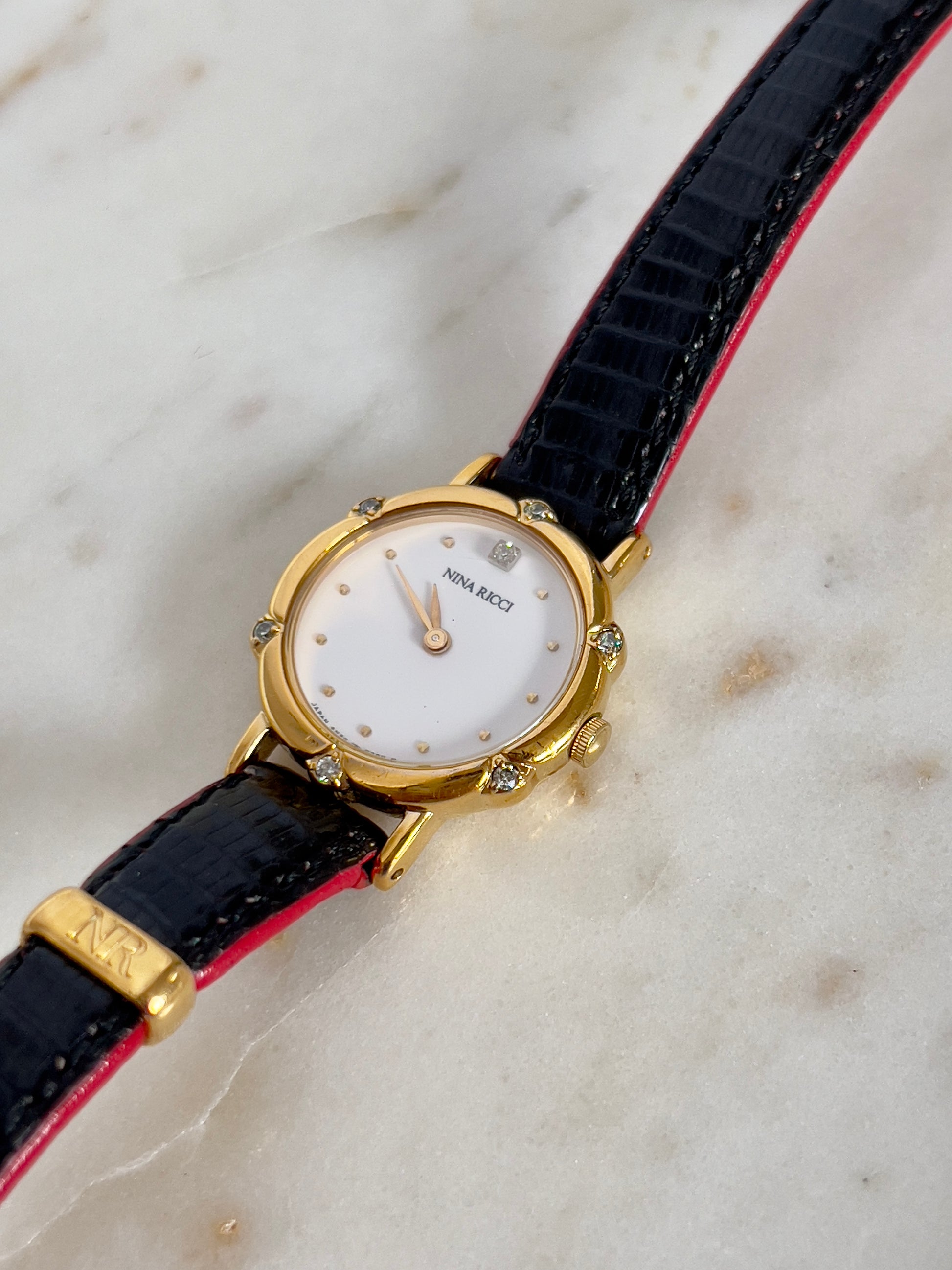 Nina Ricci x Seiko Ladies Vintage Watch – Gold Case, Crystal Accents, Black Leather Strap
