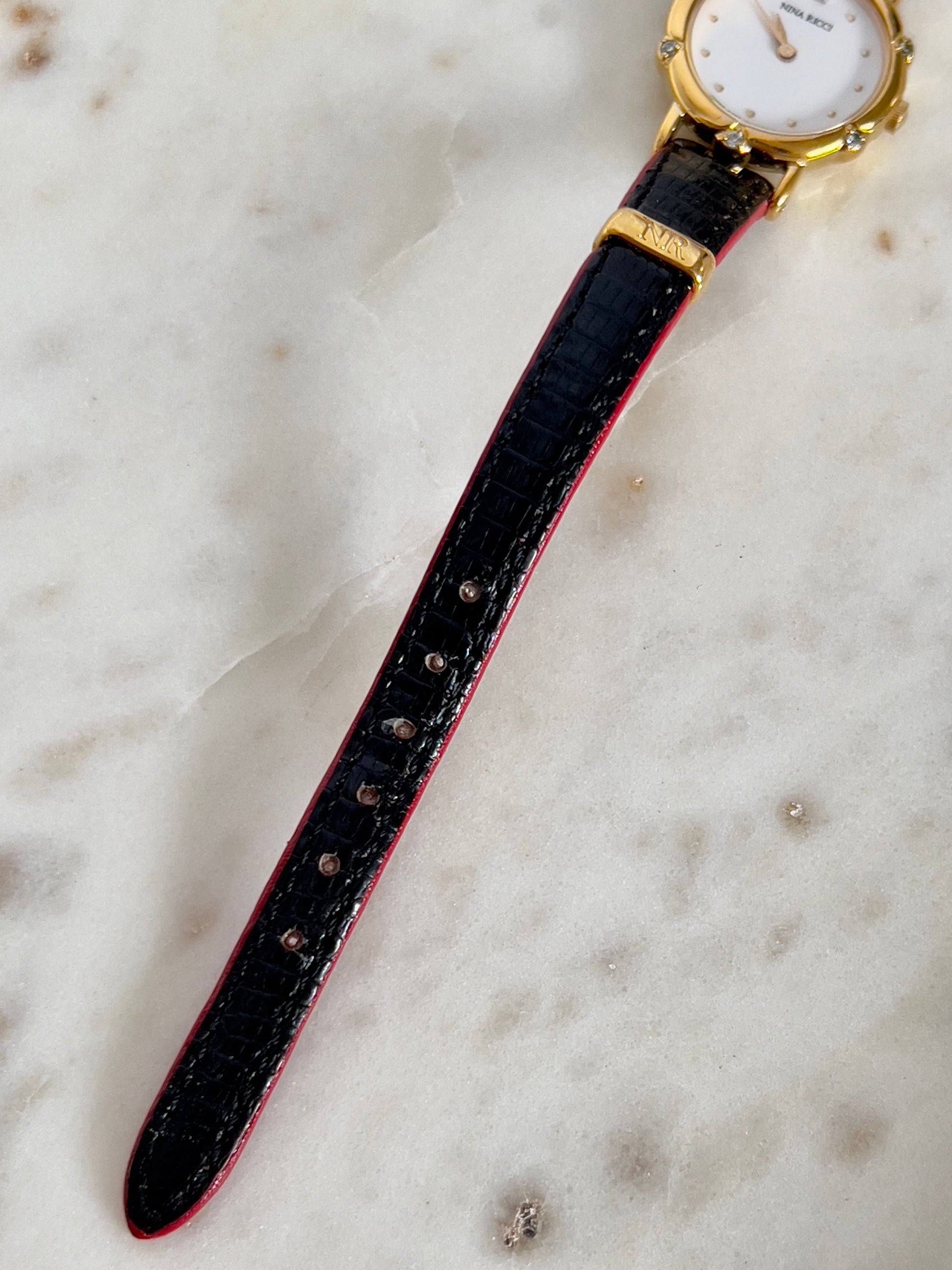 The black embossed leather strap with rich red edges enhances the watch’s luxurious presence, completed by a gold “NR” signature clasp that reinforces its couture identity. A sophisticated piece for the woman who desires grace, poise, and an understated yet unmistakable sense of style.