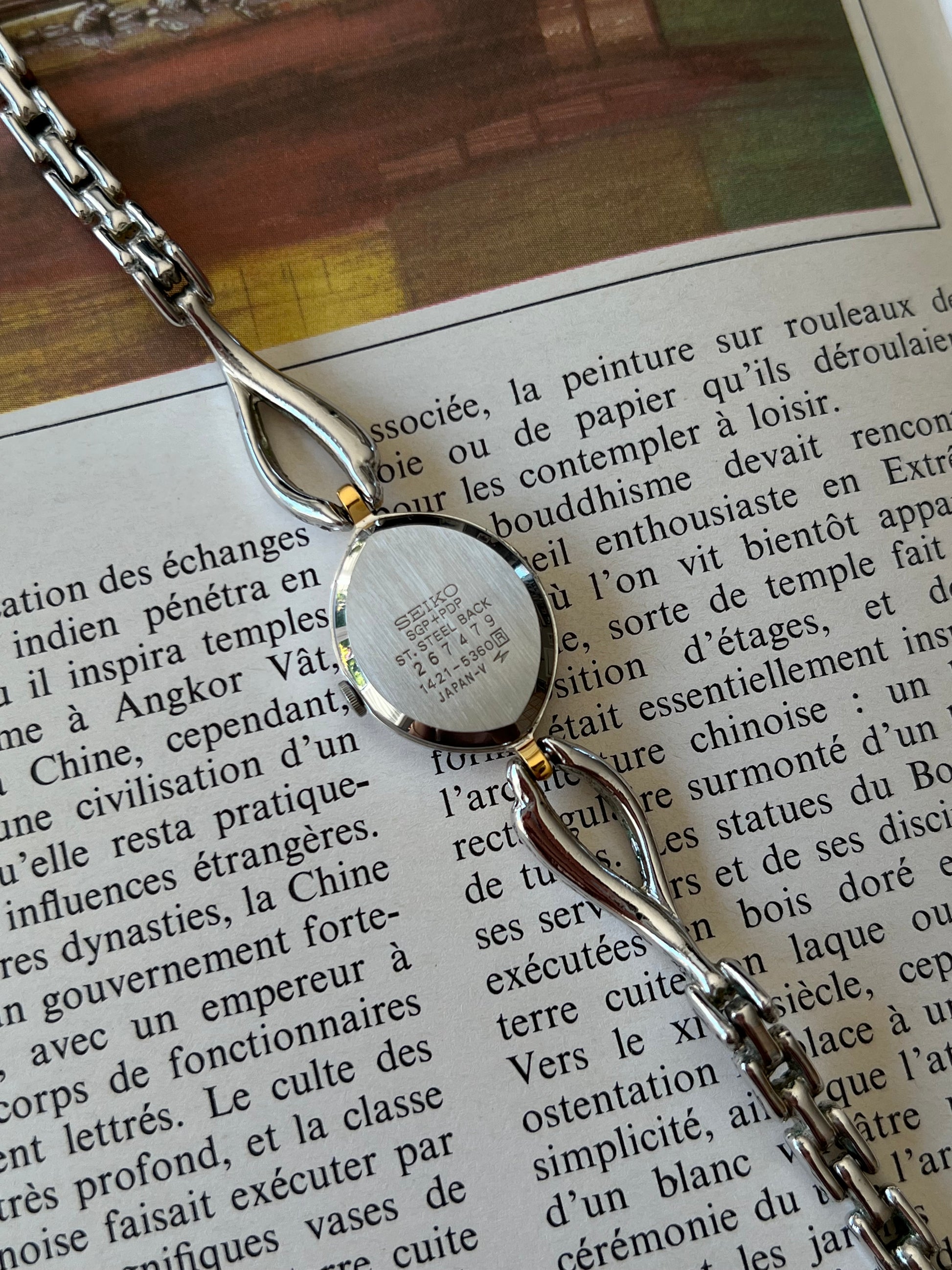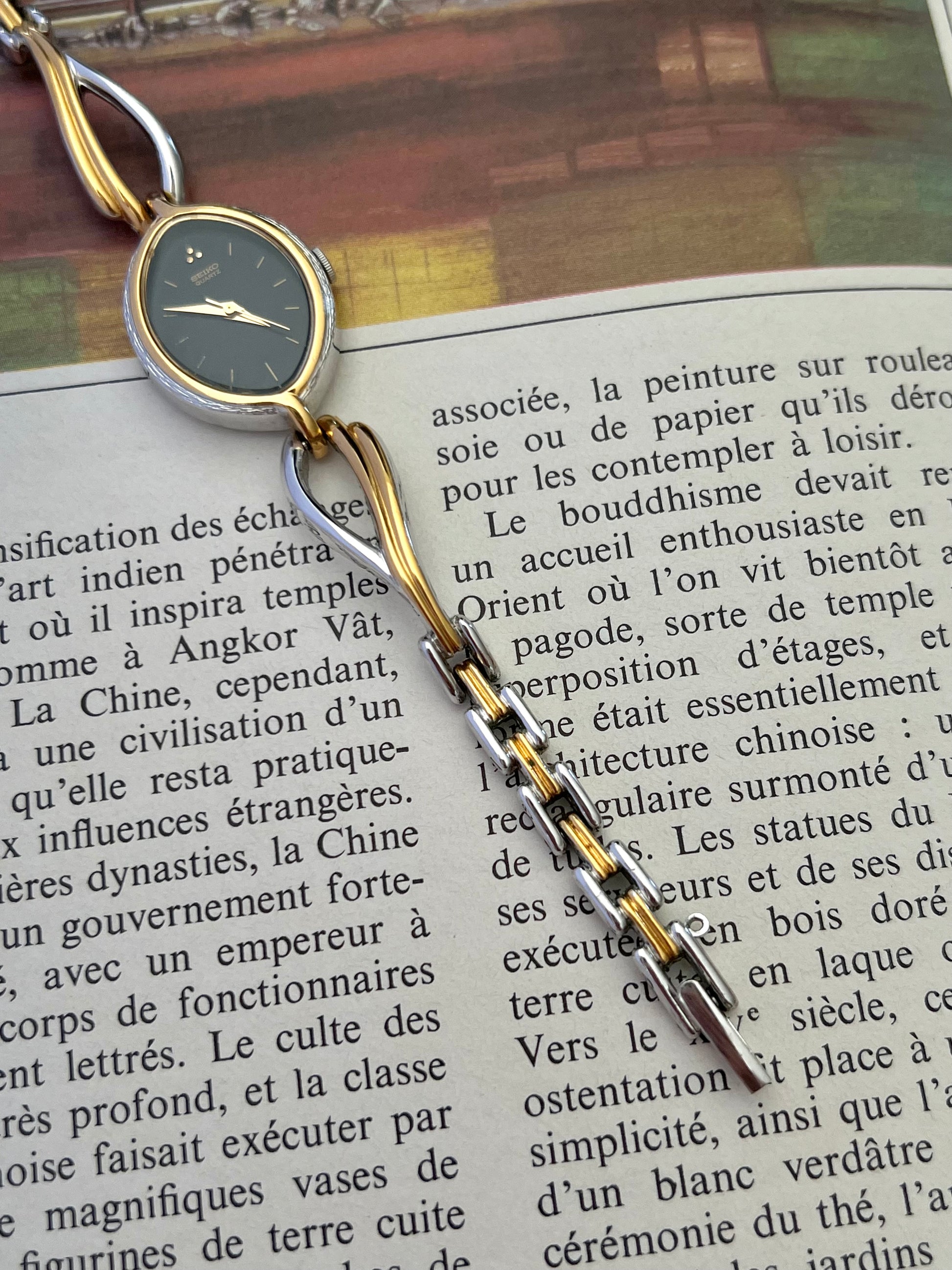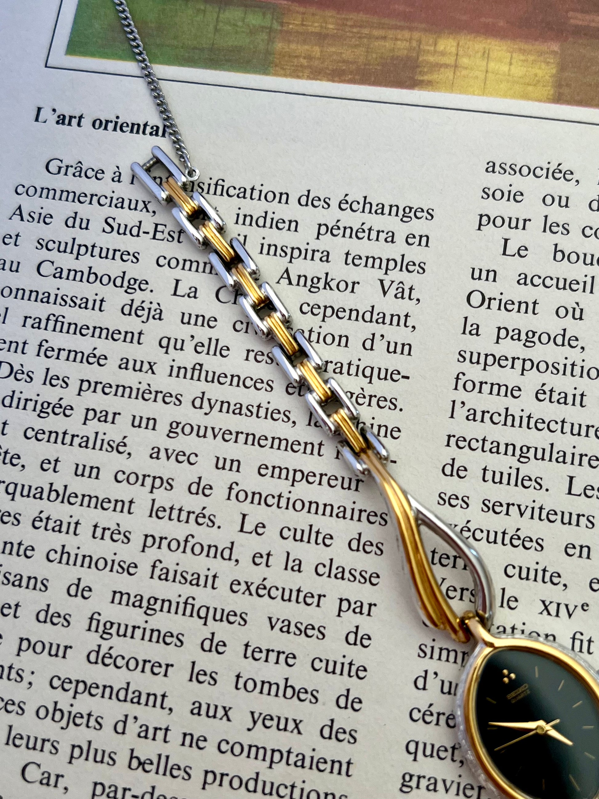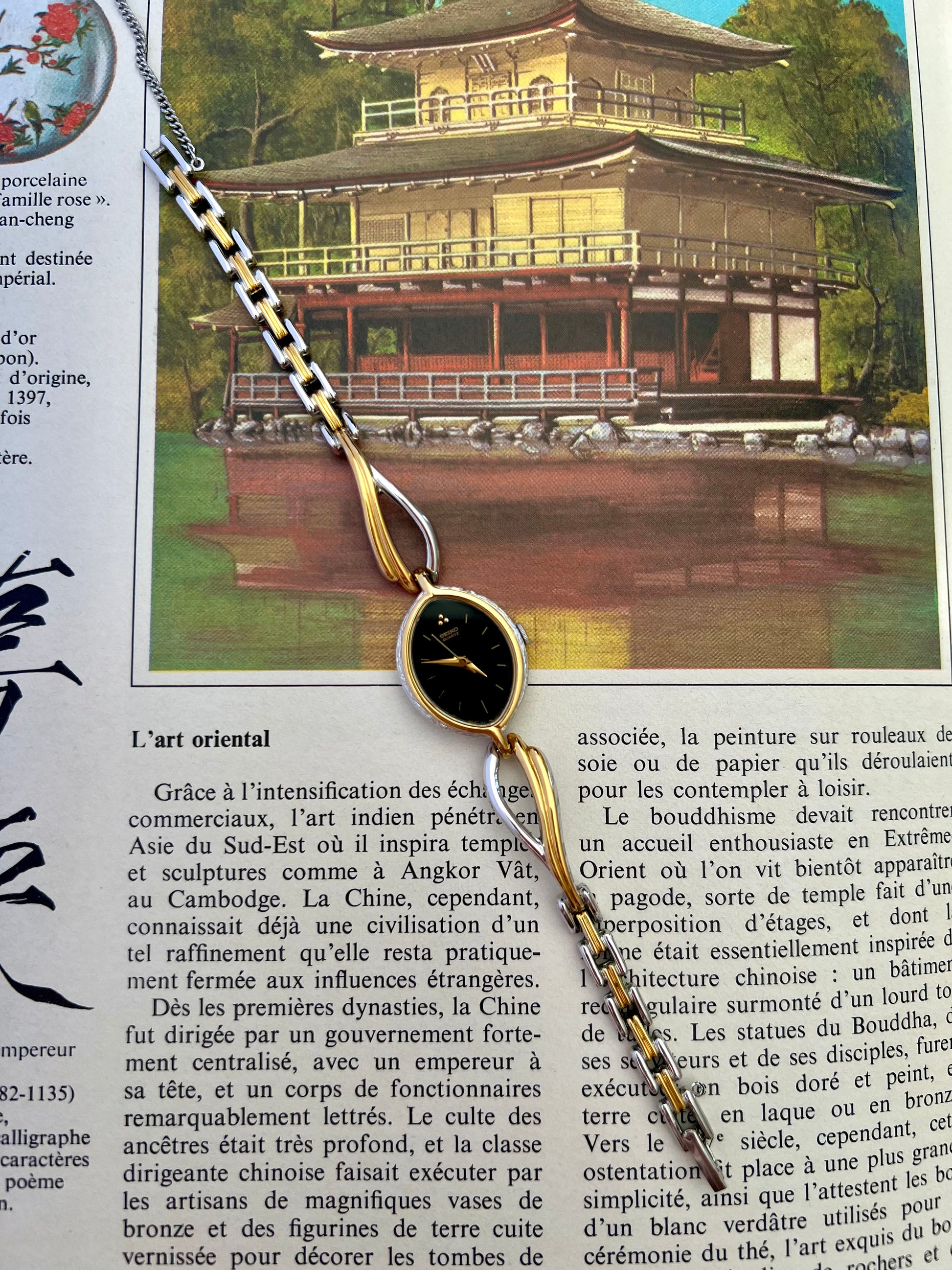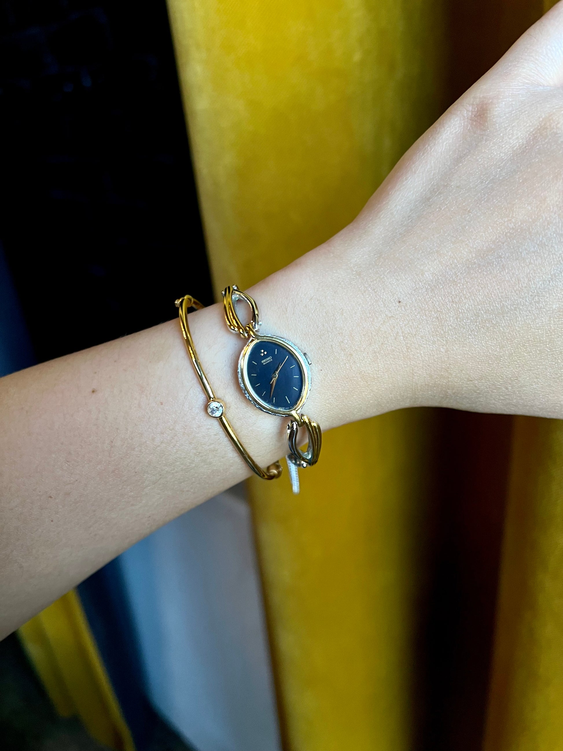Designed as a piece of jewellery rather than a technical instrument, this Seiko features an elongated oval case framed in warm gold tone with soft silver contrast. The silhouette is fluid and organic, echoing the sculptural language of late twentieth century jewellery design. The deep black dial is intentionally restrained. Slim gold markers hover lightly against the surface, allowing the shape of the case and the elegance of the bracelet to take precedence. At twelve, a subtle paired marker adds balance without disrupting the composition.