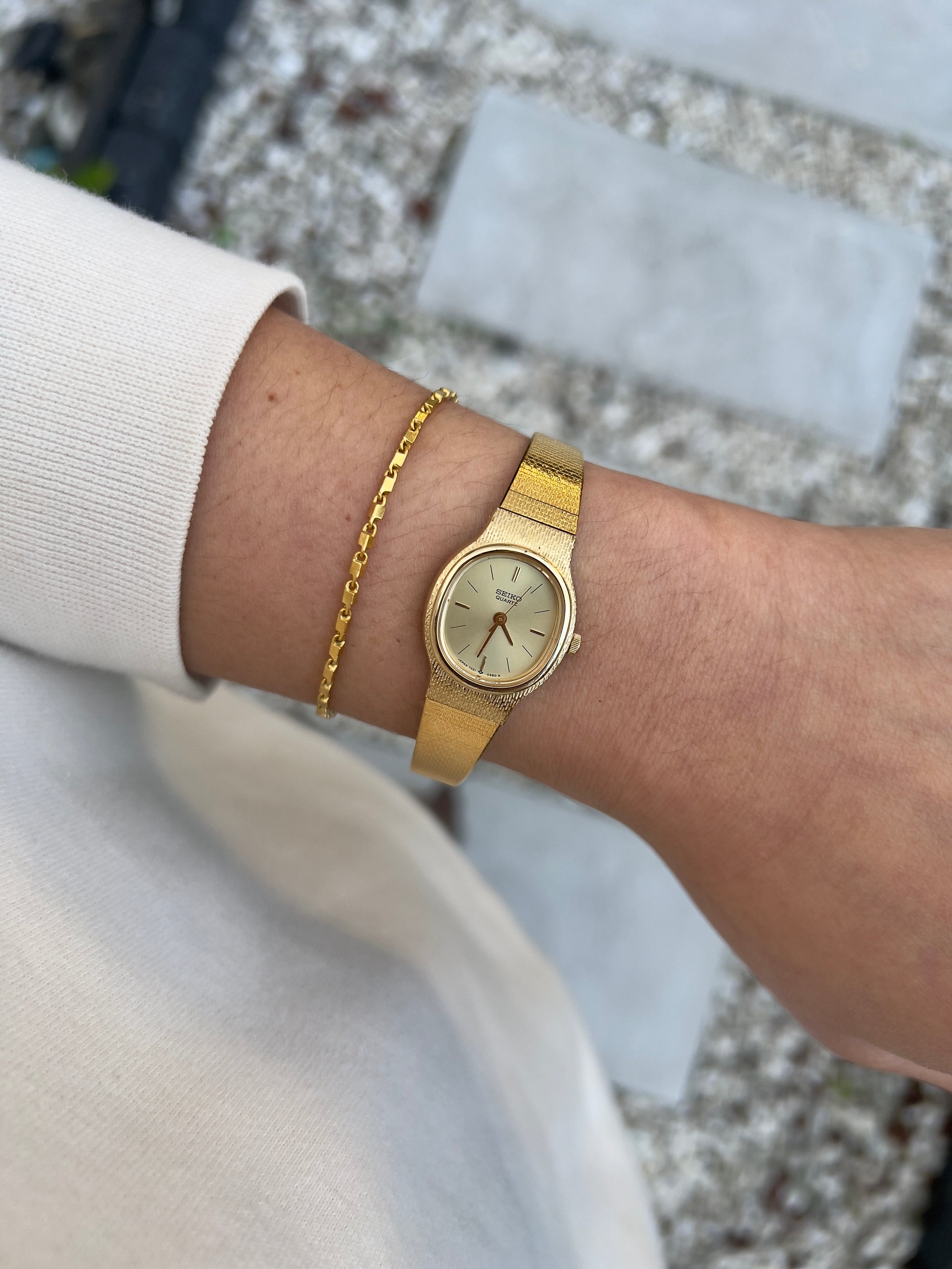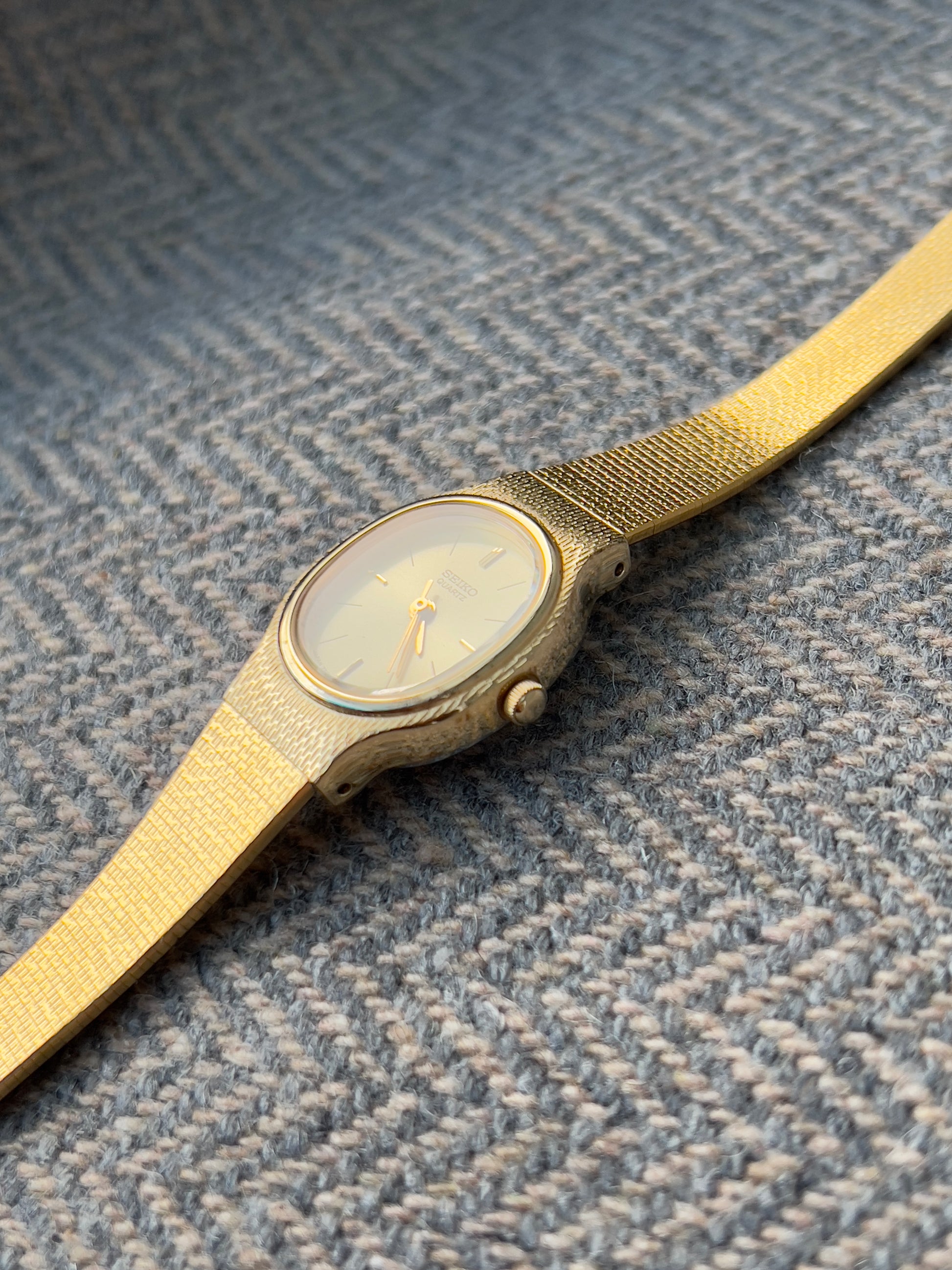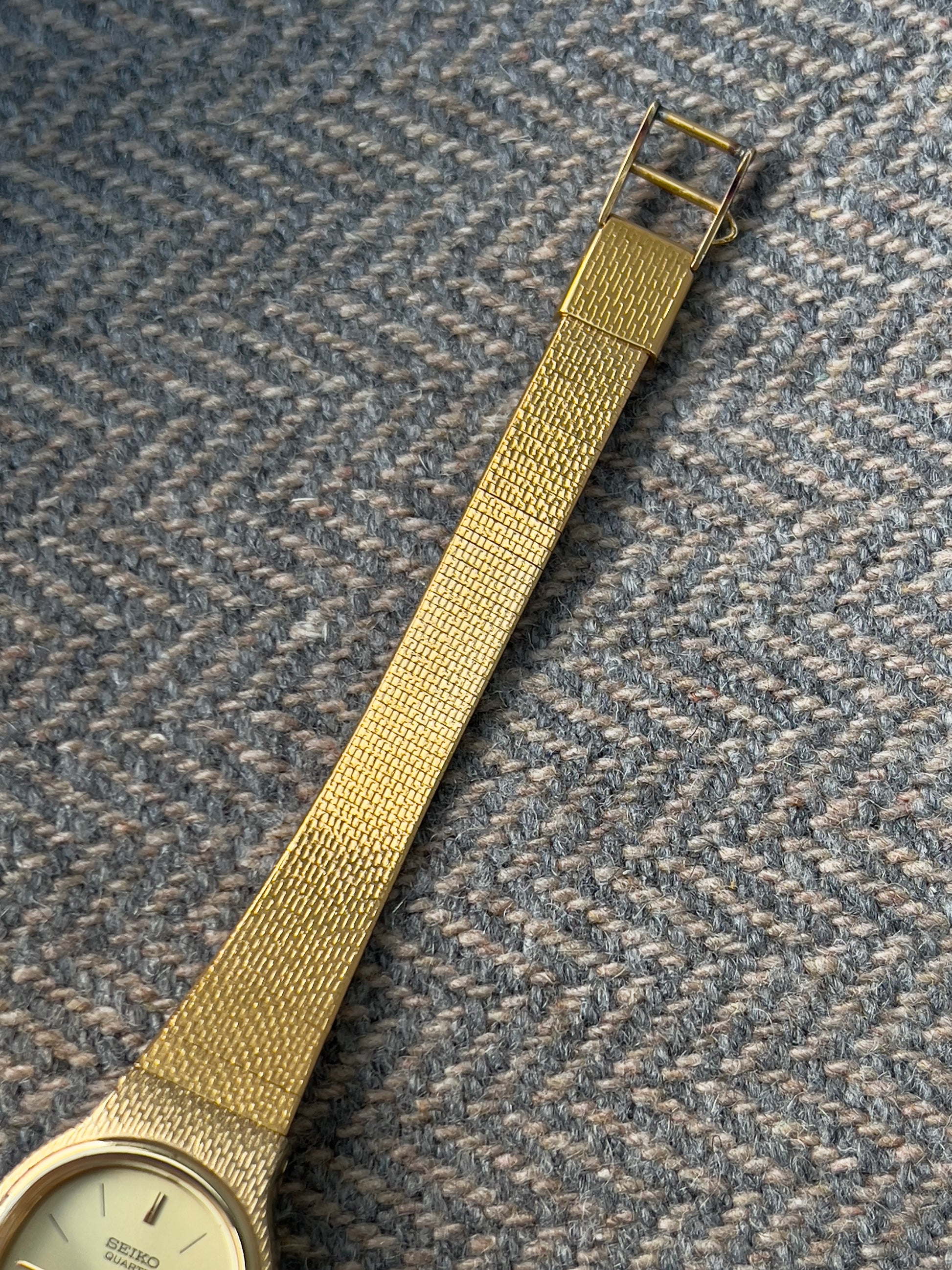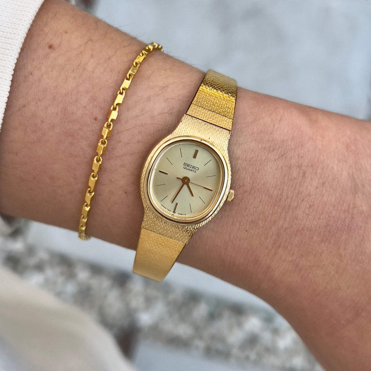 Enhance your style with this stunning vintage Seiko Quartz watch, a perfect blend of classic timekeeping and luxurious jewellery. Crafted with a sleek gold-tone metal bracelet, this watch features a minimalist dial that exudes sophistication.