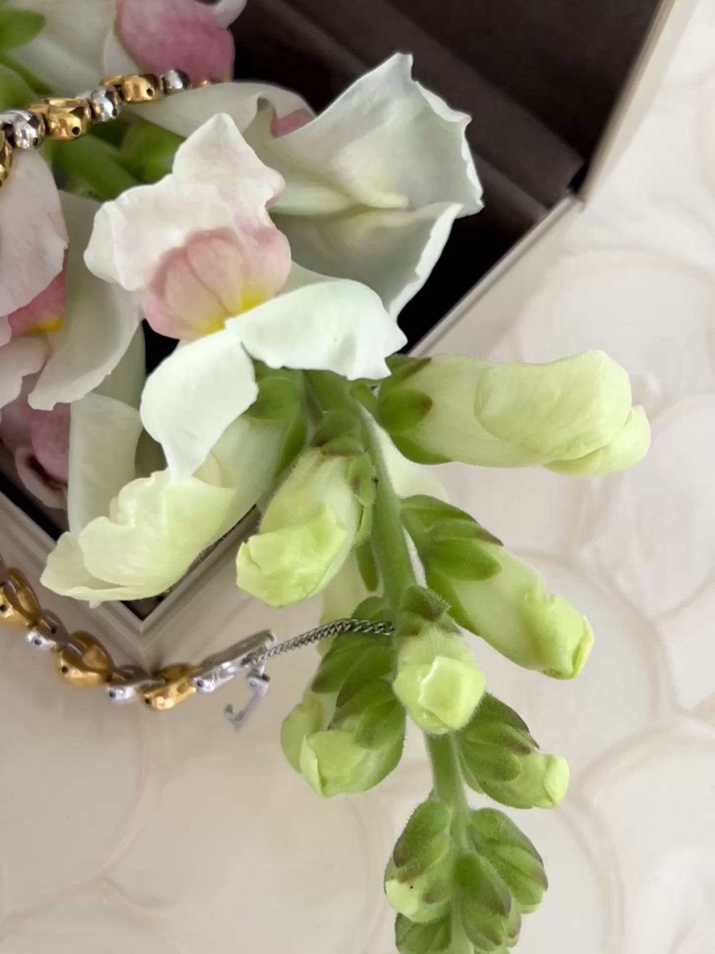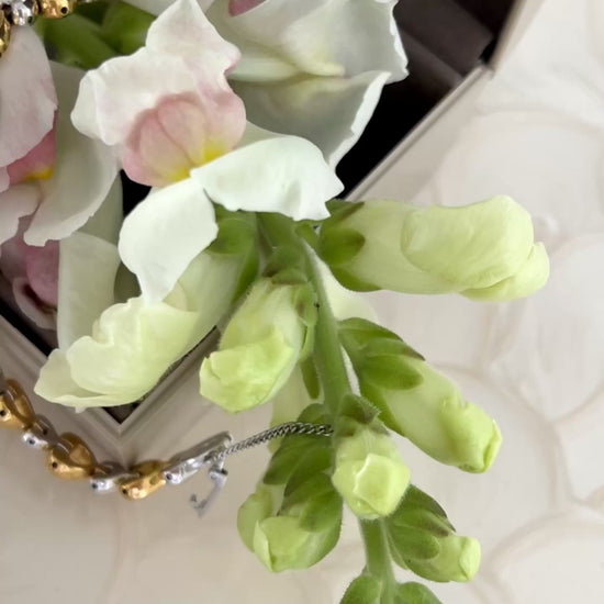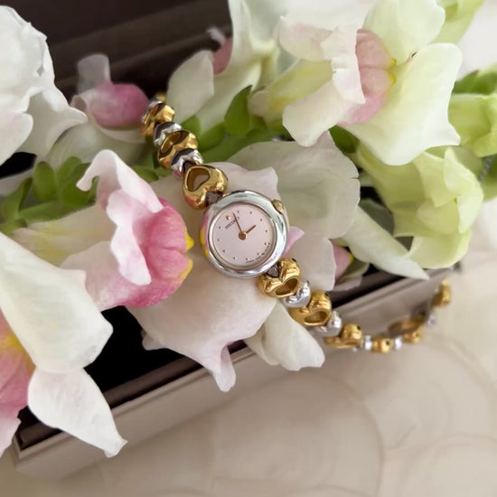 This Seiko is created as a jewel for the wrist. The petite round dial is serene in silver with fine golden hands and discreet dot markers, leaving the surface uncluttered and calm. The bracelet becomes the adornment, a chain of hearts in alternating gold and silver, polished to catch the light like a series of charms. Graceful, and fitting to be the centre of a beautiful wrist stack.
