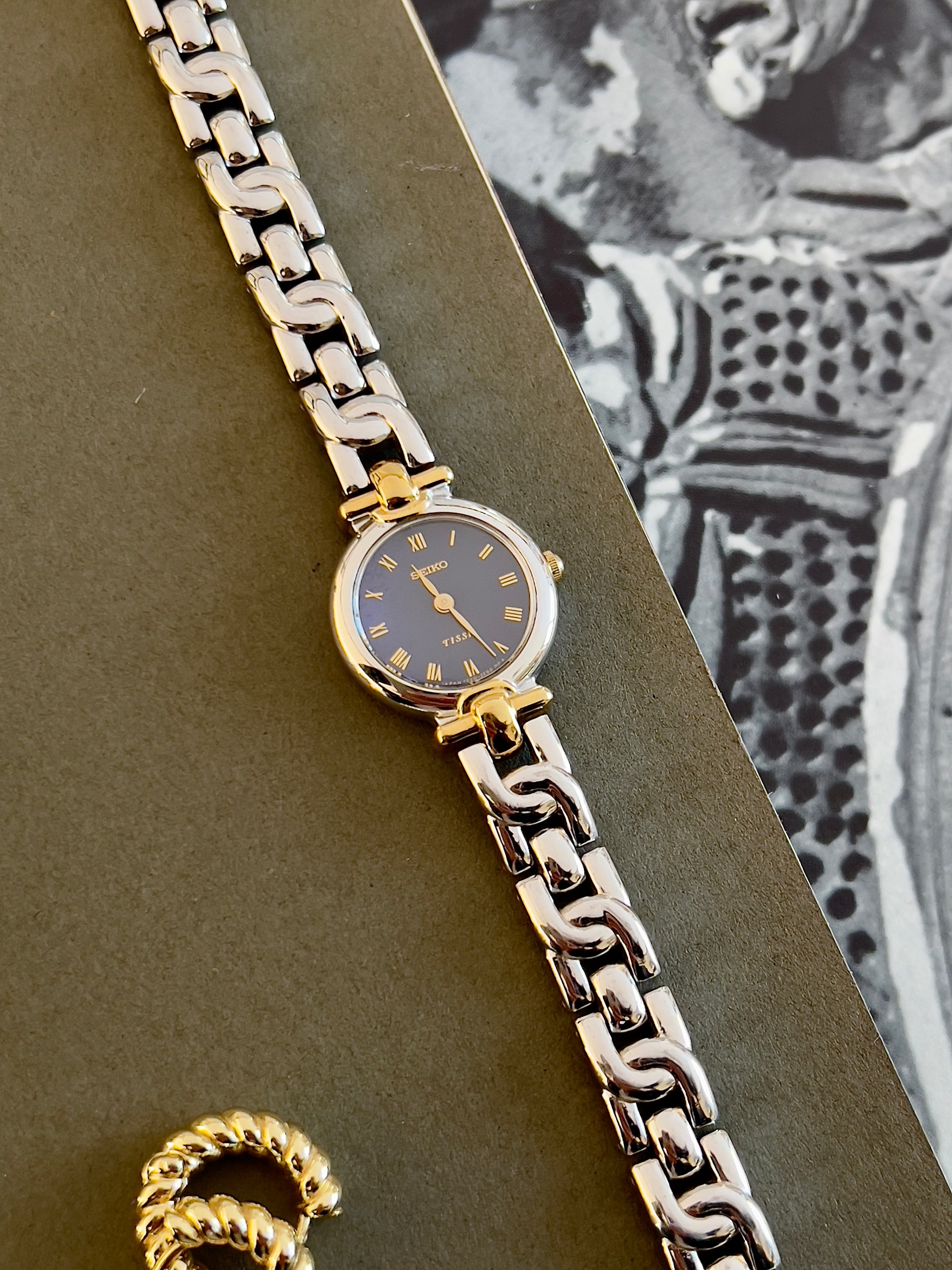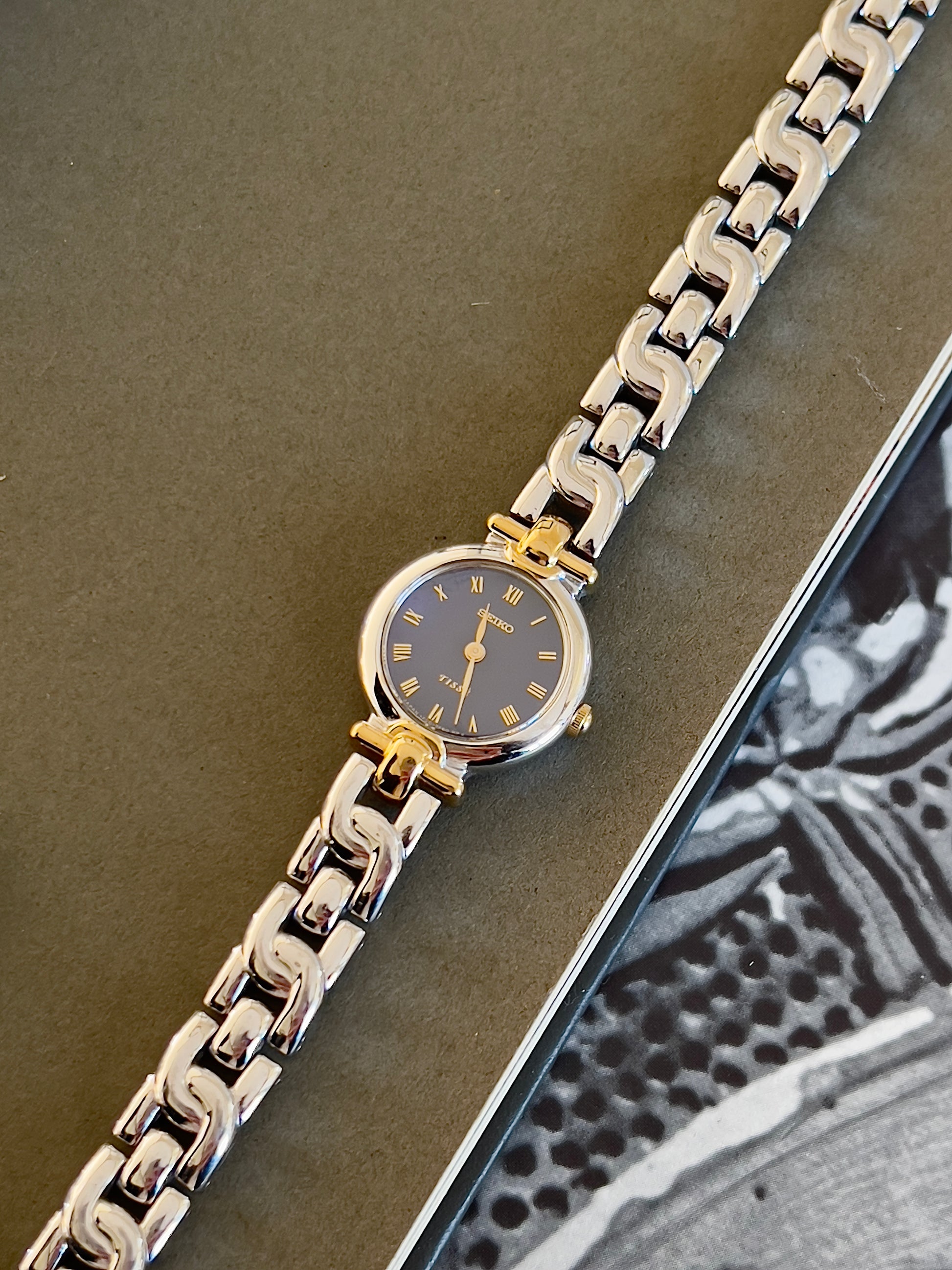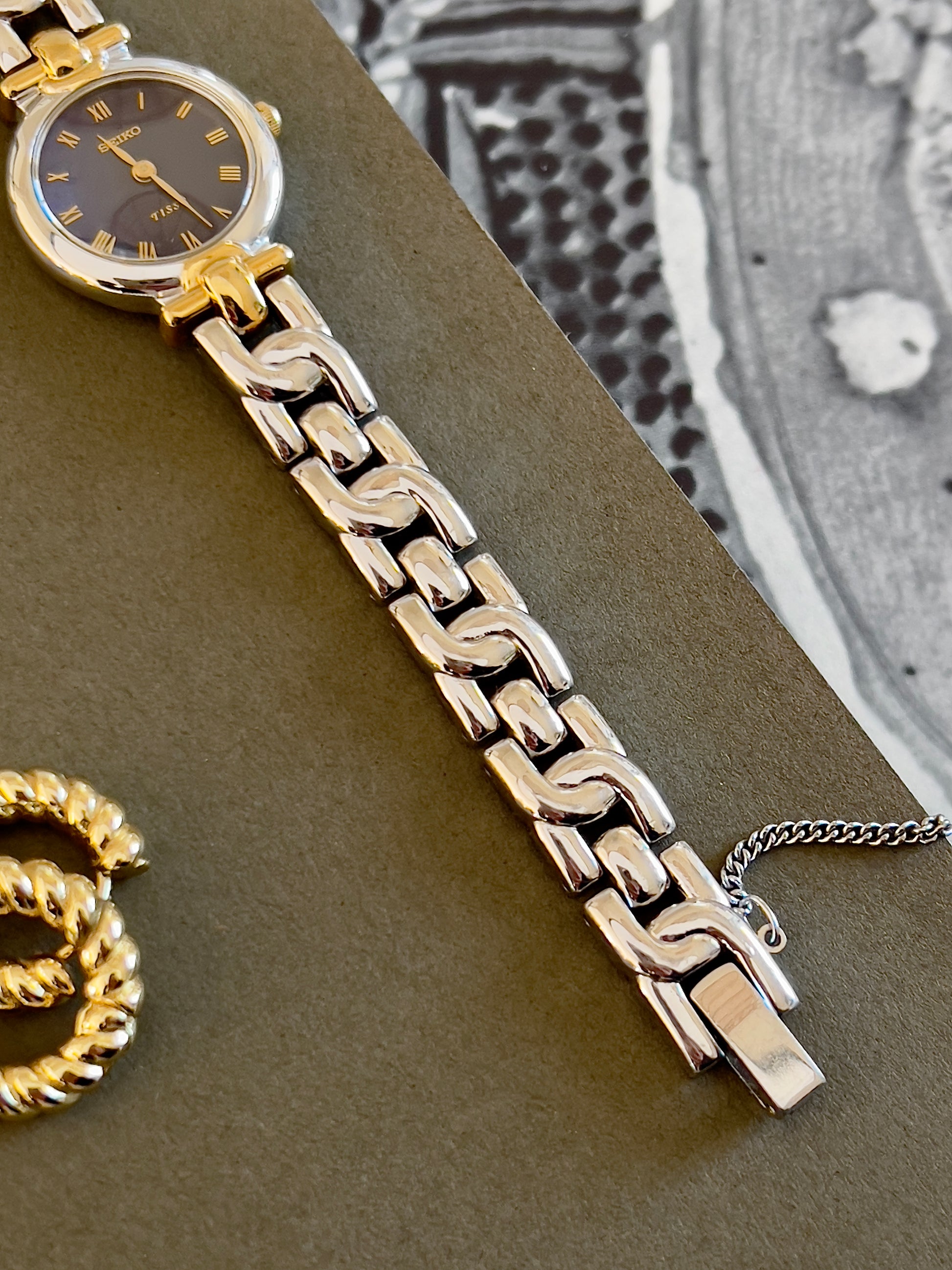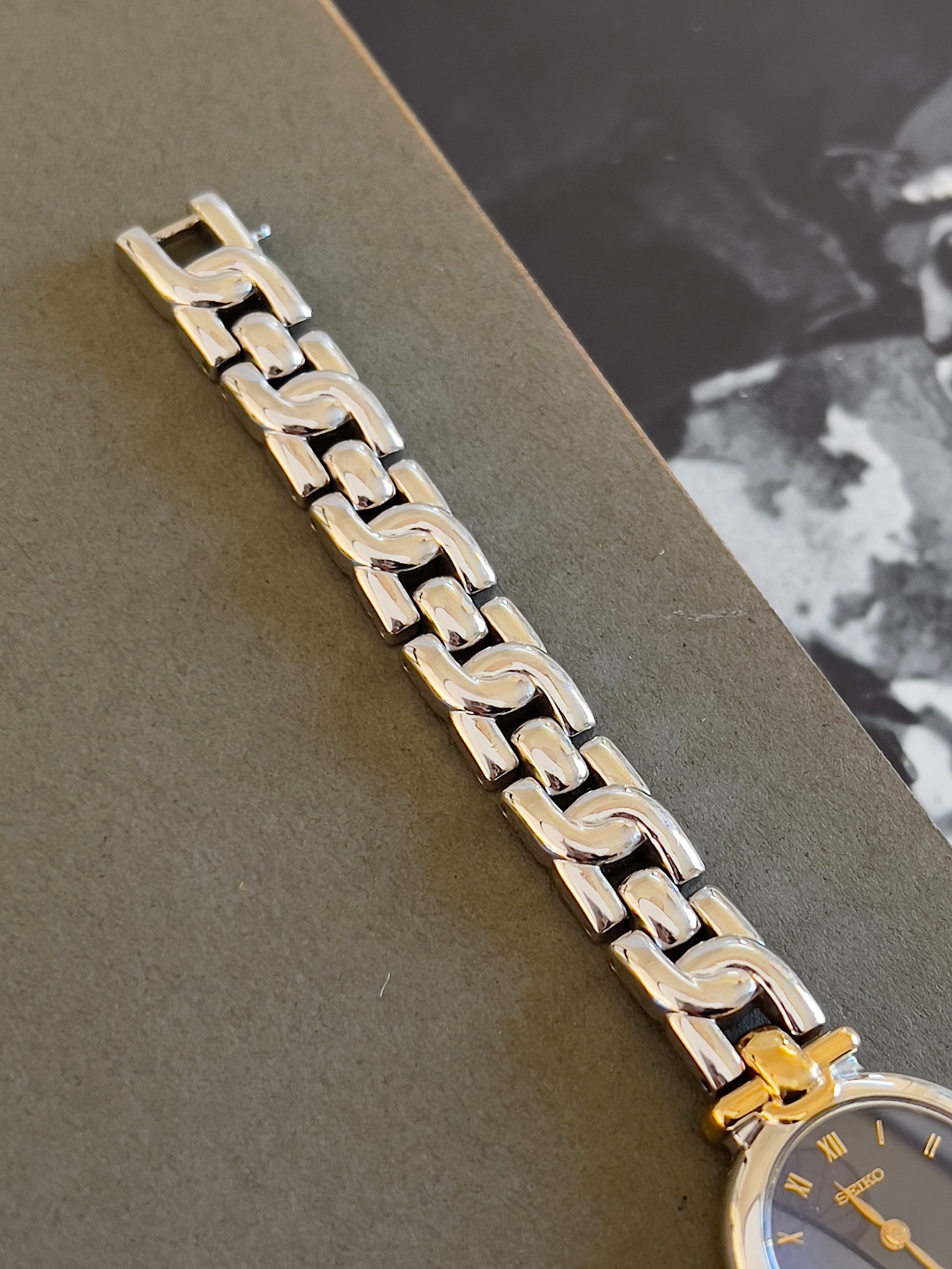 The standout feature is its sexy two-tone bracelet. Polished silver and gold-tone links form a smooth, contoured shape that wraps comfortably around the wrist. This integrated bracelet style echoes high-end jewellery watches of the era, offering both comfort and sophistication.
