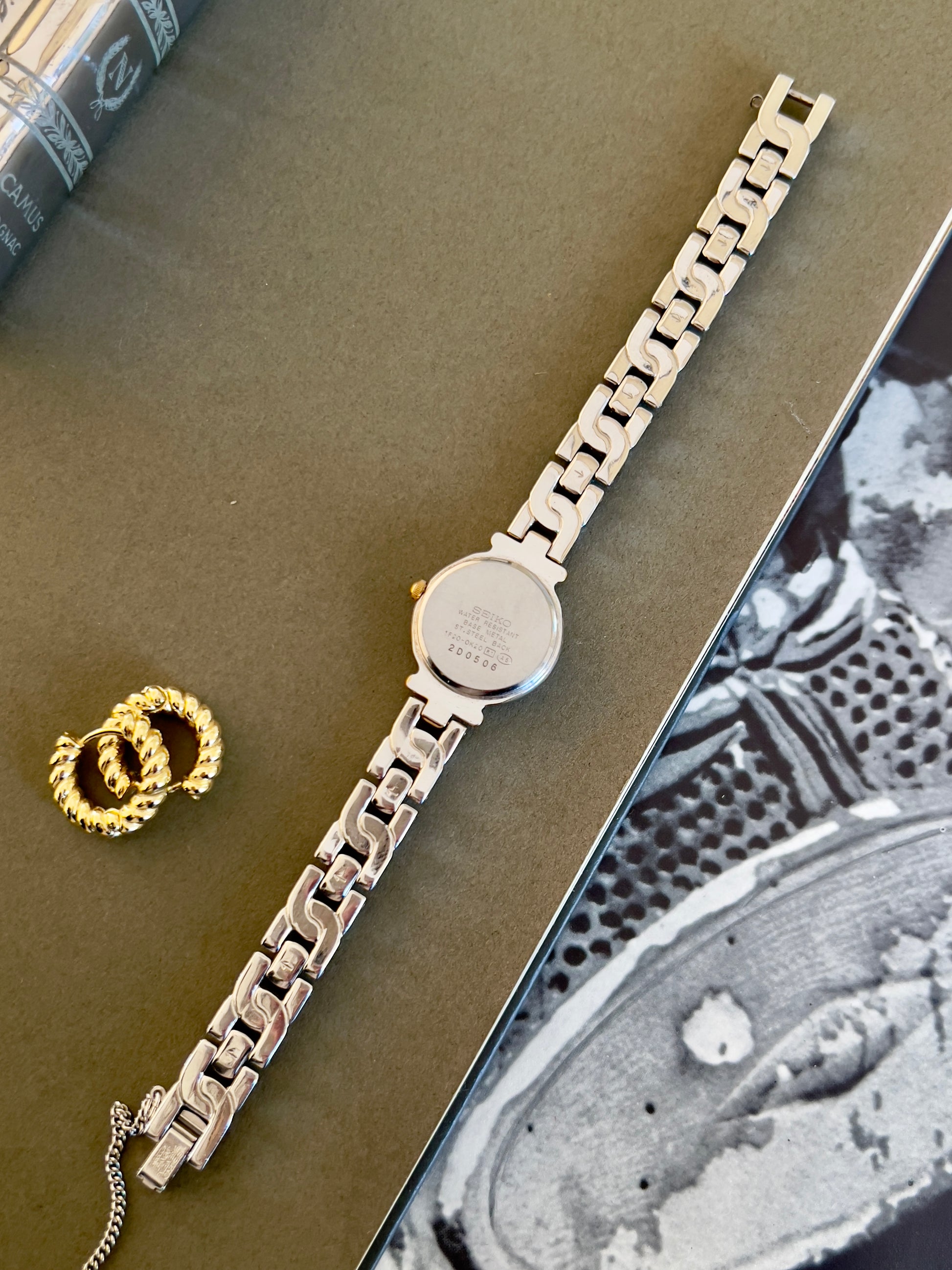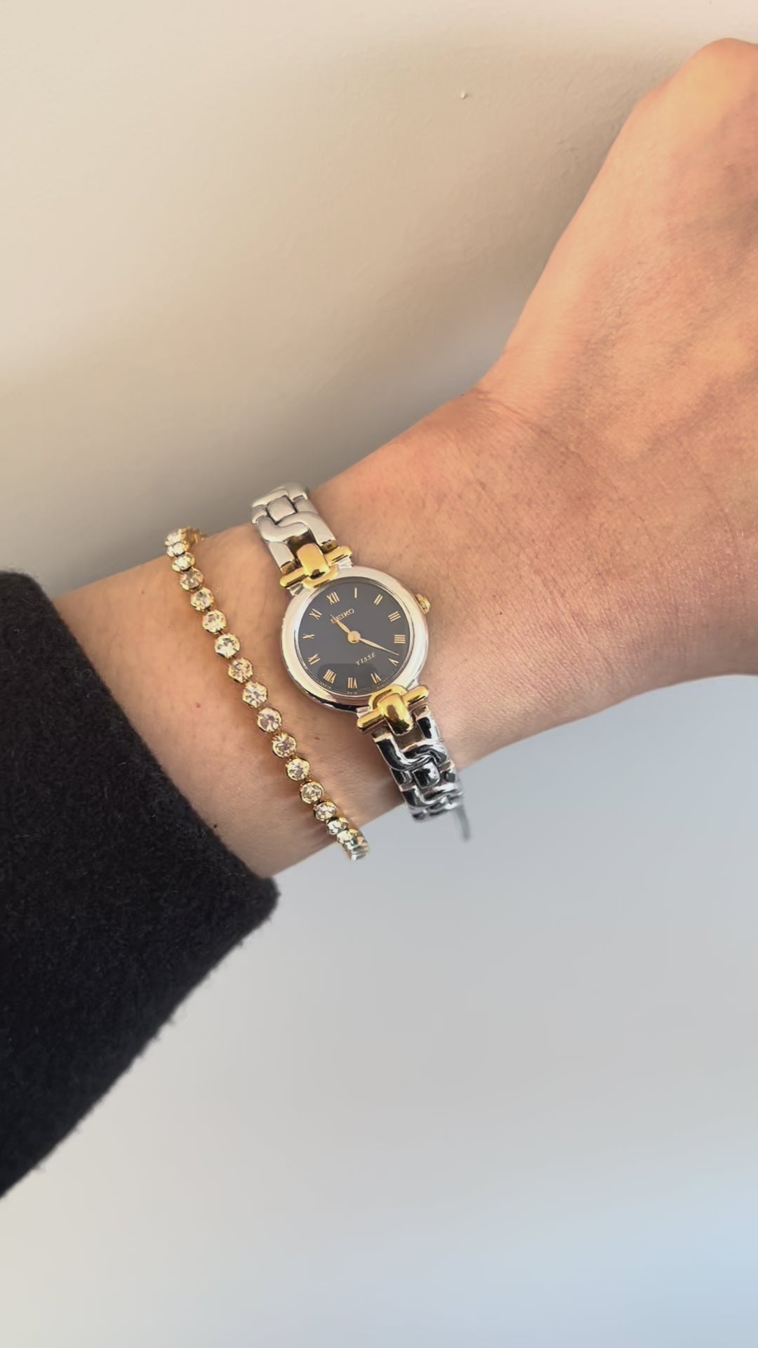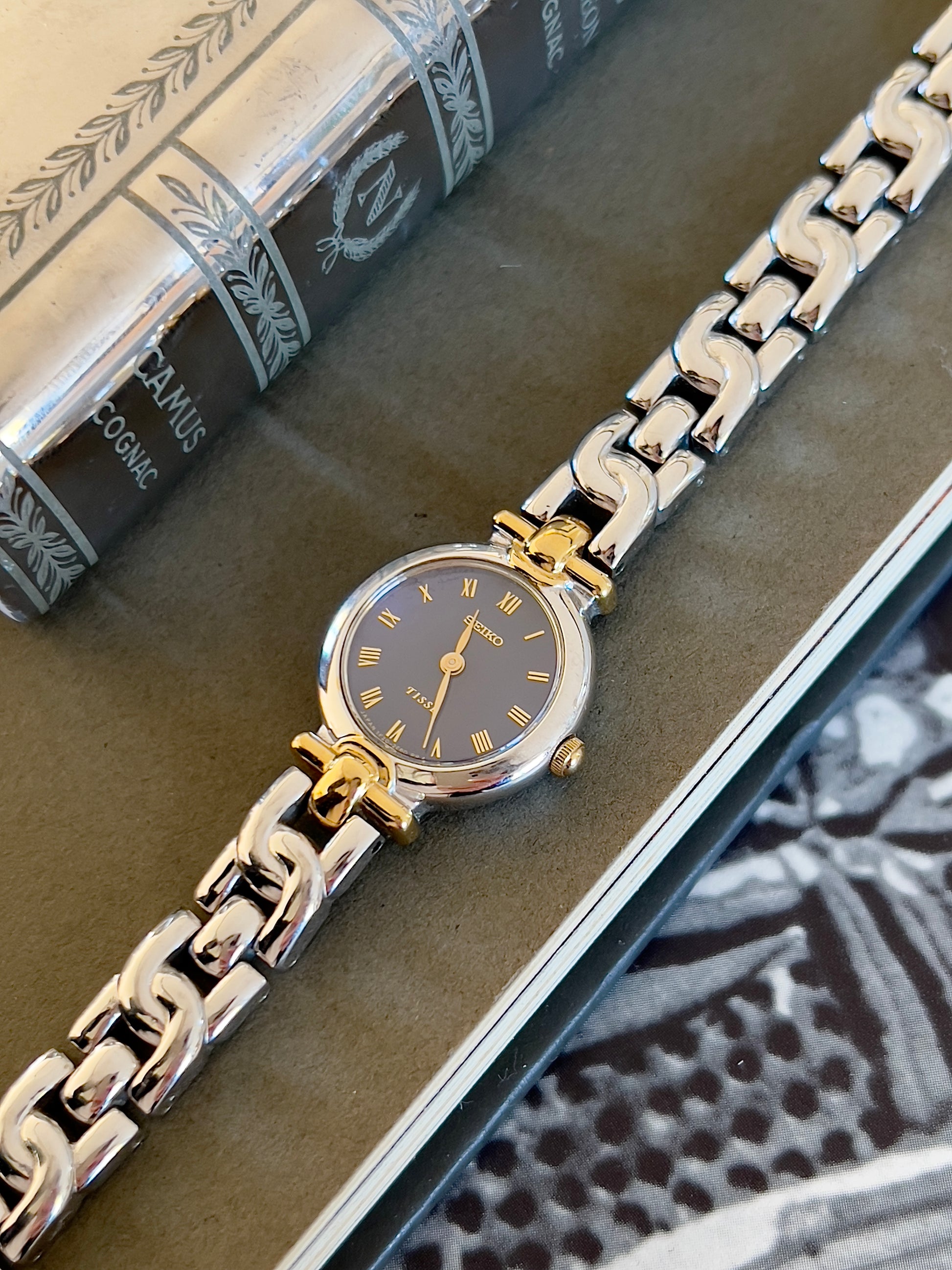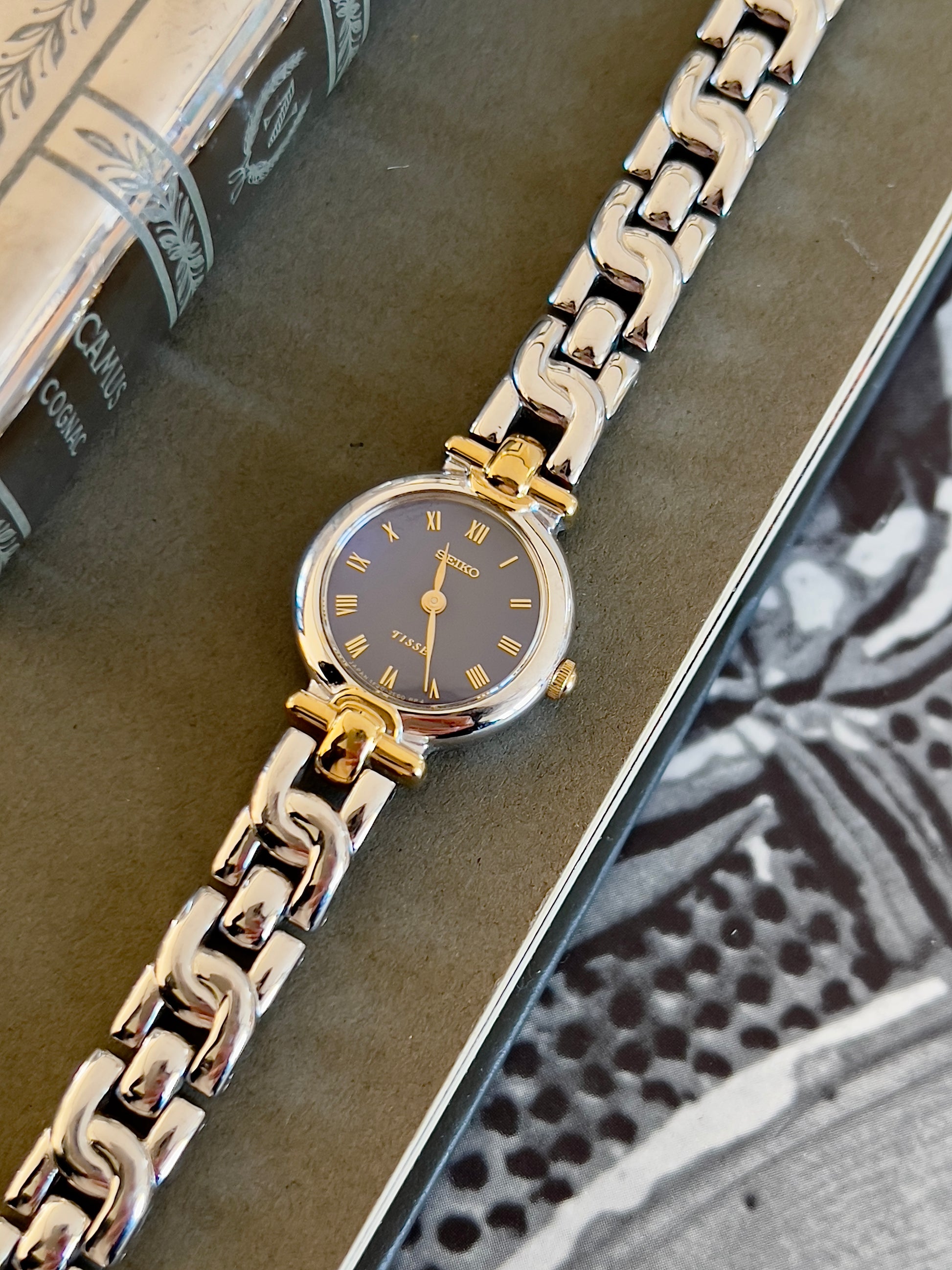 The standout feature is its sexy two-tone bracelet. Polished silver and gold-tone links form a smooth, contoured shape that wraps comfortably around the wrist. This integrated bracelet style echoes high-end jewellery watches of the era, offering both comfort and sophistication.