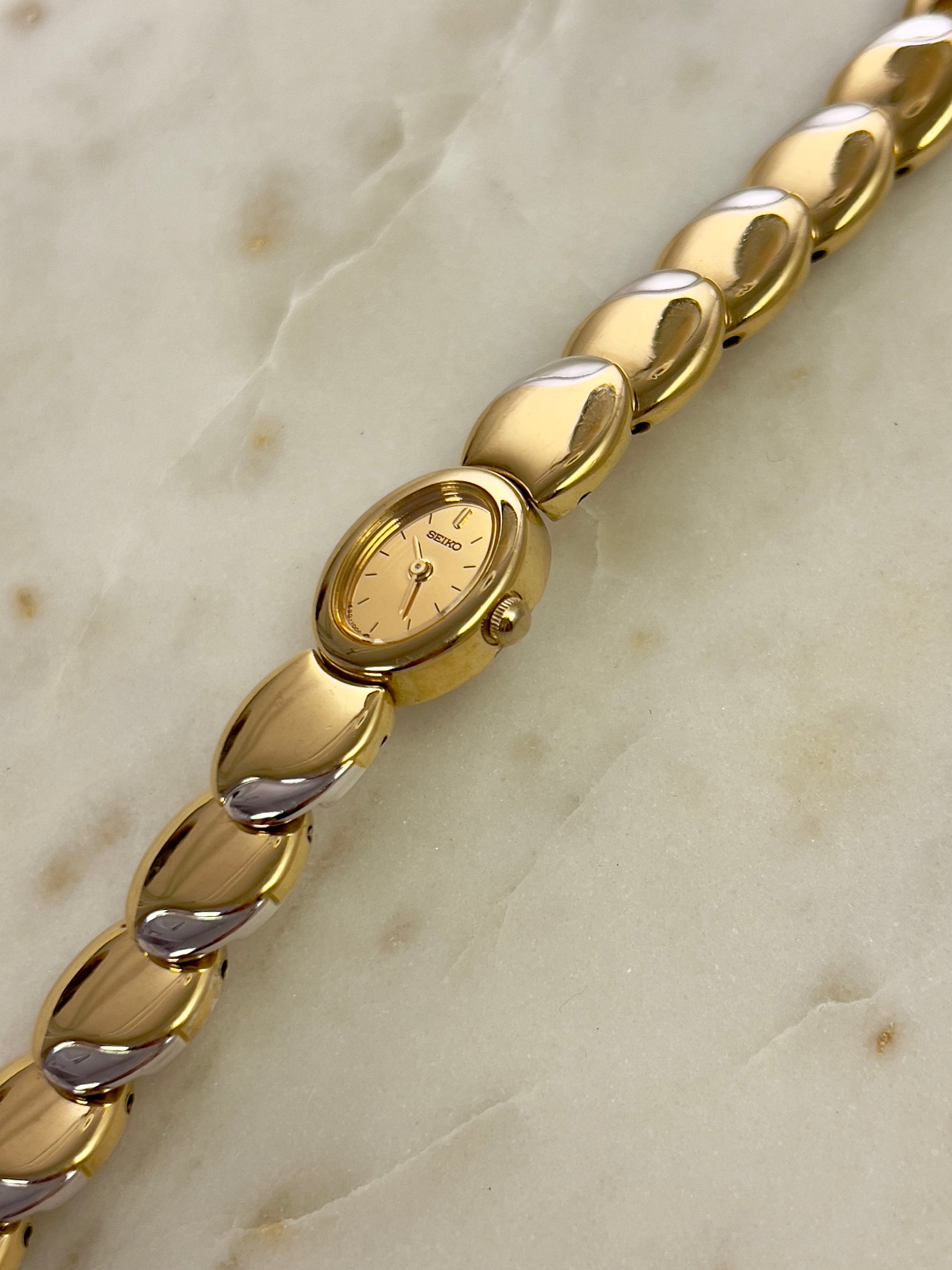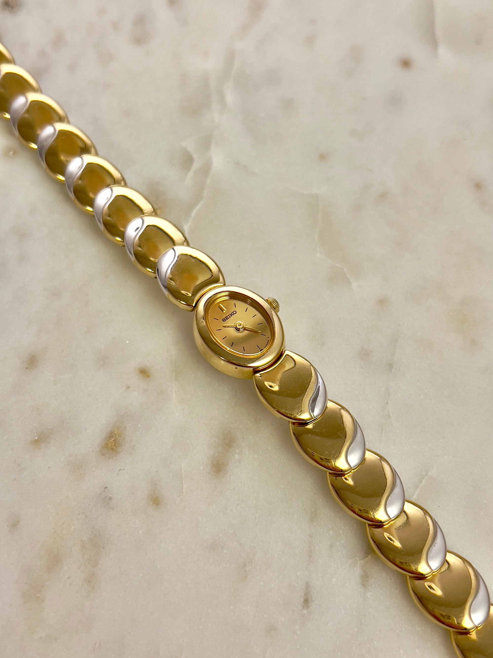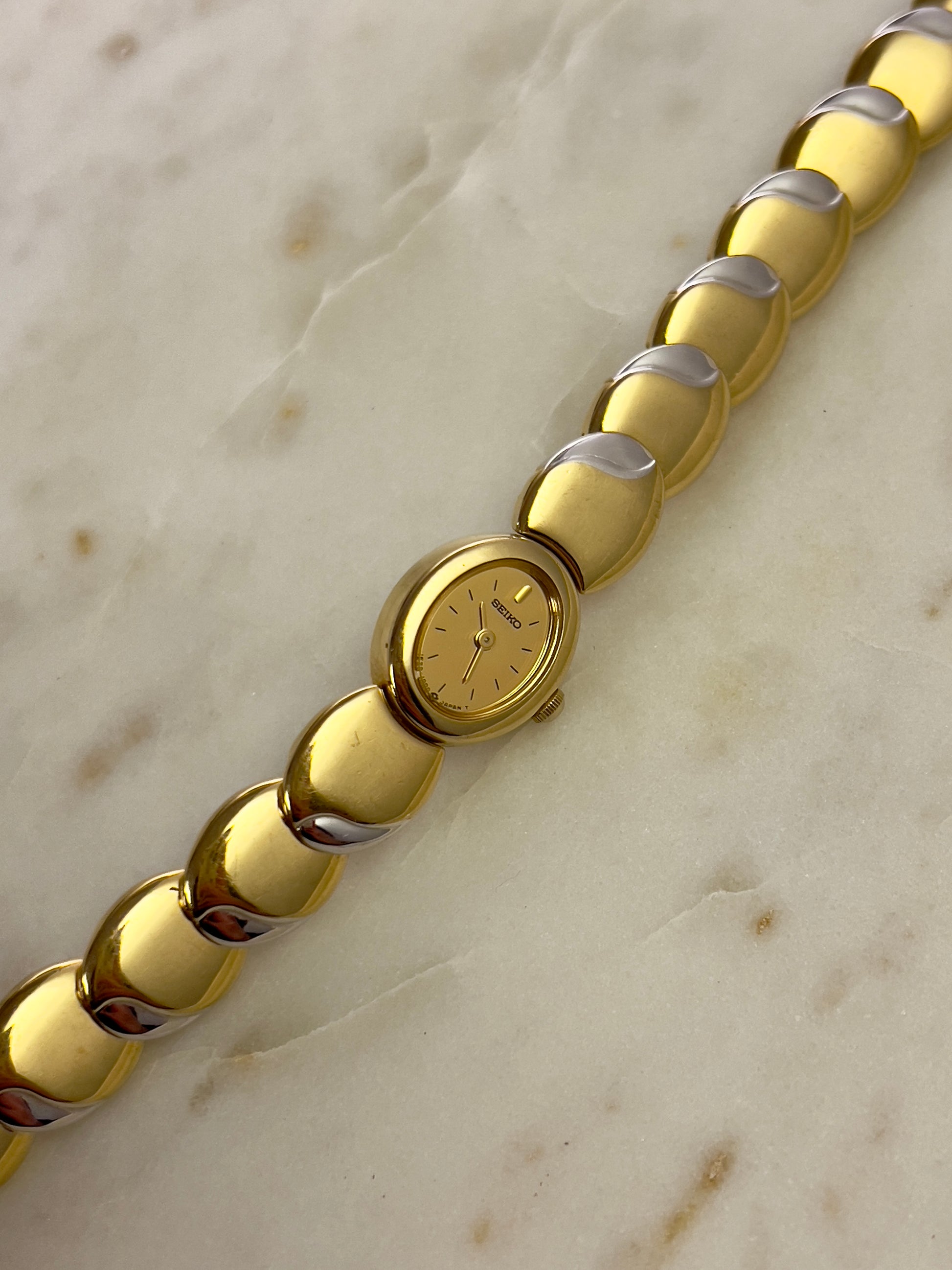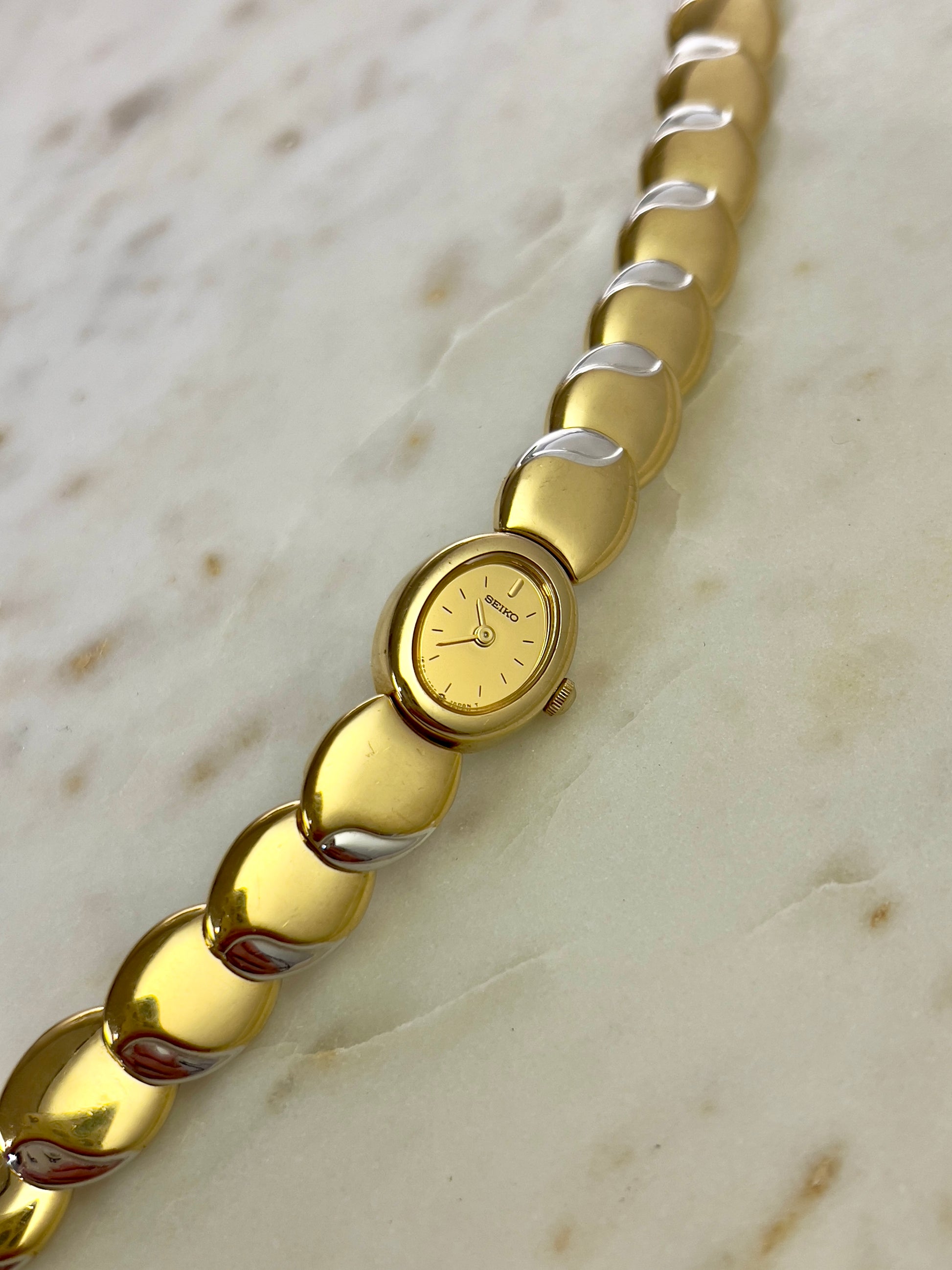 Like something out of a fairytale jewel box, this vintage Seiko timepiece wraps around the wrist in gleaming, golden rhythm. Each rounded link is shaped like a polished droplet, gently domed and almost organic in feel, catching light like liquid metal. There’s a sense of fluidity and softness to the form no harsh edges, just smooth curves that make it feel more like art than accessory.