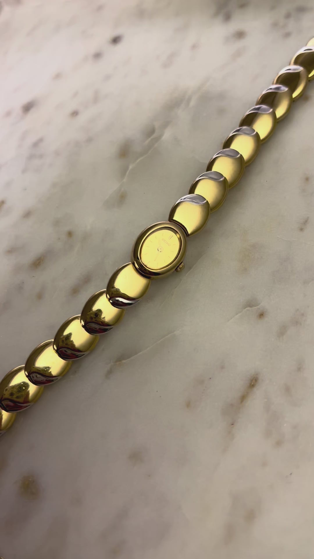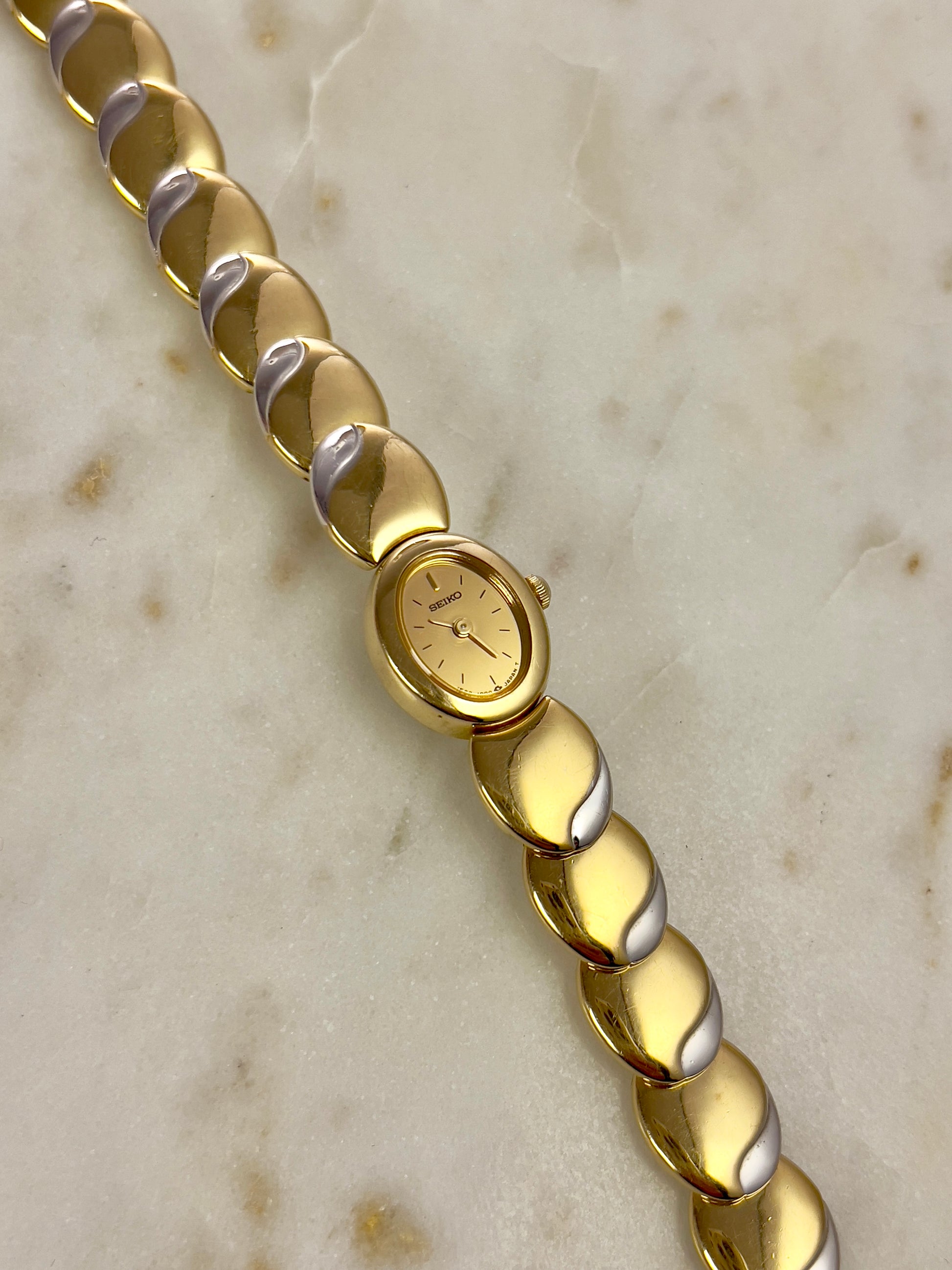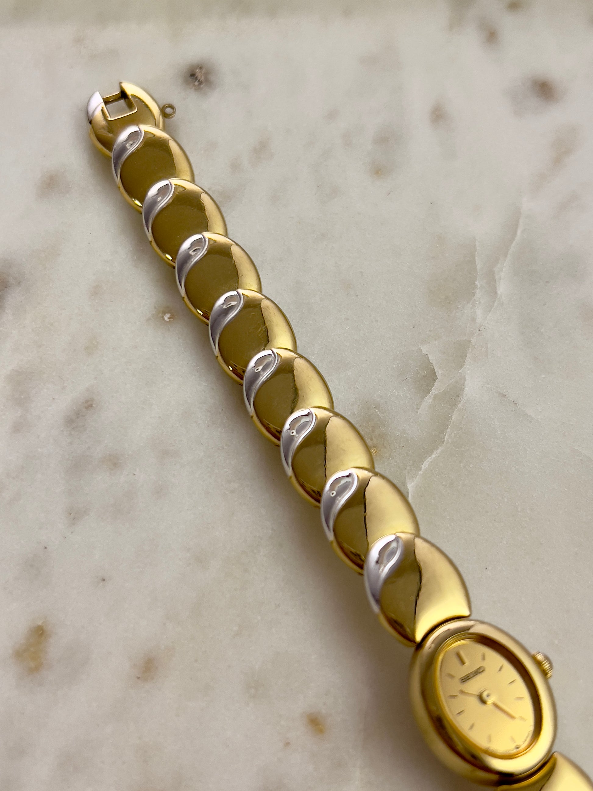 Like something out of a fairytale jewel box, this vintage Seiko timepiece wraps around the wrist in gleaming, golden rhythm. Each rounded link is shaped like a polished droplet, gently domed and almost organic in feel, catching light like liquid metal. There’s a sense of fluidity and softness to the form no harsh edges, just smooth curves that make it feel more like art than accessory.