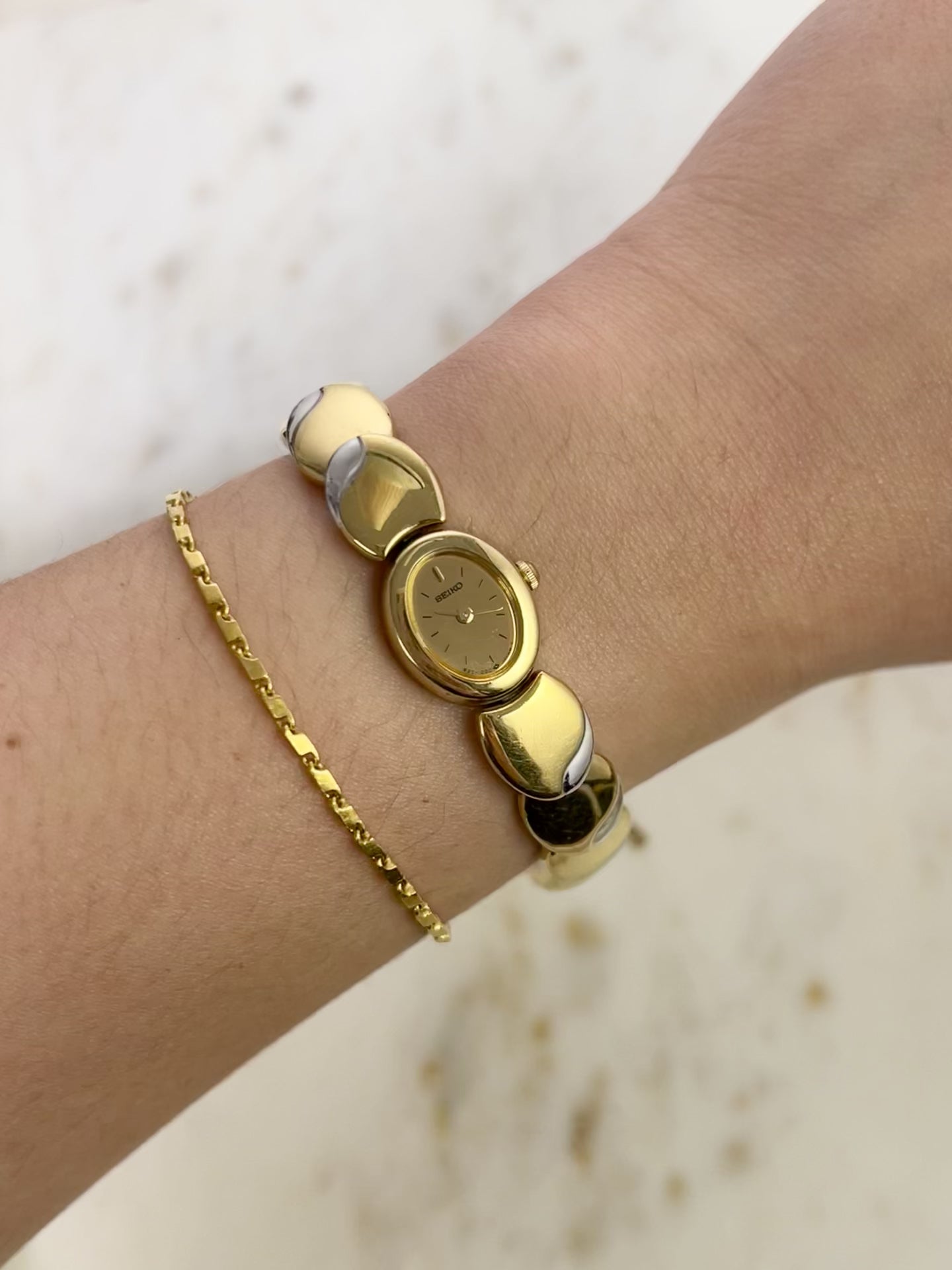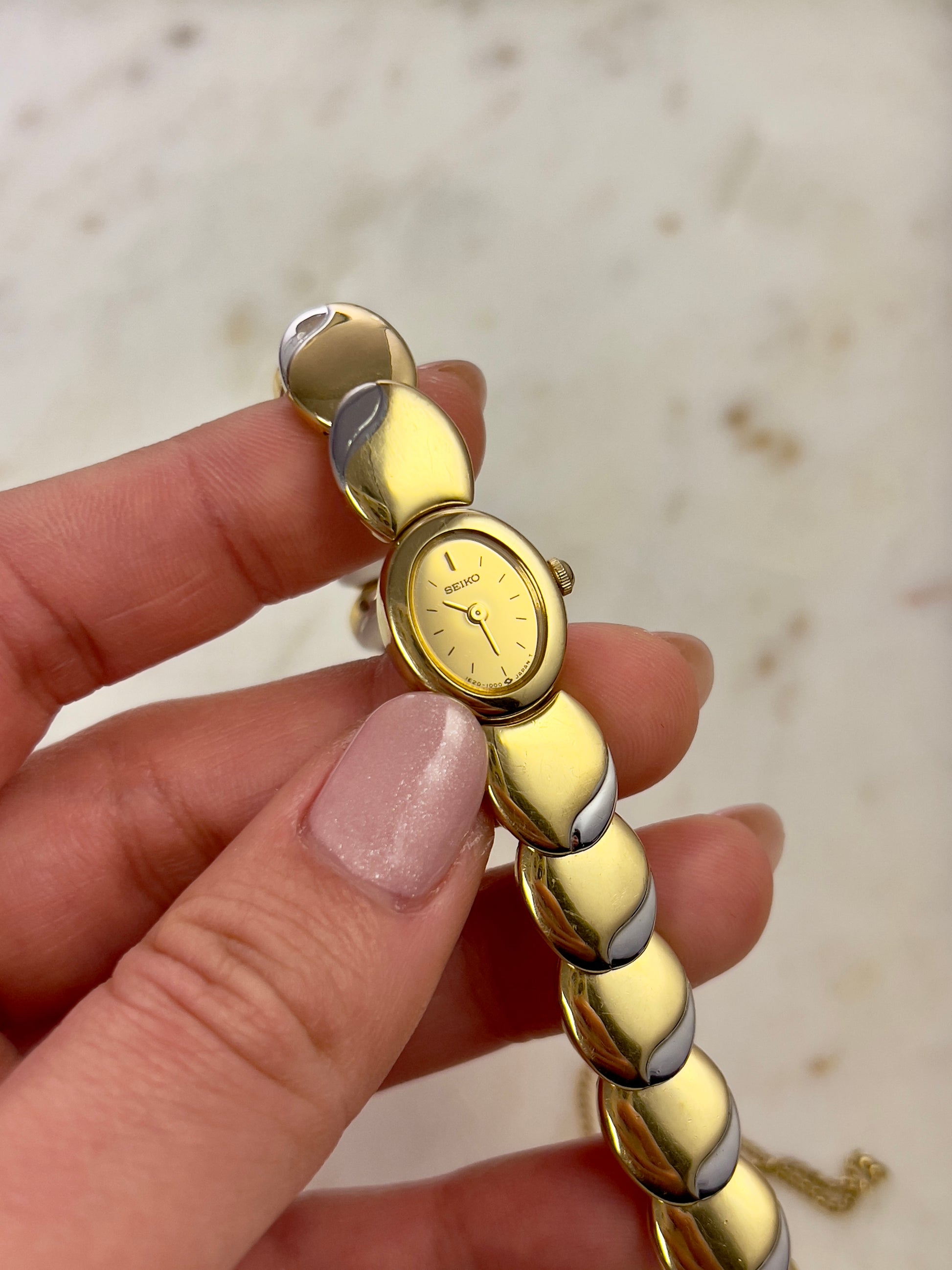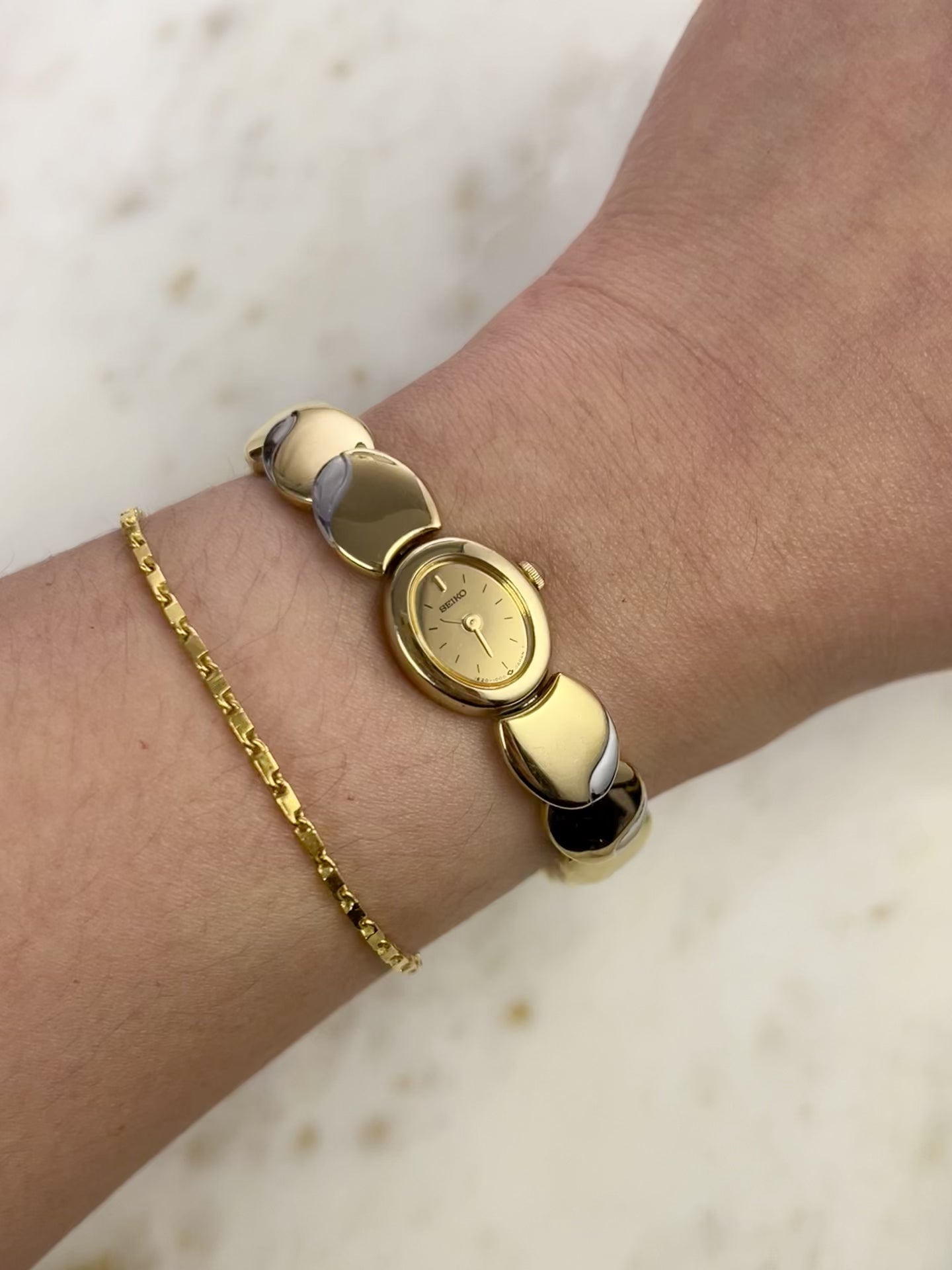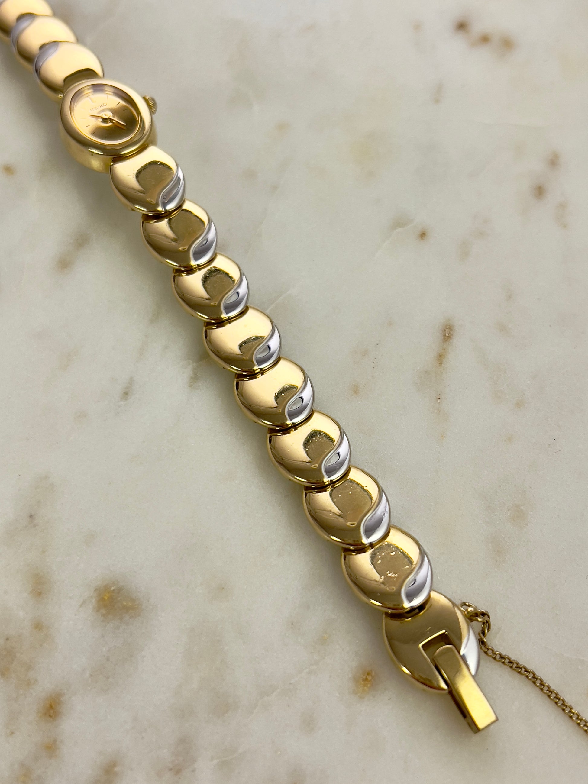Like something out of a fairytale jewel box, this vintage Seiko timepiece wraps around the wrist in gleaming, golden rhythm. Each rounded link is shaped like a polished droplet, gently domed and almost organic in feel, catching light like liquid metal. There’s a sense of fluidity and softness to the form no harsh edges, just smooth curves that make it feel more like art than accessory.