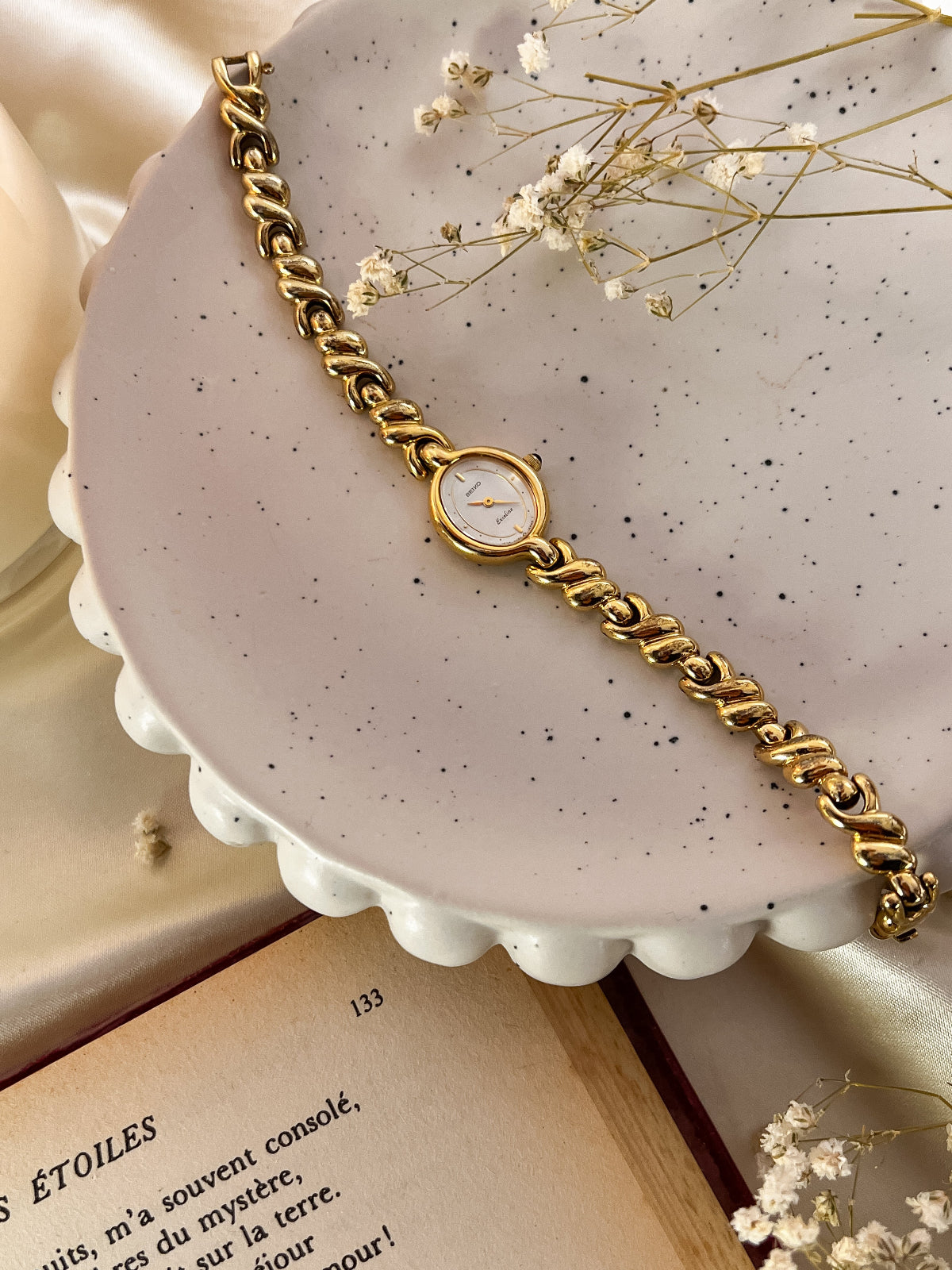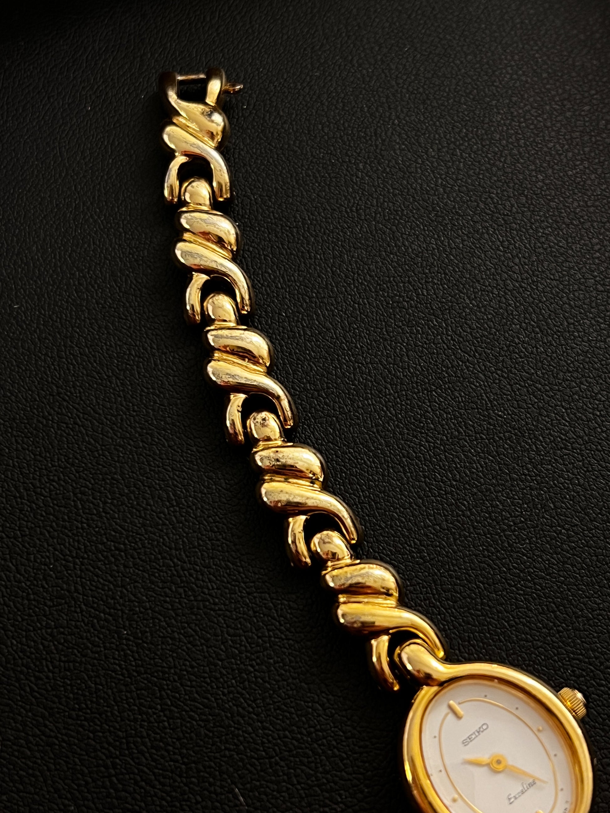A golden ripple of light, this vintage Seiko Excelline is the kind of piece that looks equally at home at a candlelit dinner or in a Parisian café sketchbook. With a unique twisted-link bracelet and softly rounded oval case, it carries the warm, high-polish glow of the 1990s without ever shouting for attention.