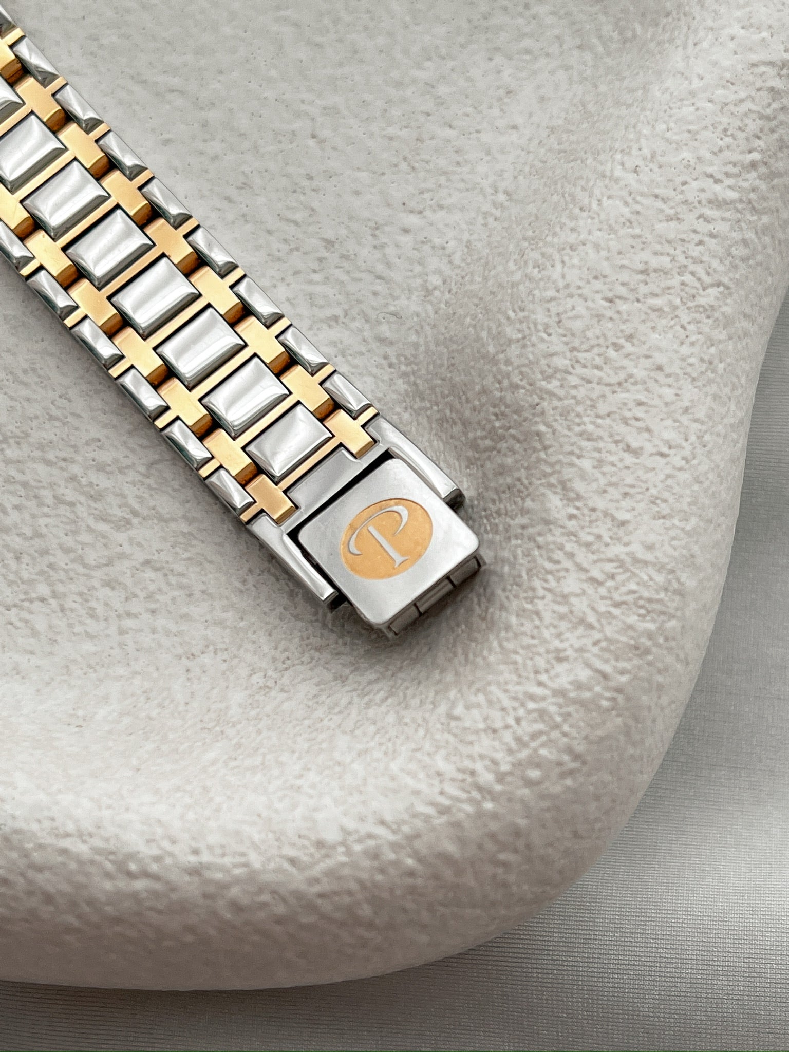The silver sunburst dial, framed by a polished Roman numeral bezel, exudes a timeless charm, while the gold-tone accents and geometric markers add a subtle touch of uniqueness. The two-tone bracelet—featuring a striking mix of gold and stainless steel—complements both warm and cool jewelry tones, making it a versatile addition to your collection.