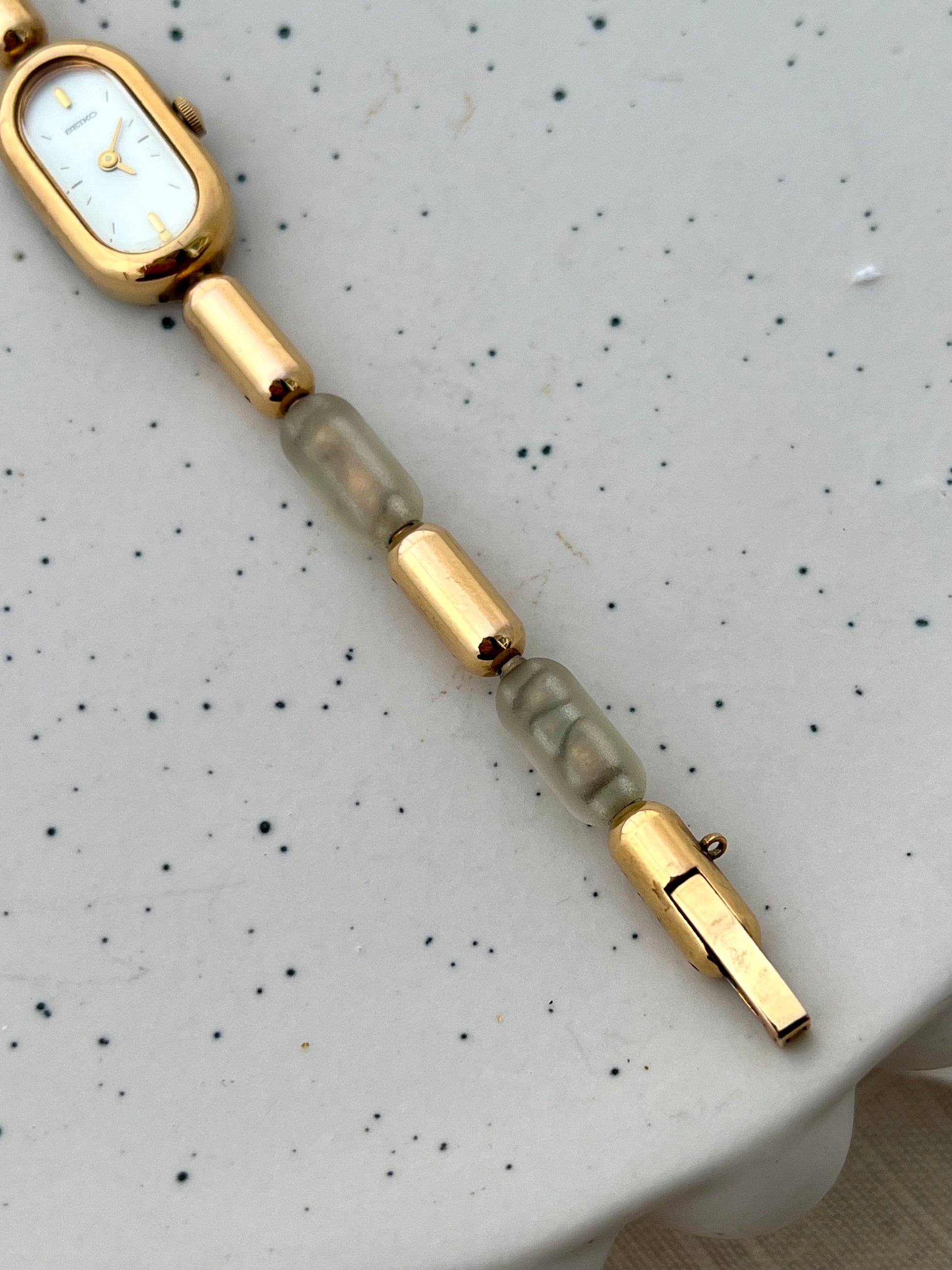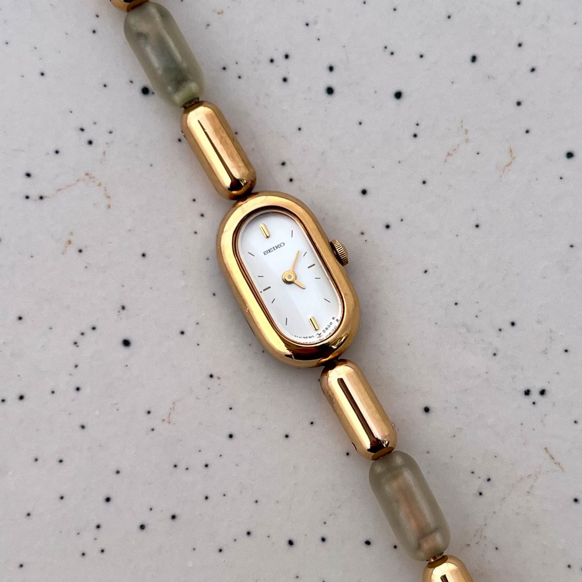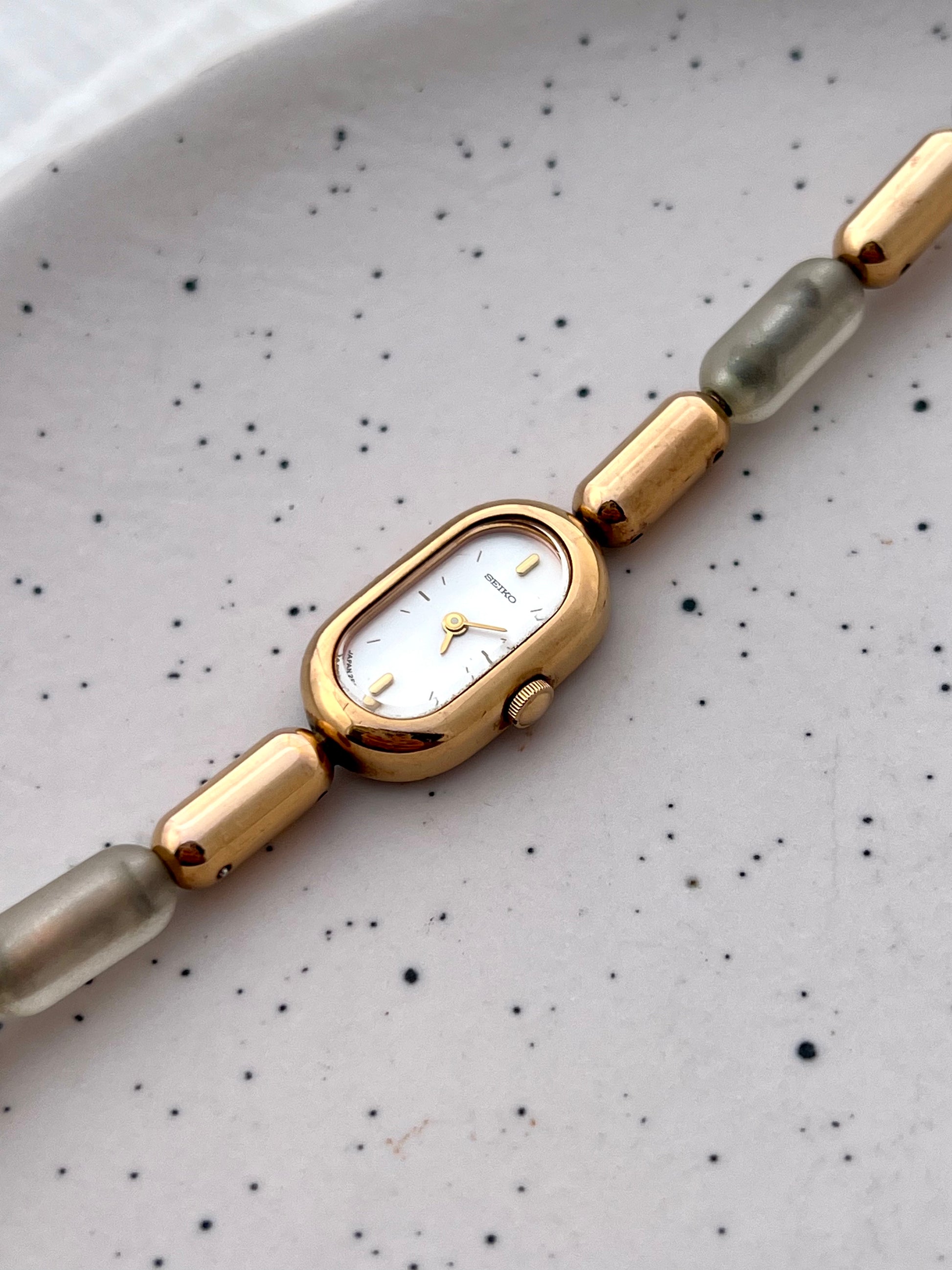 This Seiko ladies watch carries an elegant capsule shaped case in polished gold tone, framing a clean white dial with minimalist gilt hands and indices. Its bracelet is a unique composition of cylindrical gold links paired with translucent resin segments, creating a light and modern jewellery like effect that is rarely seen in vintage Seiko designs. A refined yet unconventional timepiece, it offers both collectability and everyday elegance.