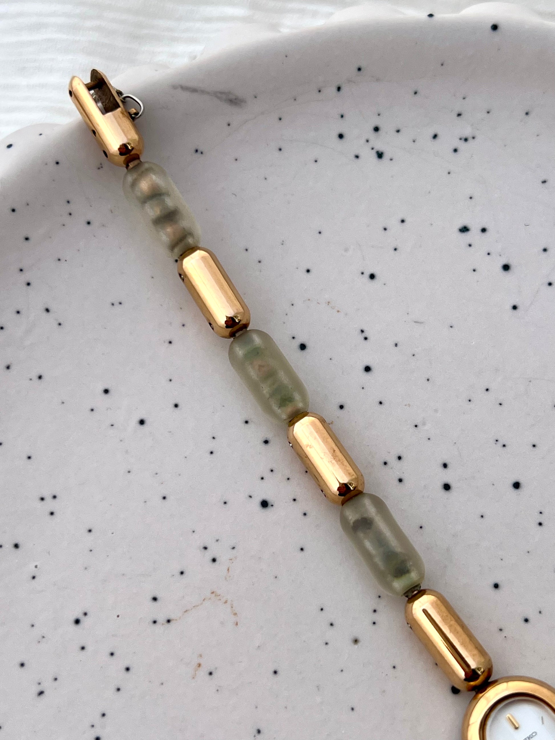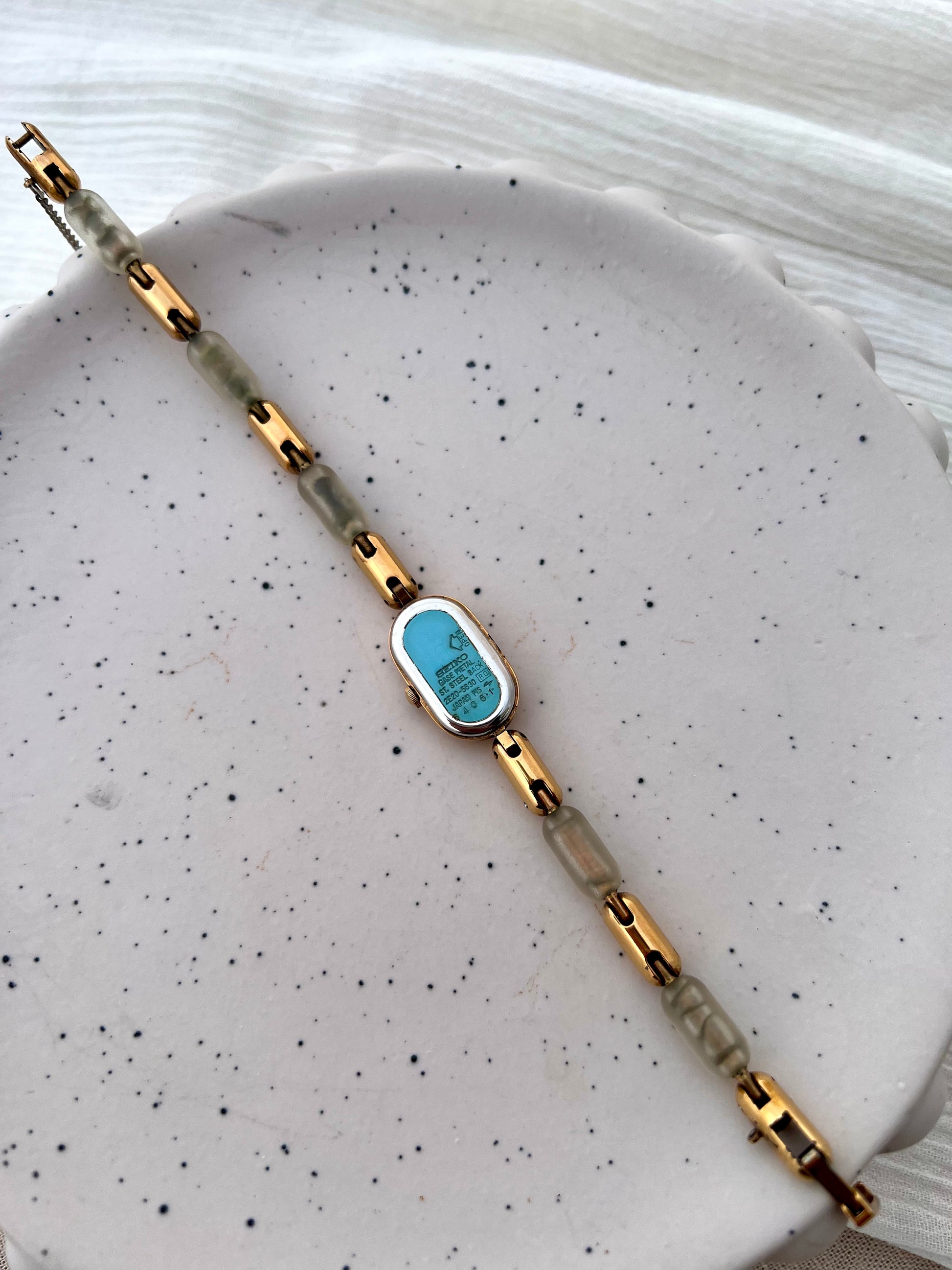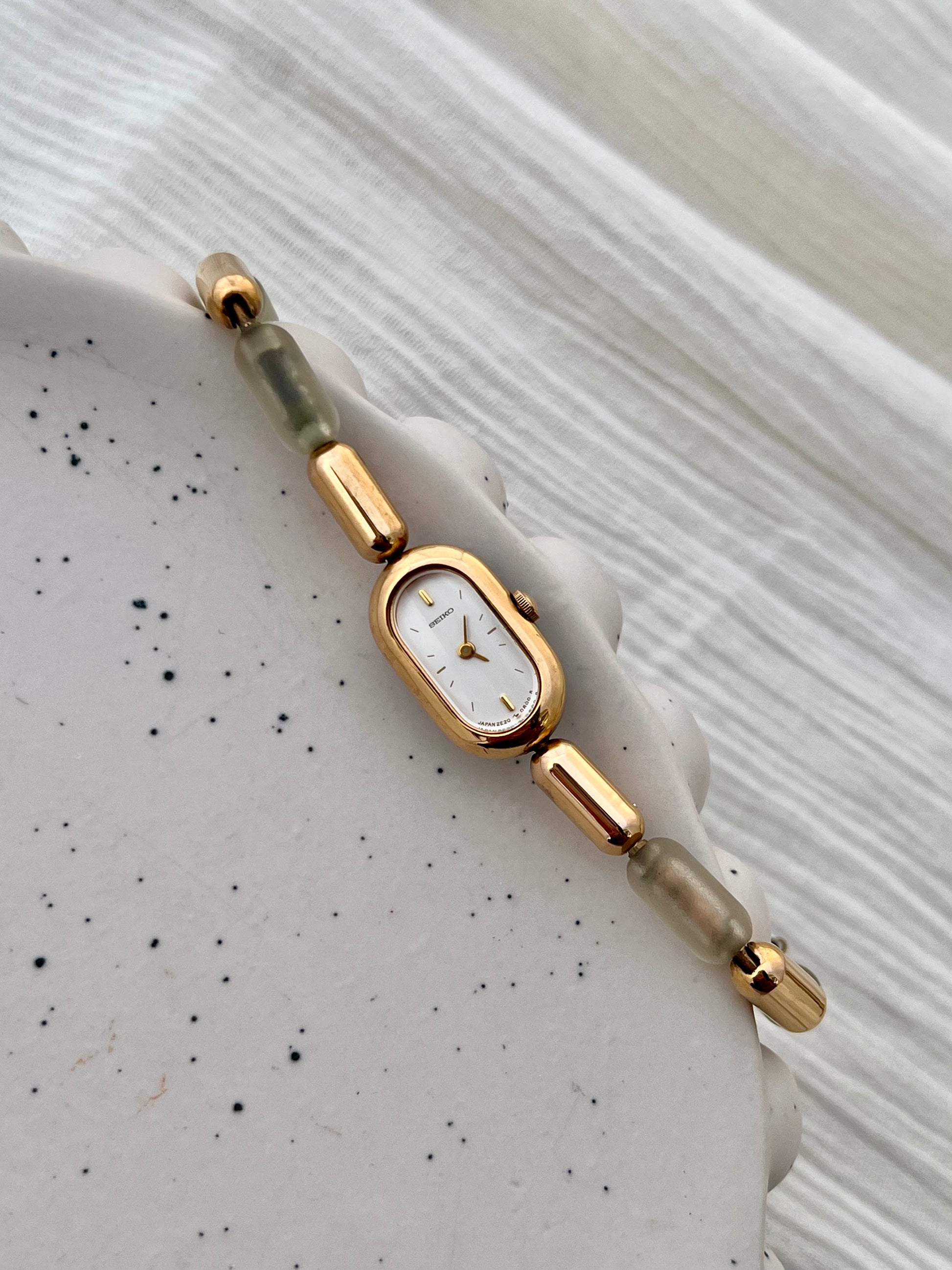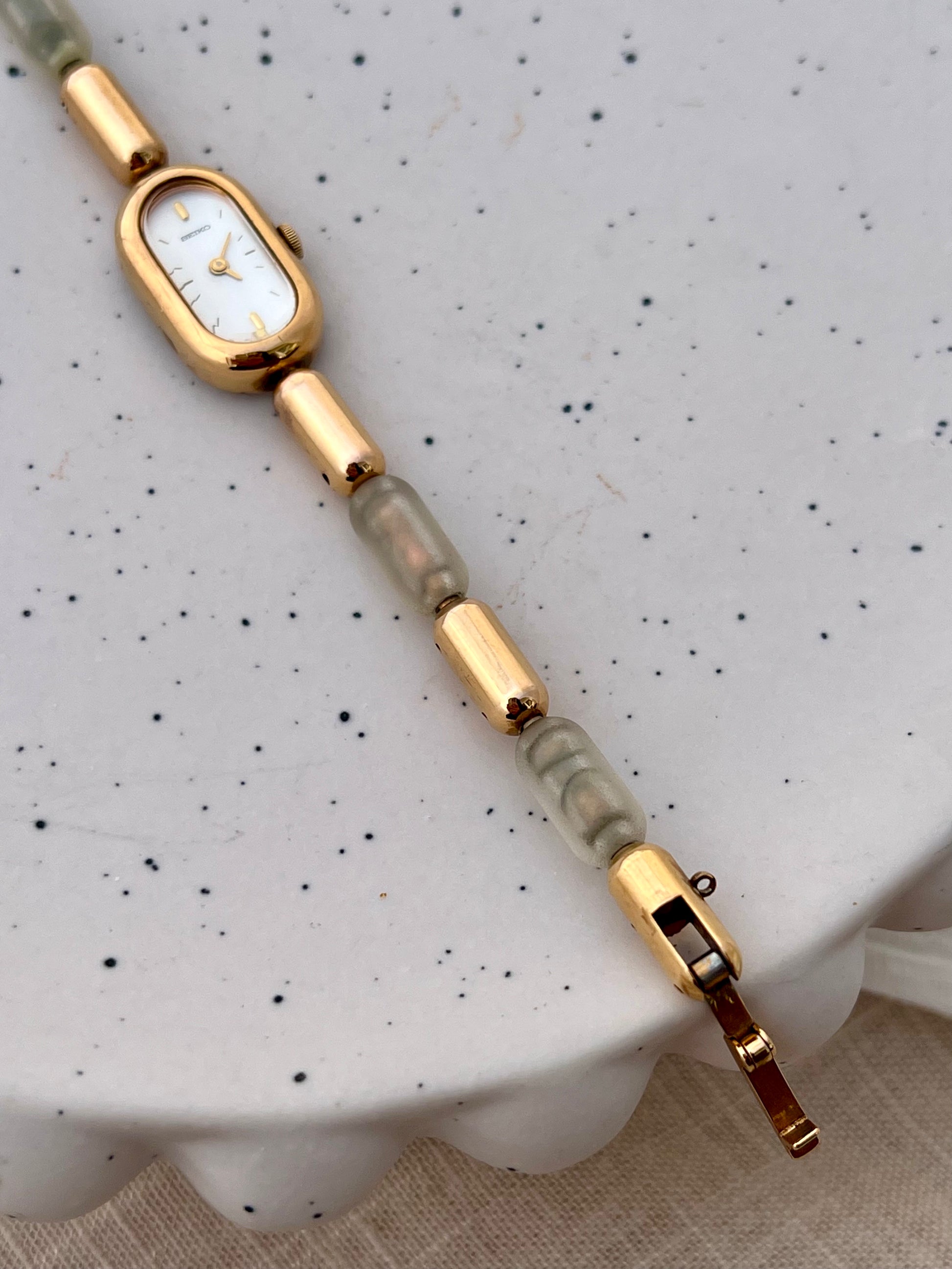 This Seiko ladies watch carries an elegant capsule shaped case in polished gold tone, framing a clean white dial with minimalist gilt hands and indices. Its bracelet is a unique composition of cylindrical gold links paired with translucent resin segments, creating a light and modern jewellery like effect that is rarely seen in vintage Seiko designs. A refined yet unconventional timepiece, it offers both collectability and everyday elegance.