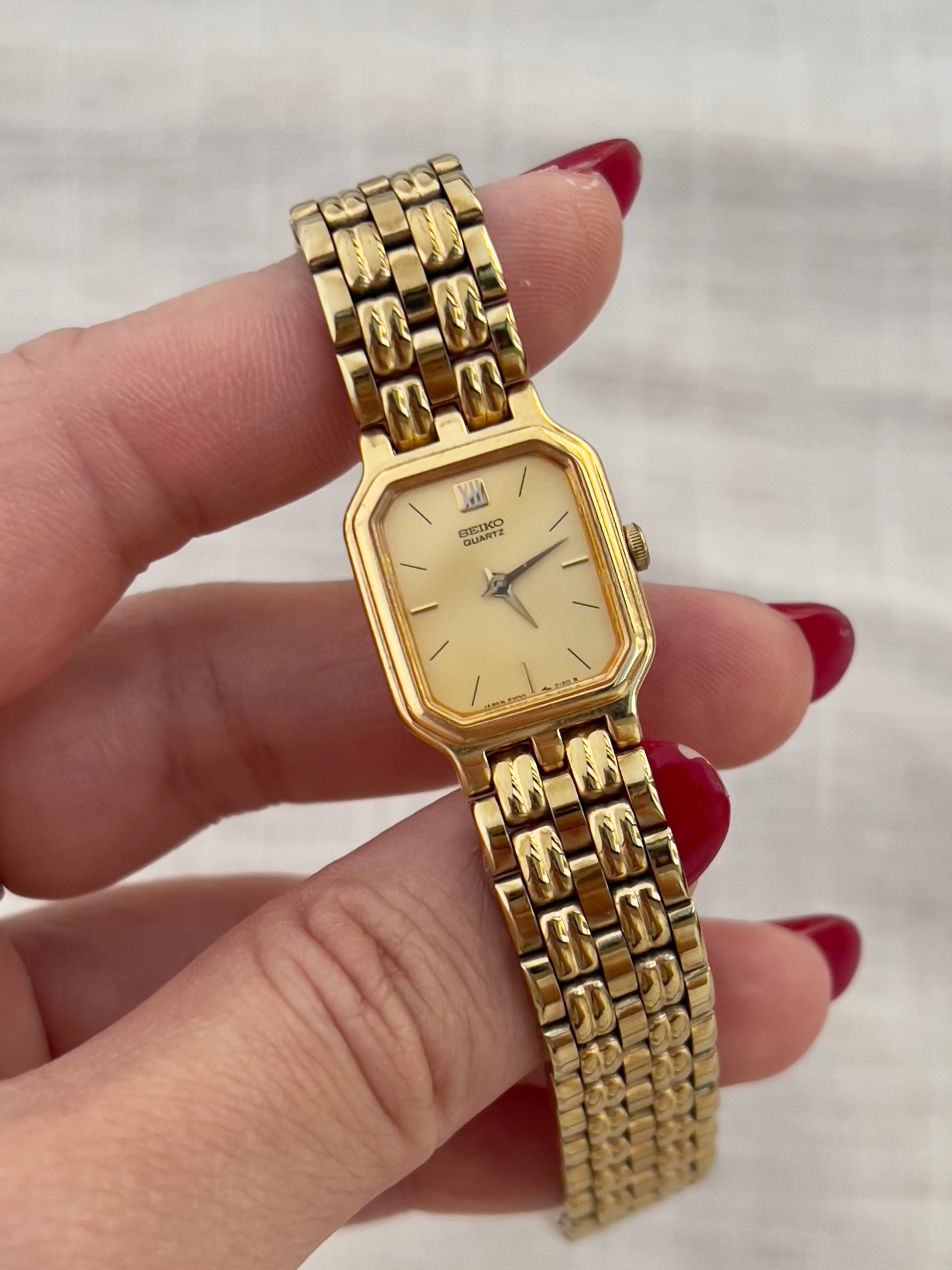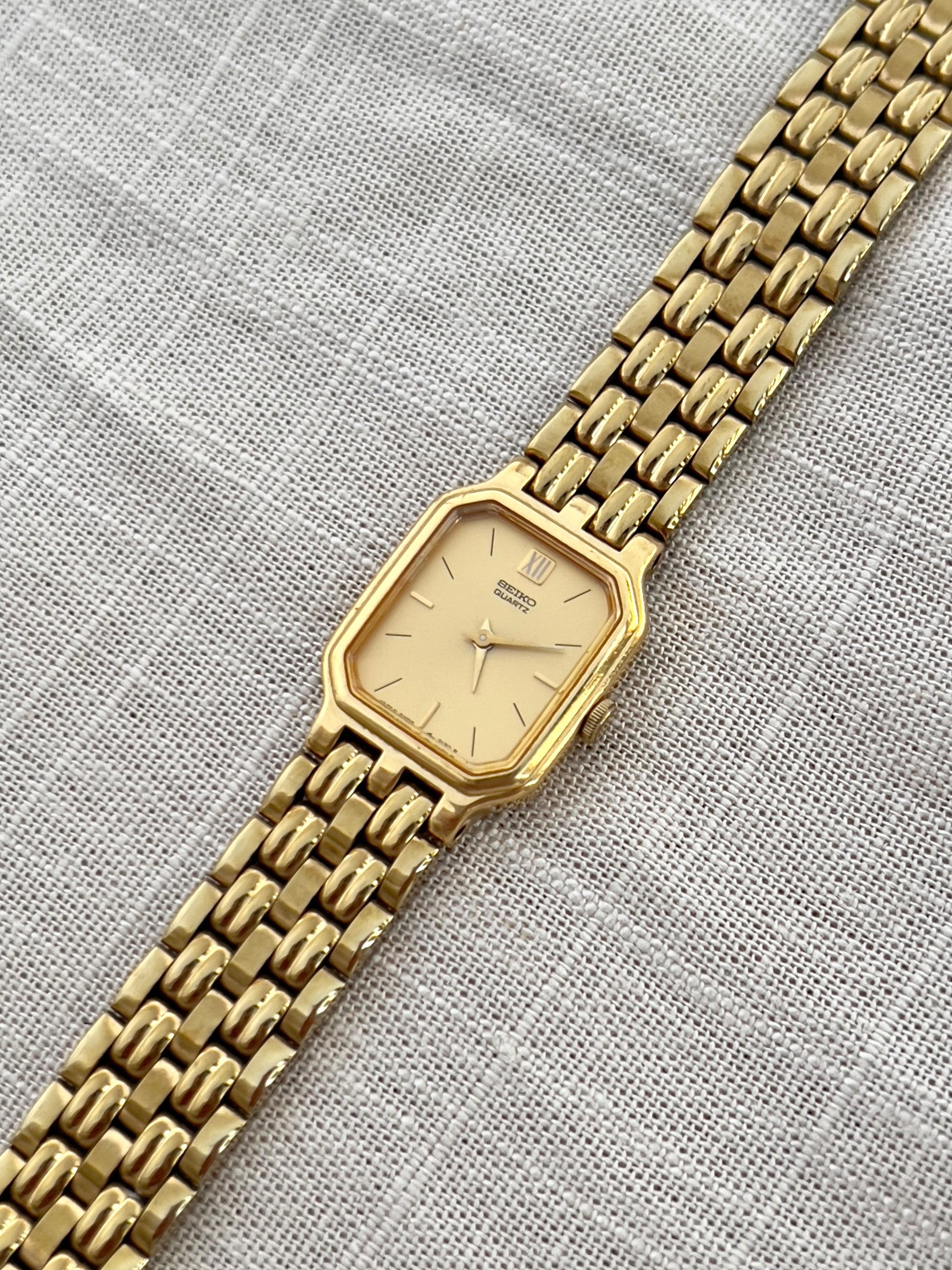 A sleek vintage Seiko in the classic tank watch silhouette minimalist, refined, and undeniably elegant. With its all-gold finish and slim rectangular case, this piece brings a subtle vintage luxe to any outfit. Perfect for stacking or wearing solo as a standout detail.
