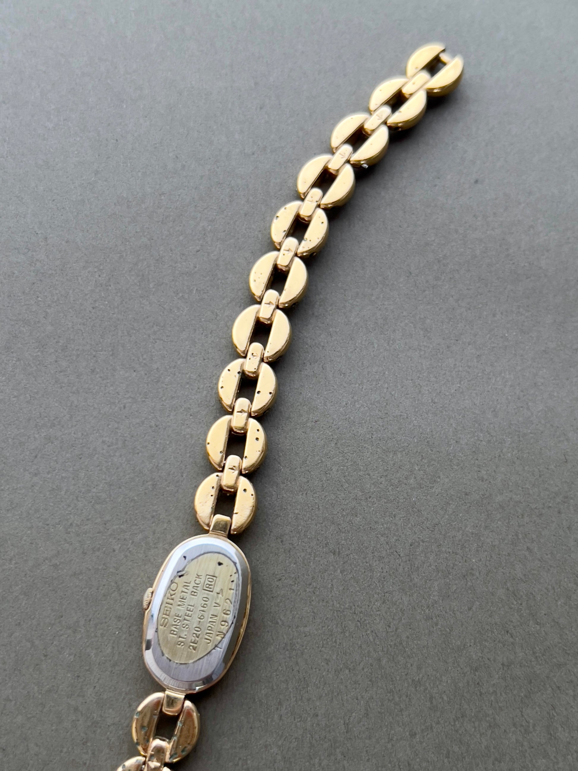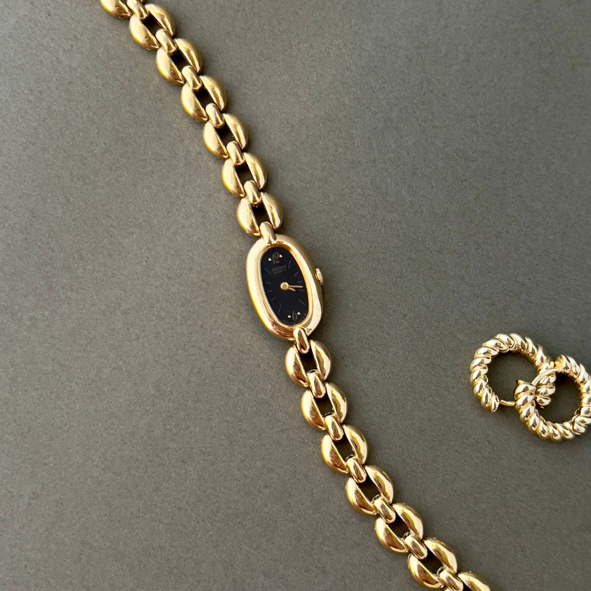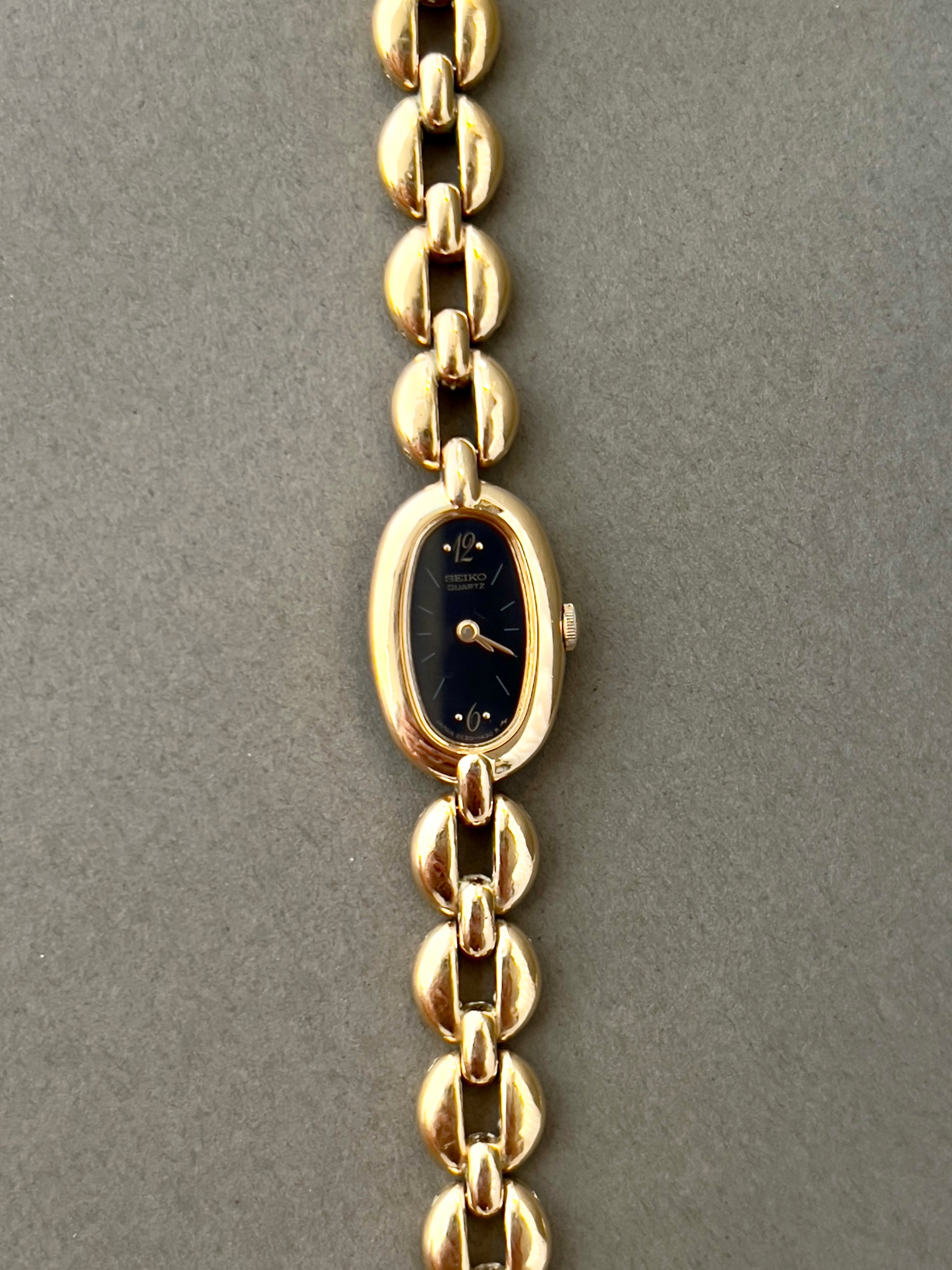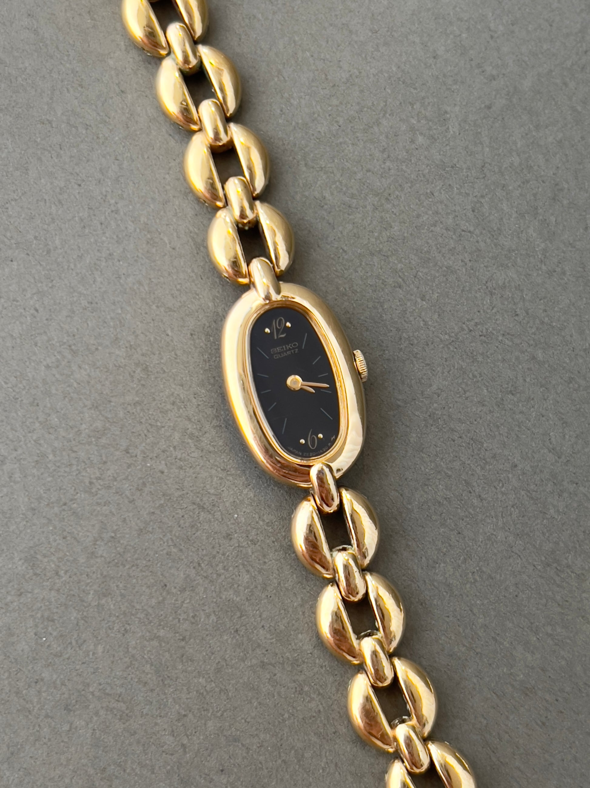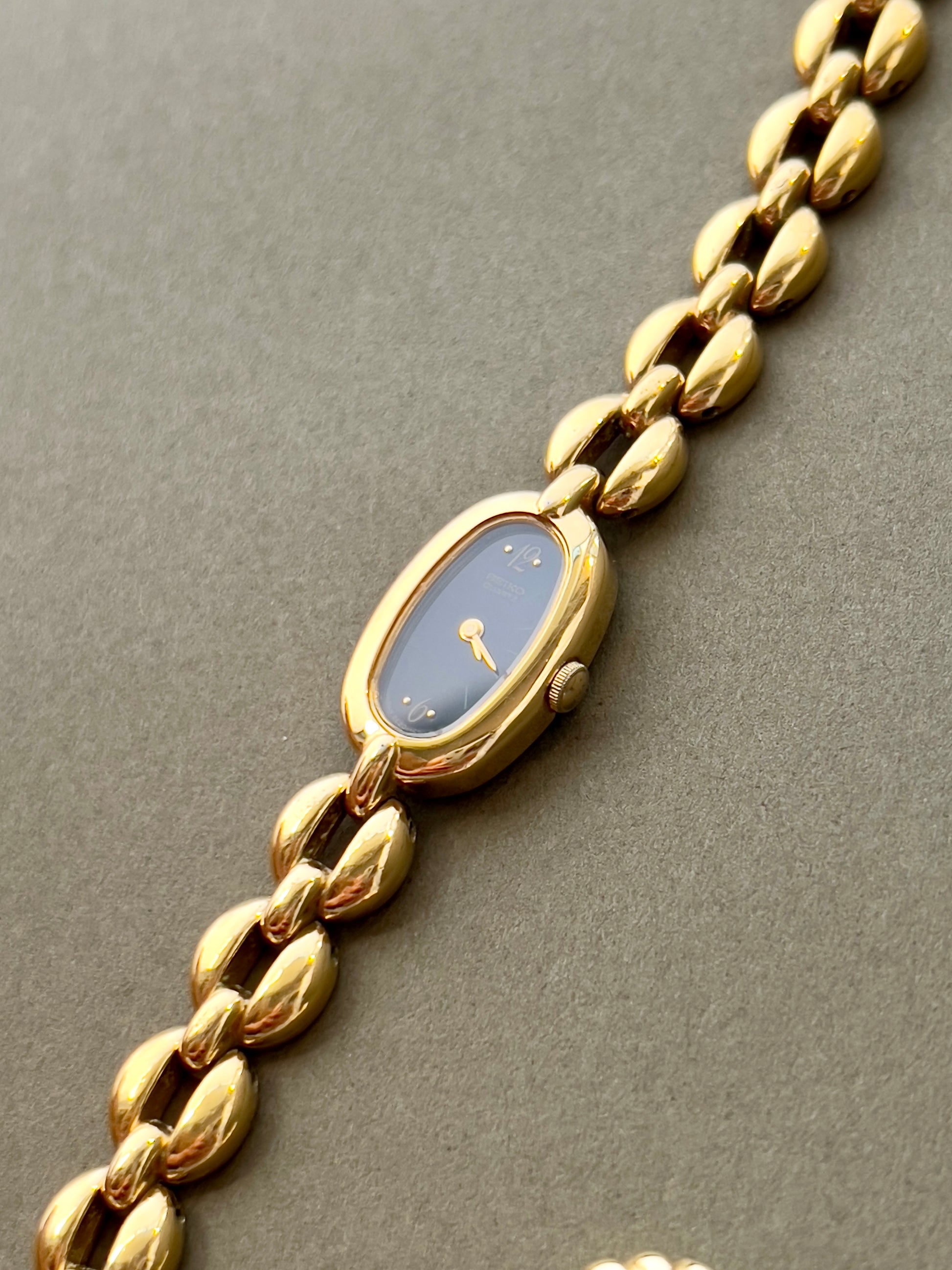 This dainty Seiko ladies watch blends quiet glamour with a sleek, modern silhouette. The elongated oval case is finished in a polished gold tone and set against a jet black dial, creating a striking contrast that’s both minimal and refined. A fine gold handset and subtle hour markers preserve the dial’s simplicity, while the bracelet—crafted in smooth, petal-like links—flows elegantly around the wrist.