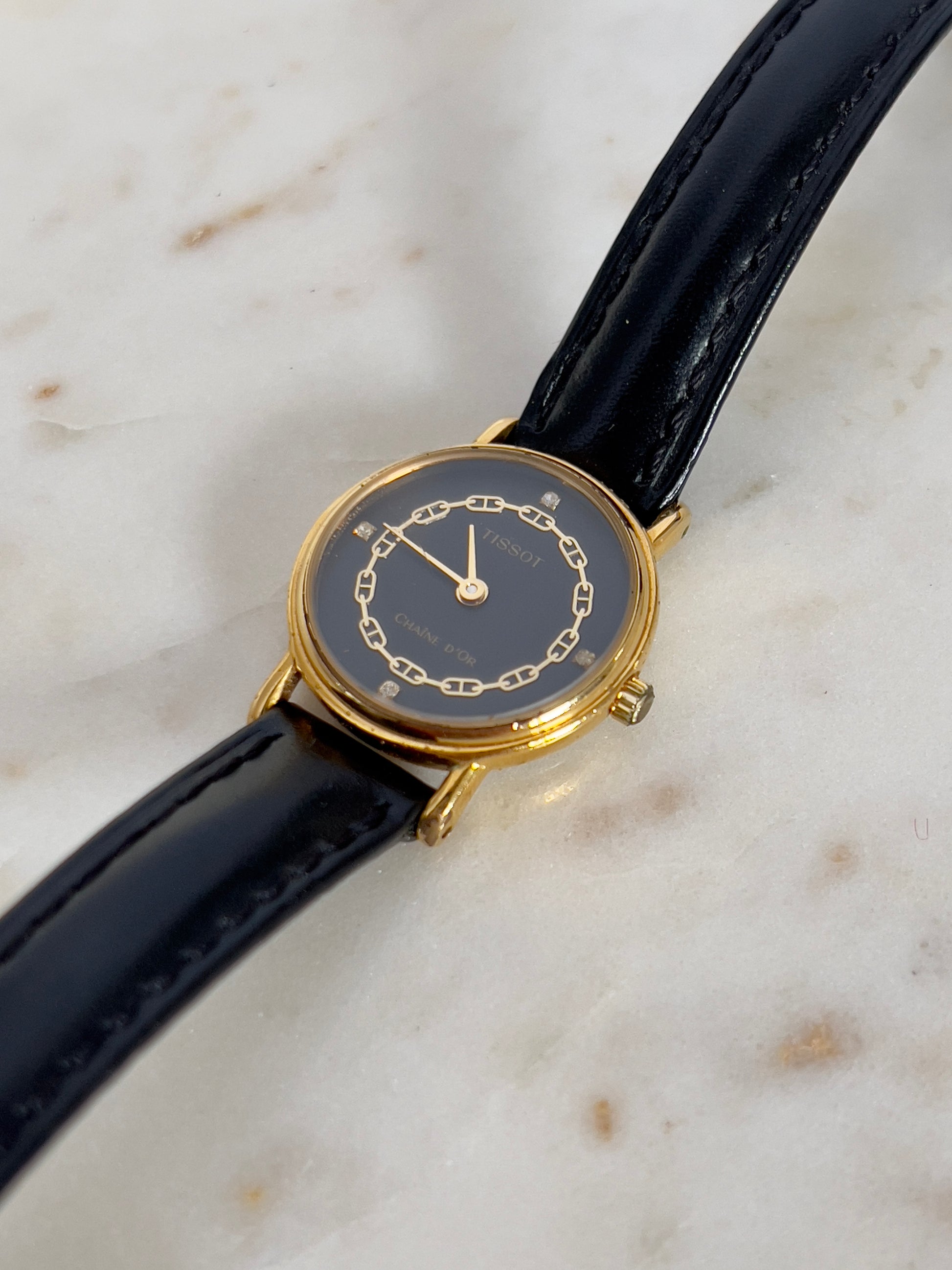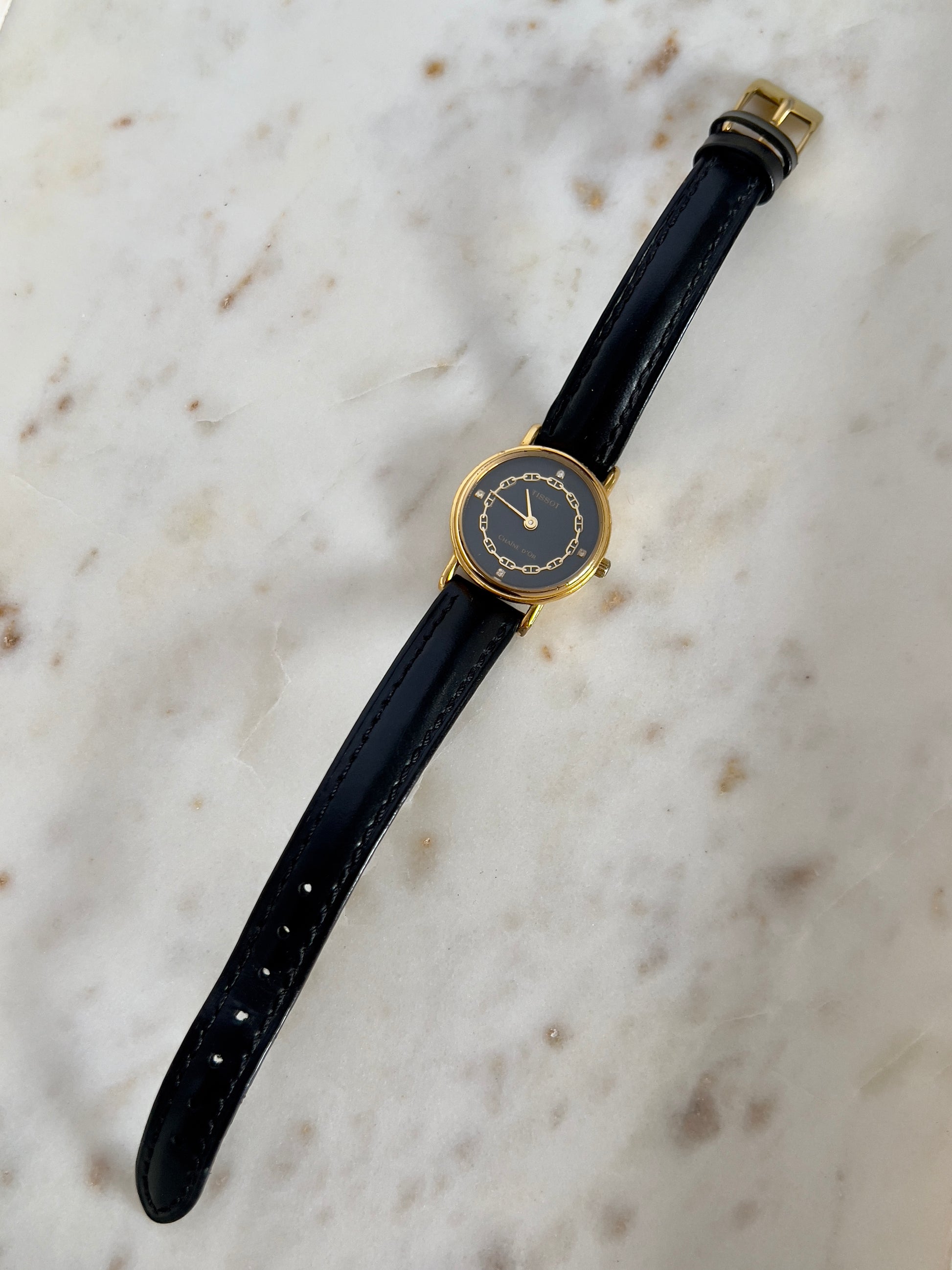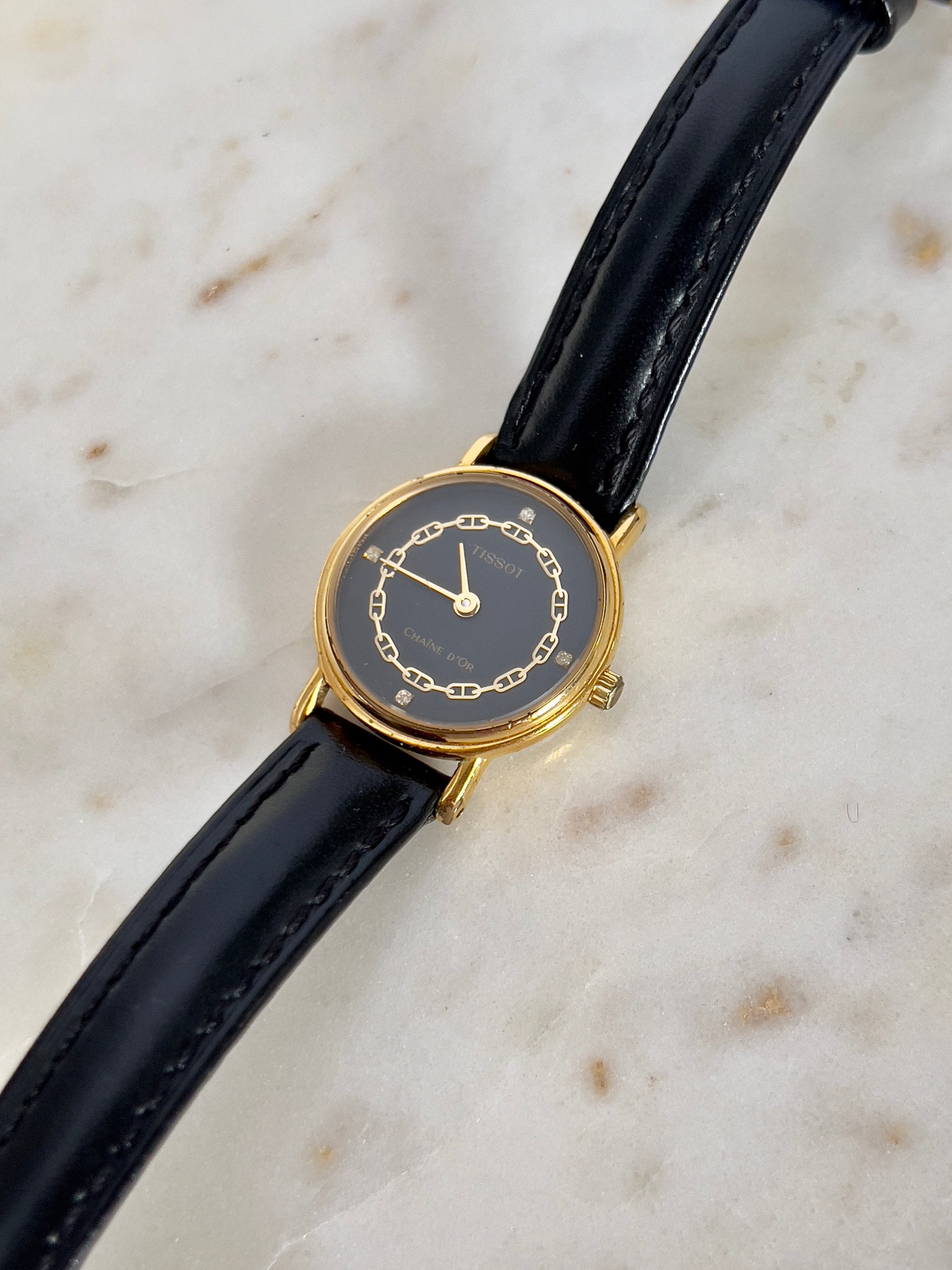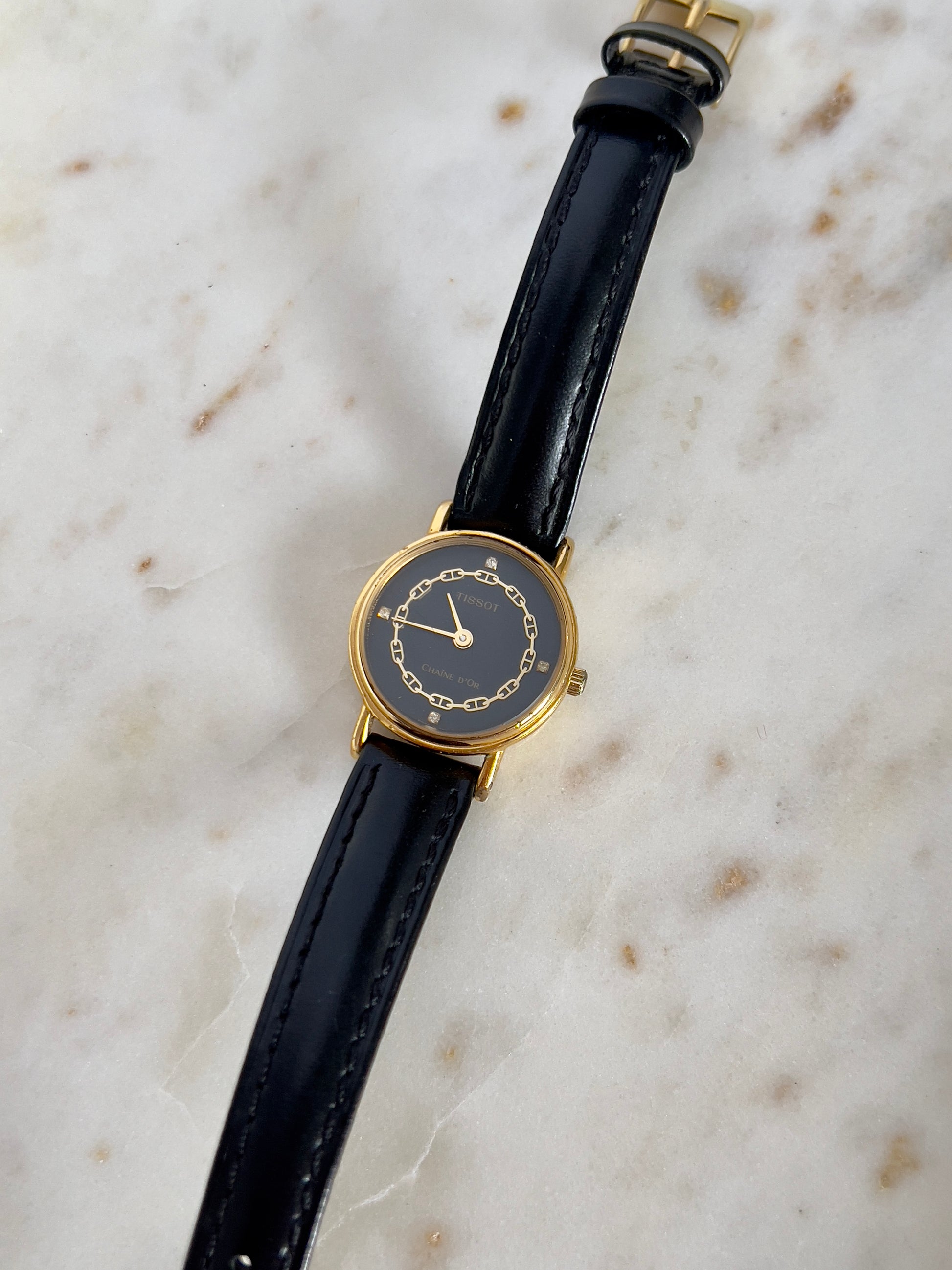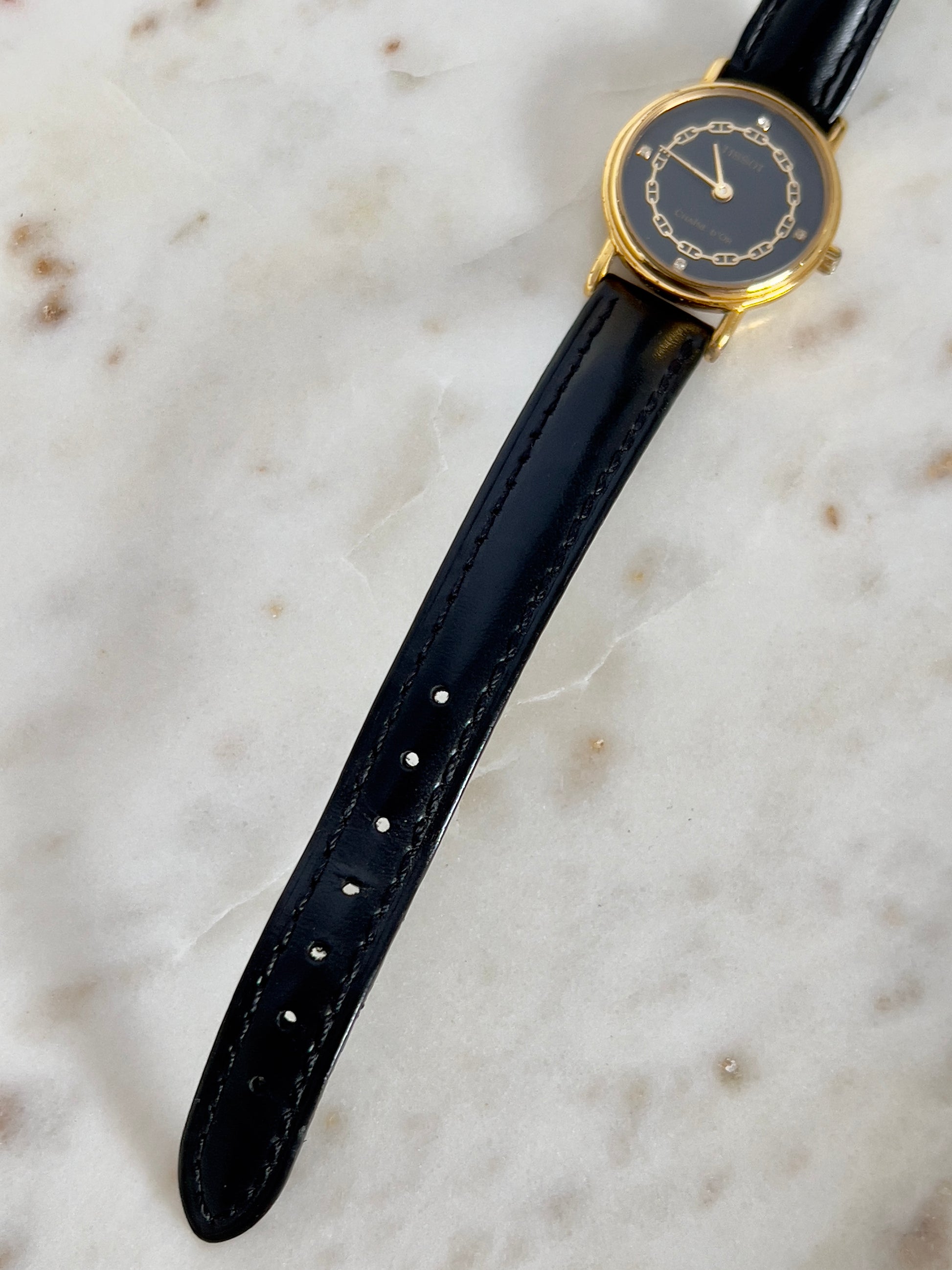 This elegant Tissot Chaîne d’Or is a refined example of Swiss sophistication. The round gold-tone case frames a deep black dial adorned with a delicate chain motif in gilt, echoing the name “Chaîne d’Or”, French for “Golden Chain.” Subtle diamond-shaped accents serve as hour markers, enhancing the watch’s jewellery-like charm.