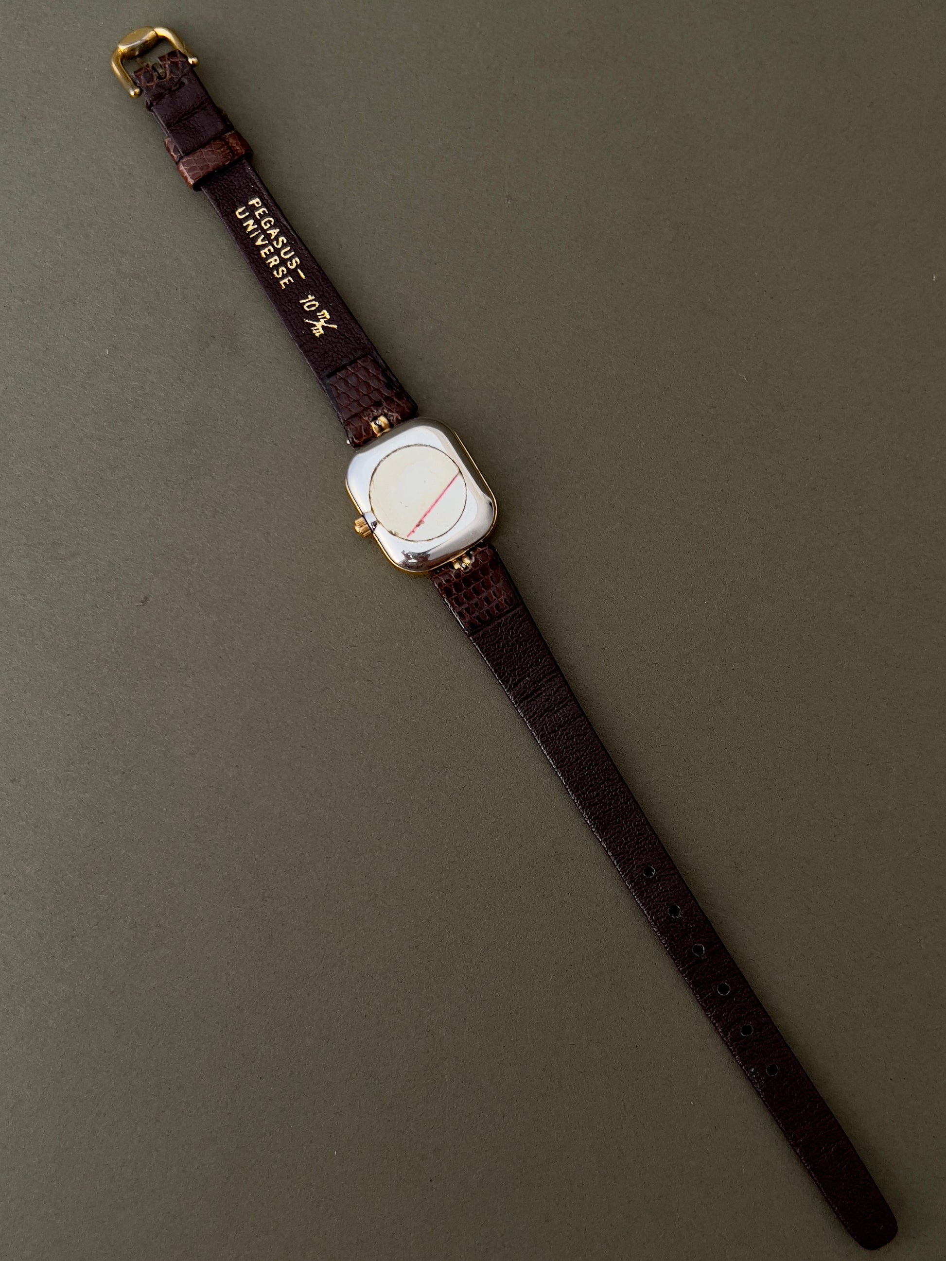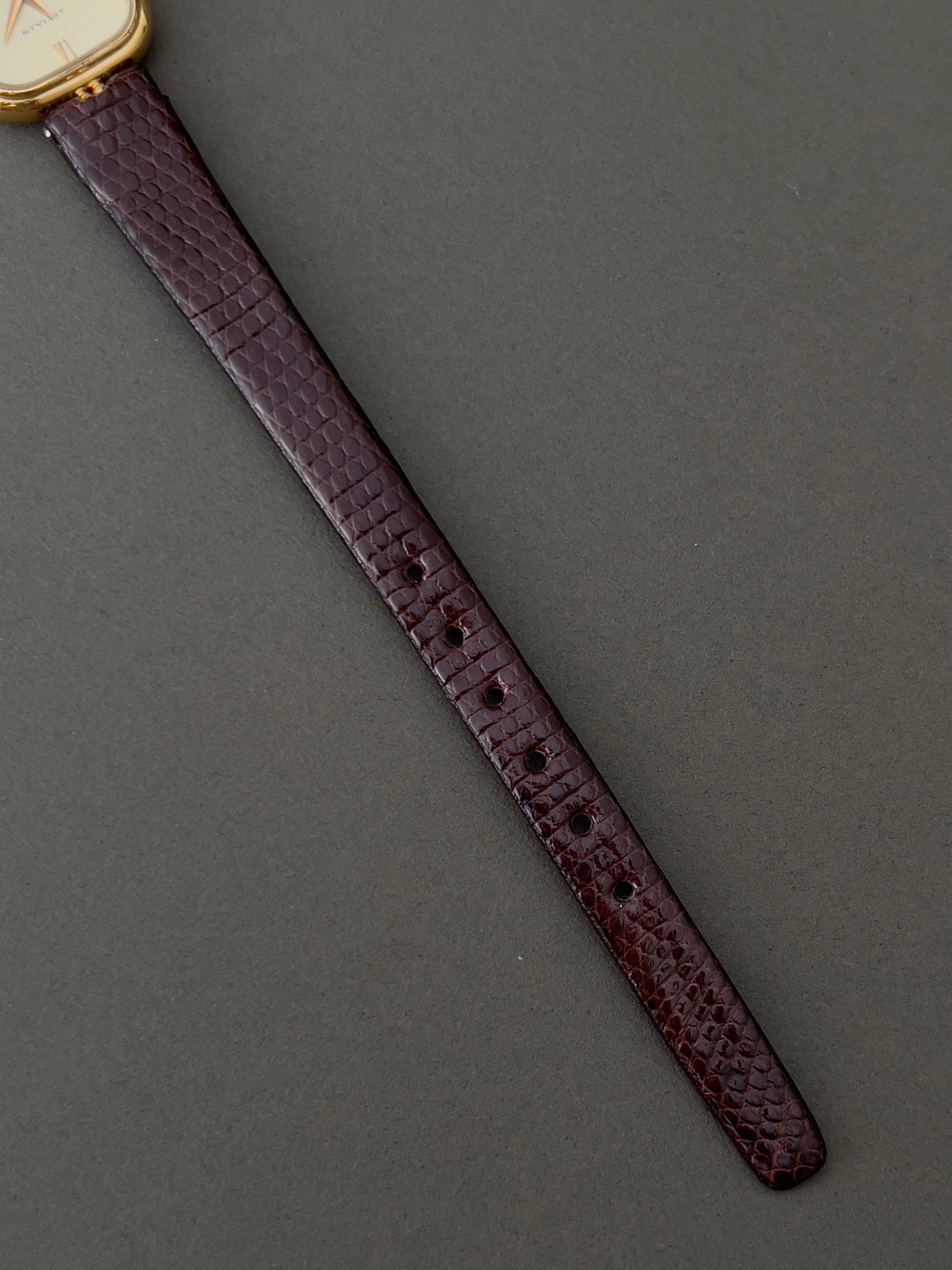 The proportions are dainty, the edges softened by gentle curves, and the crown fluted for a touch of texture. A brown leather strap in a scaled pattern completes the silhouette, giving the watch a jewellery-like presence on the wrist. A study in restraint, the Tissot Stylist reflects the elegance of Swiss minimalism, made for women who appreciate subtle sophistication and vintage charm.