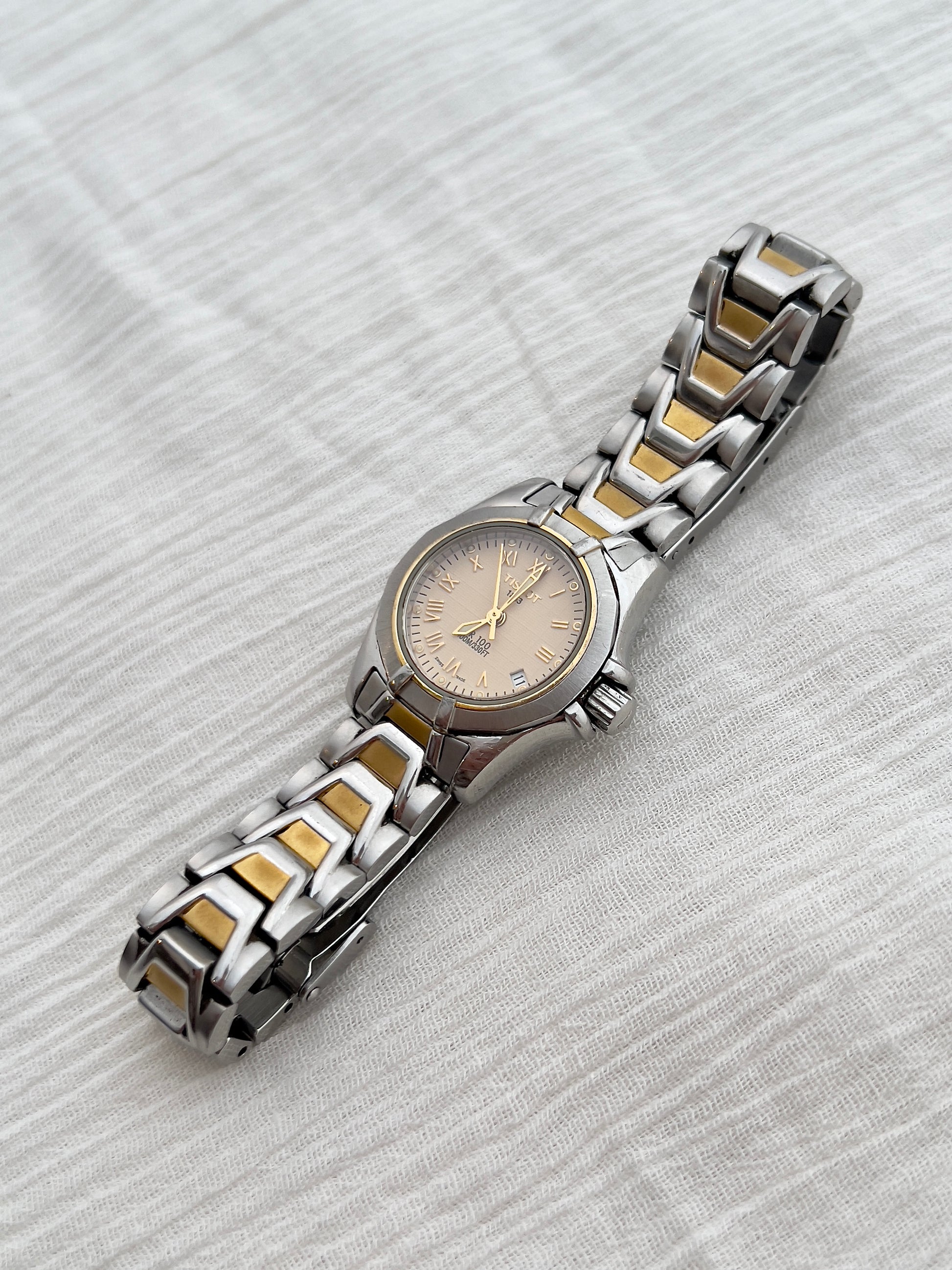 Confident yet refined, this Tissot PR100 radiates bold character through every polished surface. The champagne dial glows with quiet strength, accented by Roman numerals that lend an air of enduring elegance. Its two tone bracelet, sculpted in alternating silver and gold links, creates a striking rhythm that feels as fluid as jewellery yet as purposeful as fine engineering.