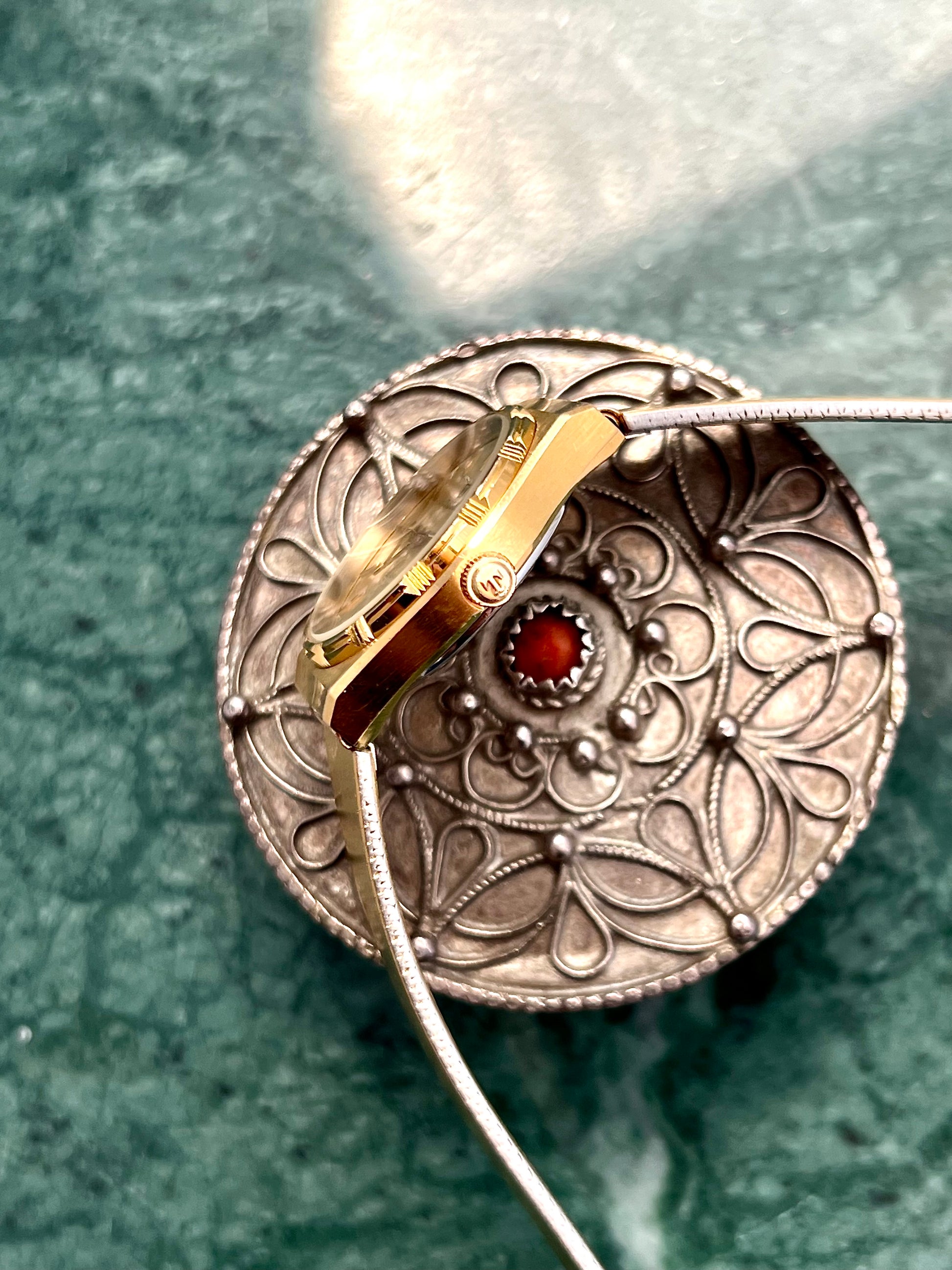 The case is compact and gently rounded, sitting low and comfortable on the wrist. The bezel has small, tasteful facets that give a touch of interest without shouting, and the way the case flows into the bracelet is where the design really shines. The bracelet tapers in a smooth line and carries a fine texture, so the whole watch reads as a single, relaxed sweep of gold from clasp to dial.