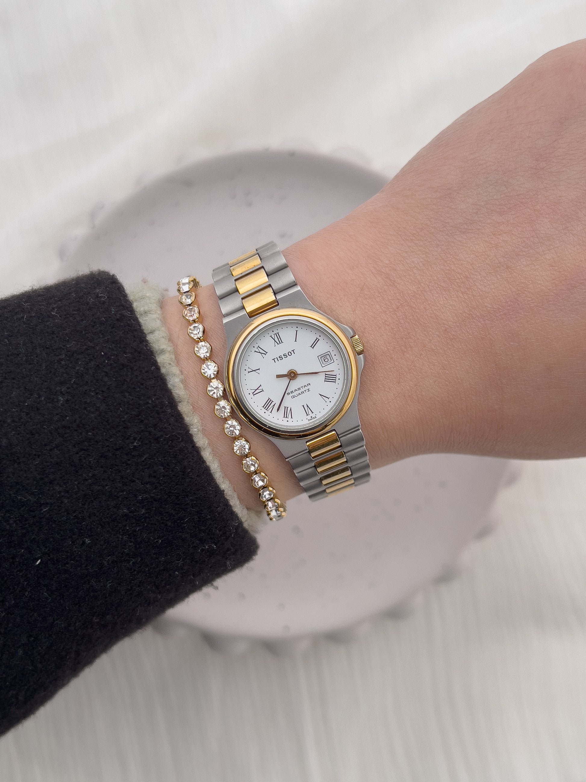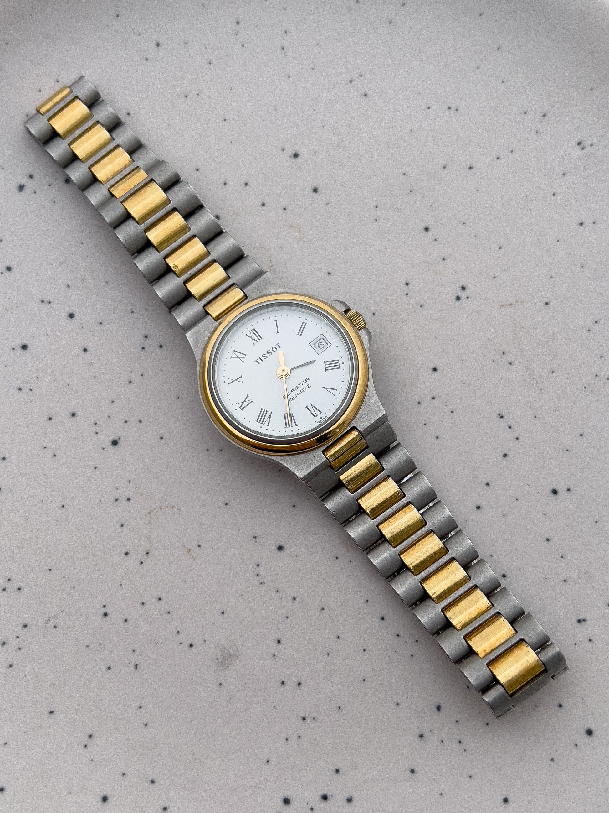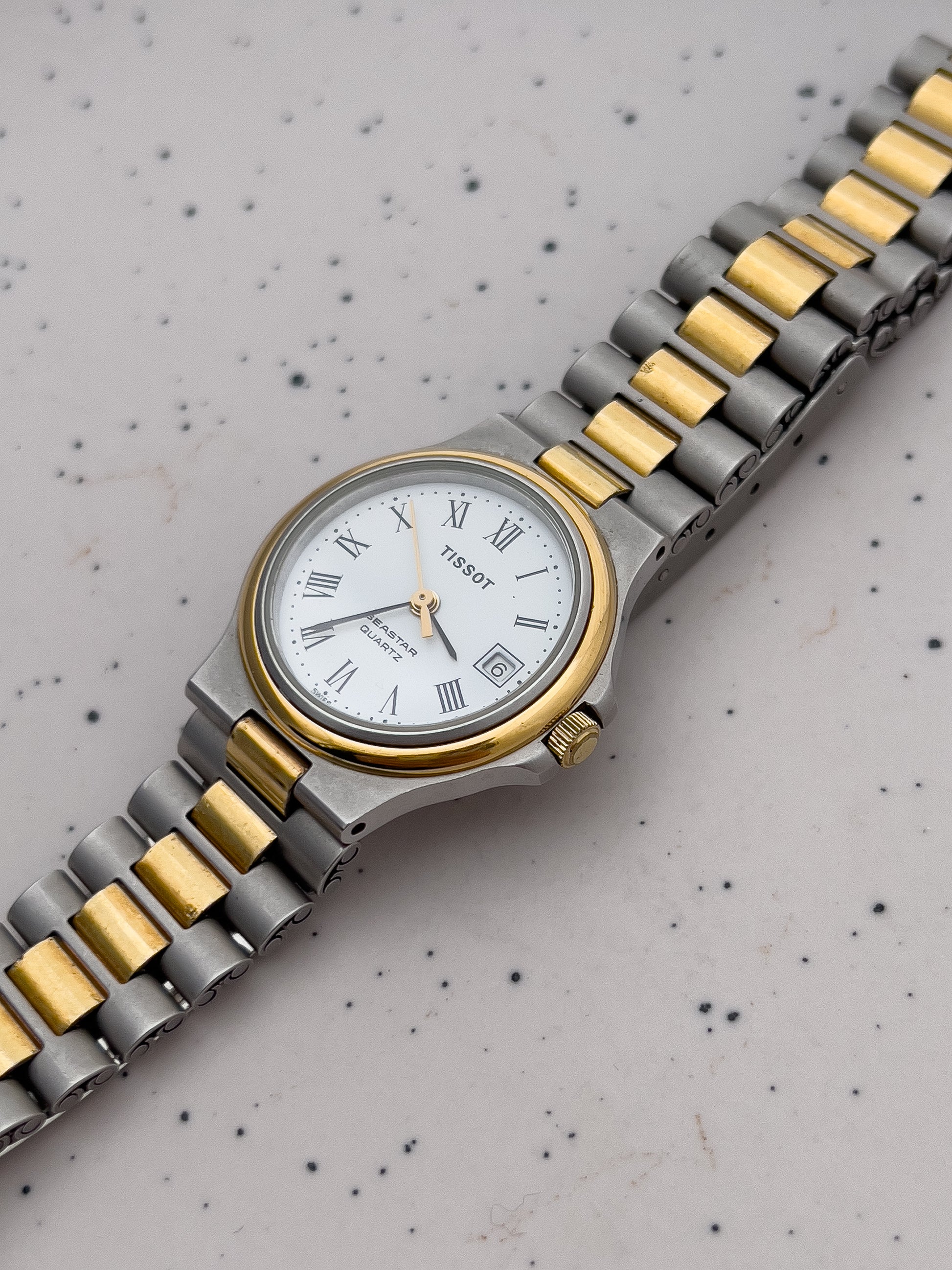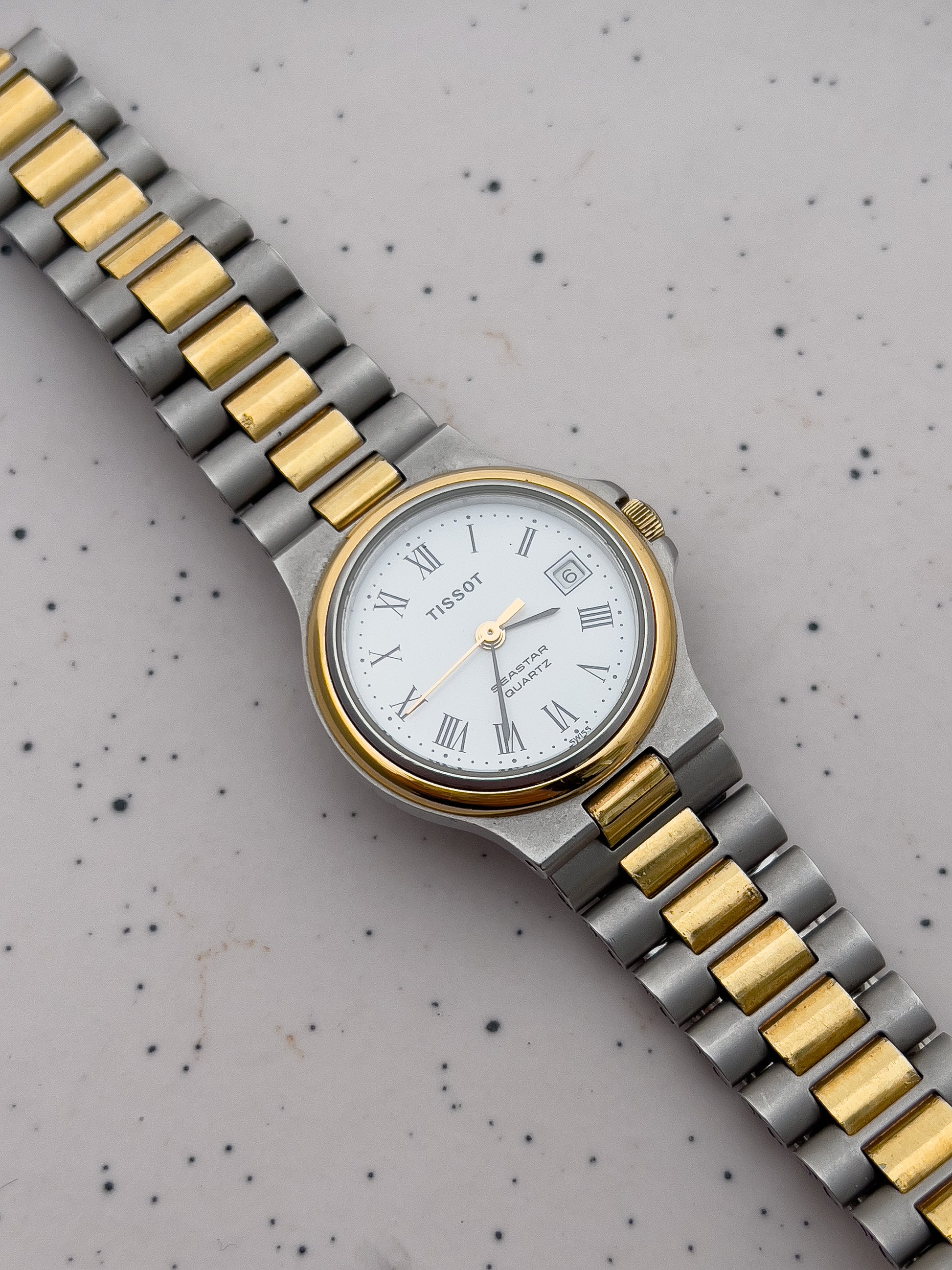 This vintage Tissot Seastar Quartz brings together classic Swiss precision and timeless design in a versatile two-tone finish. The round case is highlighted by a polished gold-tone bezel, framing a crisp white dial adorned with Roman numeral hour markers and slim golden hands. A discreet date window at three o’clock adds a practical touch, while the elegant proportions make it an easy choice for everyday refinement.