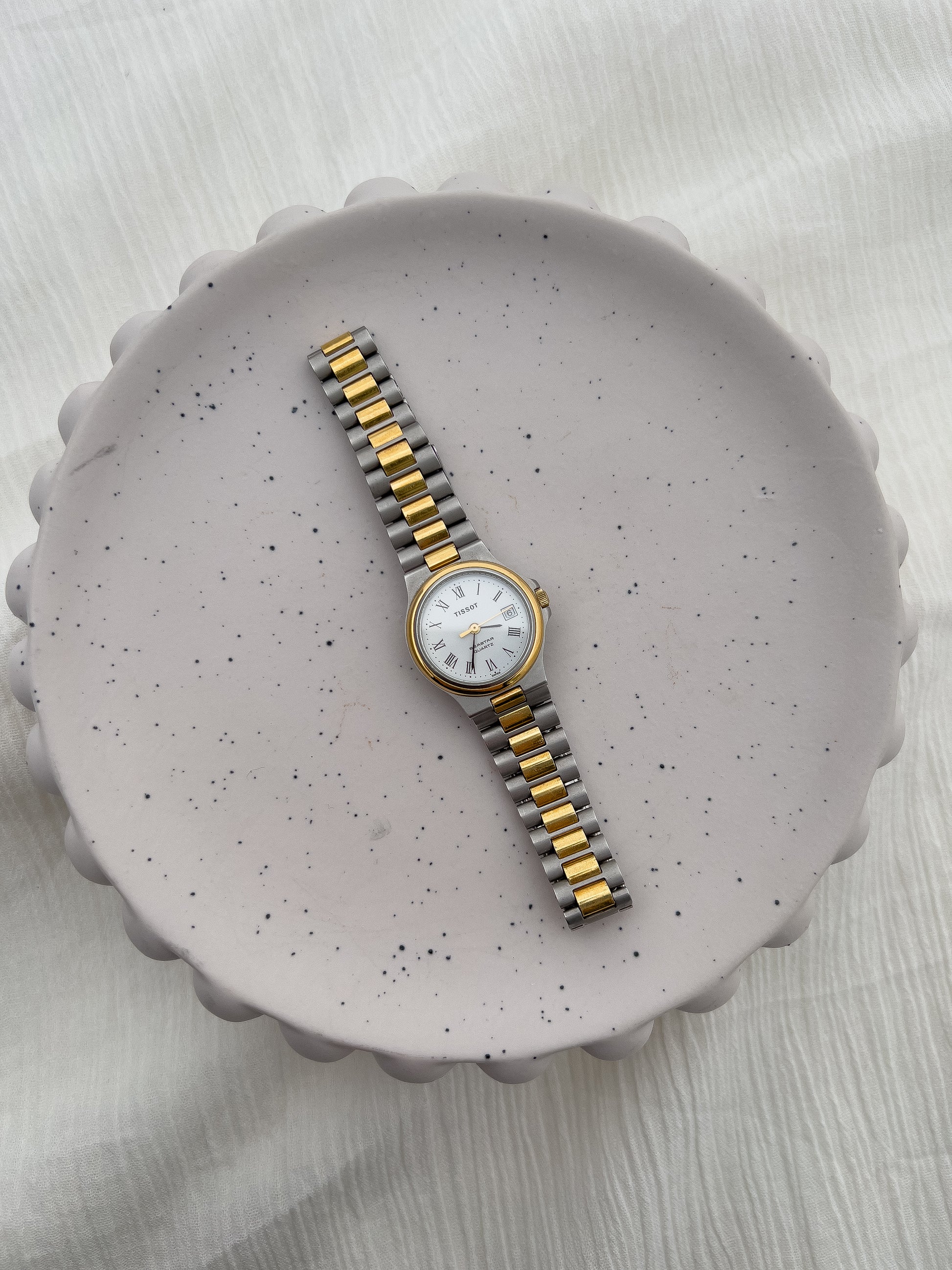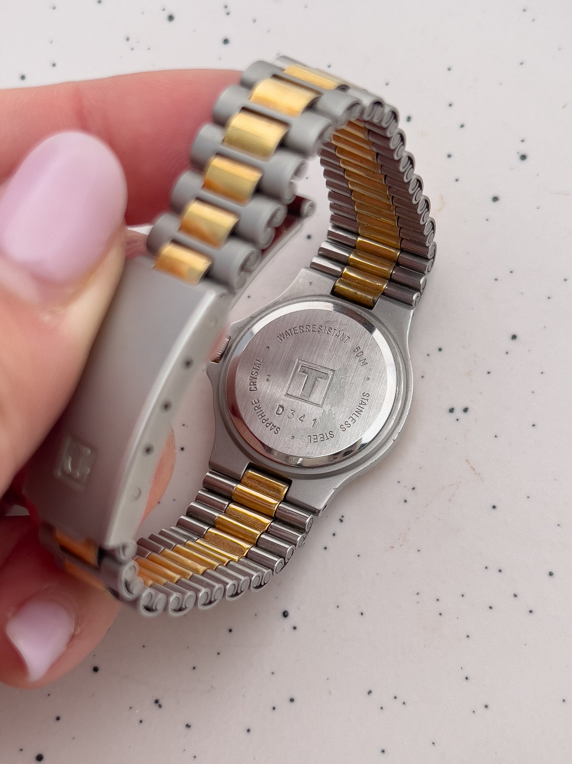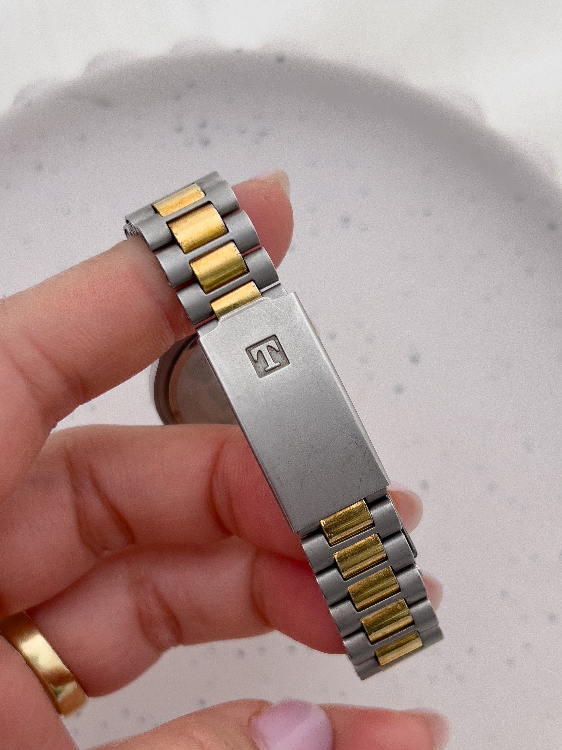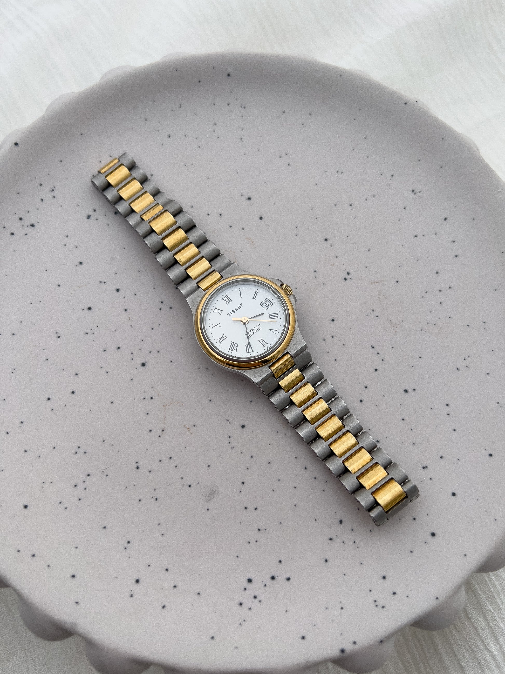 This vintage Tissot Seastar Quartz brings together classic Swiss precision and timeless design in a versatile two-tone finish. The round case is highlighted by a polished gold-tone bezel, framing a crisp white dial adorned with Roman numeral hour markers and slim golden hands. A discreet date window at three o’clock adds a practical touch, while the elegant proportions make it an easy choice for everyday refinement.