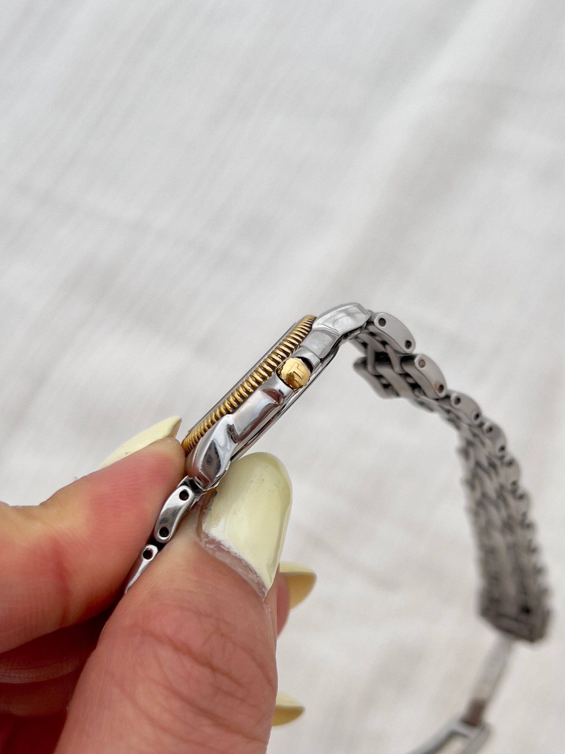 The round case presents polished shoulders with gentle crown guards, the crown repeats the bezel’s fine ridges for a harmonious rhythm. The bracelet is two tone, softly sculpted steel links punctuated by repeating ribbed gold inserts that echo the bezel, giving the watch a jewellery character that moves easily from weekday to evening. Refined, feminine, composed.