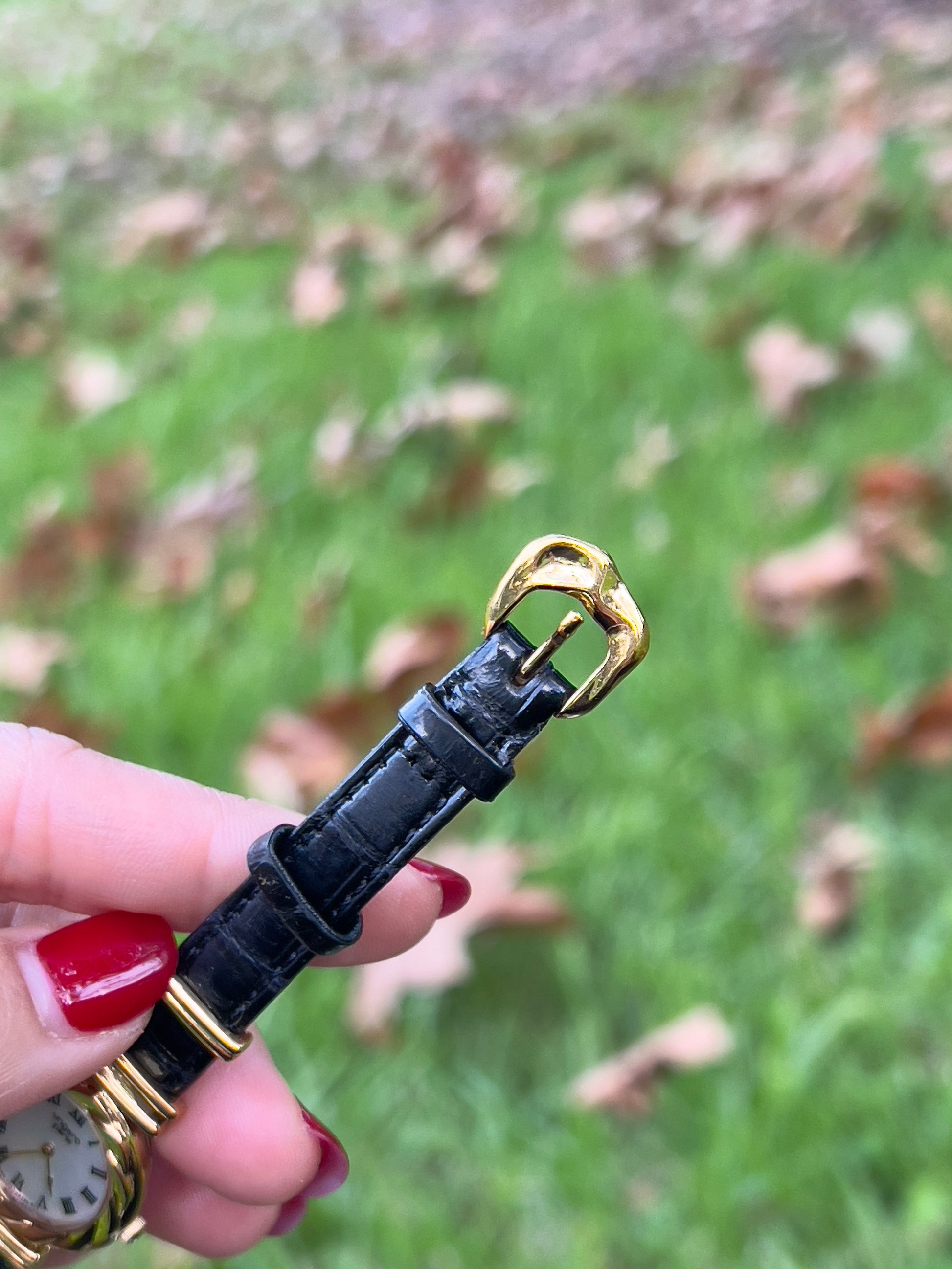 The watch is paired with a black leather strap featuring decorative buckles, adding texture and personality without compromising its graceful silhouette. A gold buckle ties the look together for a cohesive, vintage-lux feel.