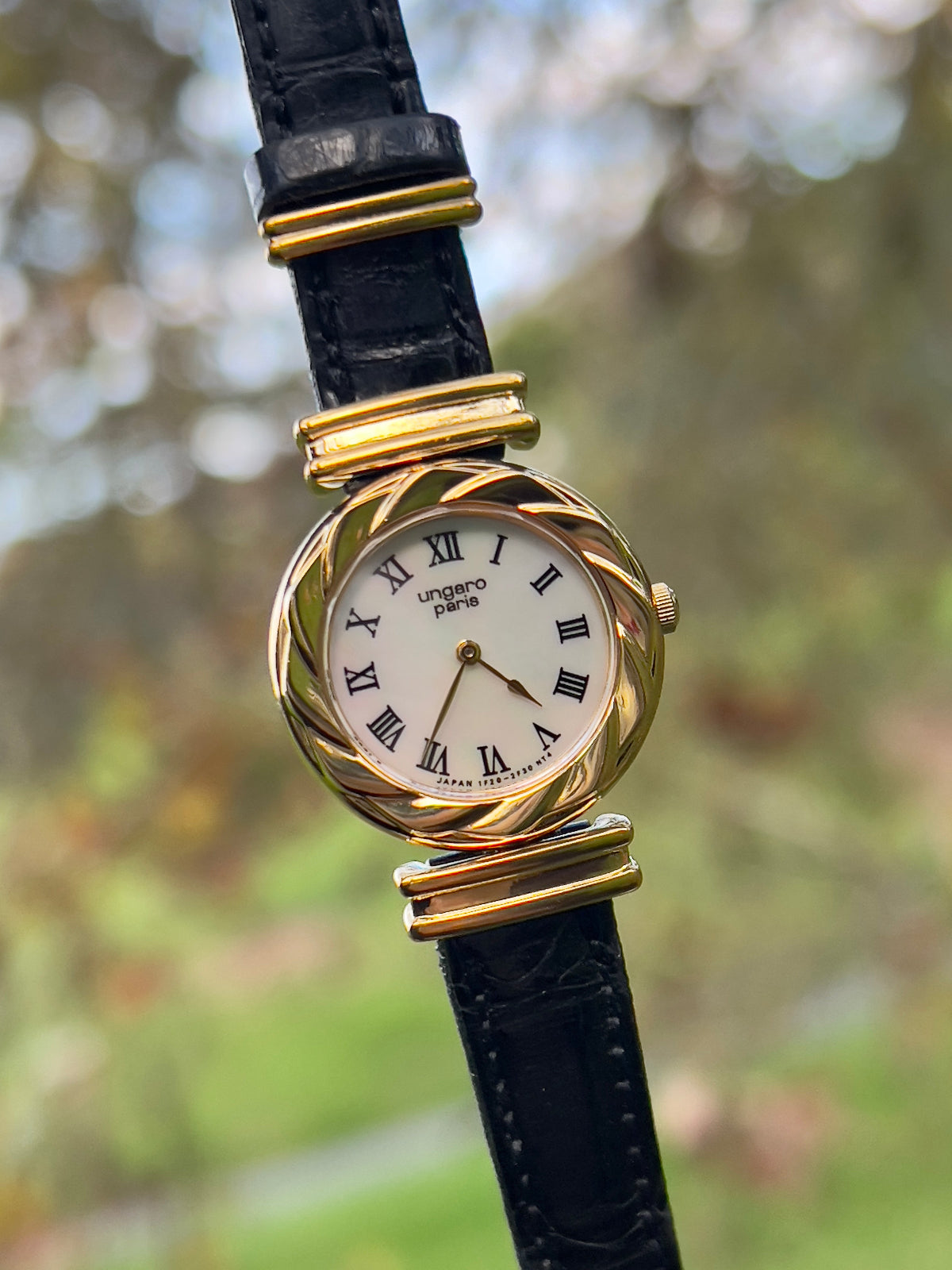 A refined vintage timepiece from Ungaro Paris that beautifully captures classic French elegance. This women’s watch features a lustrous pearl dial that shimmers subtly in the light, complemented by sleek gold indices and dauphine hands, reminiscent of haute French design all encased in a softly contoured oval gold-tone case.