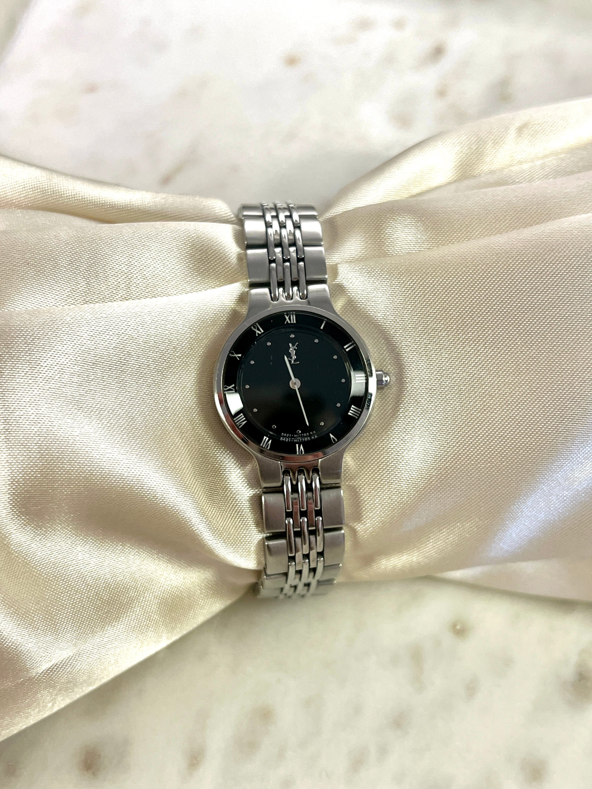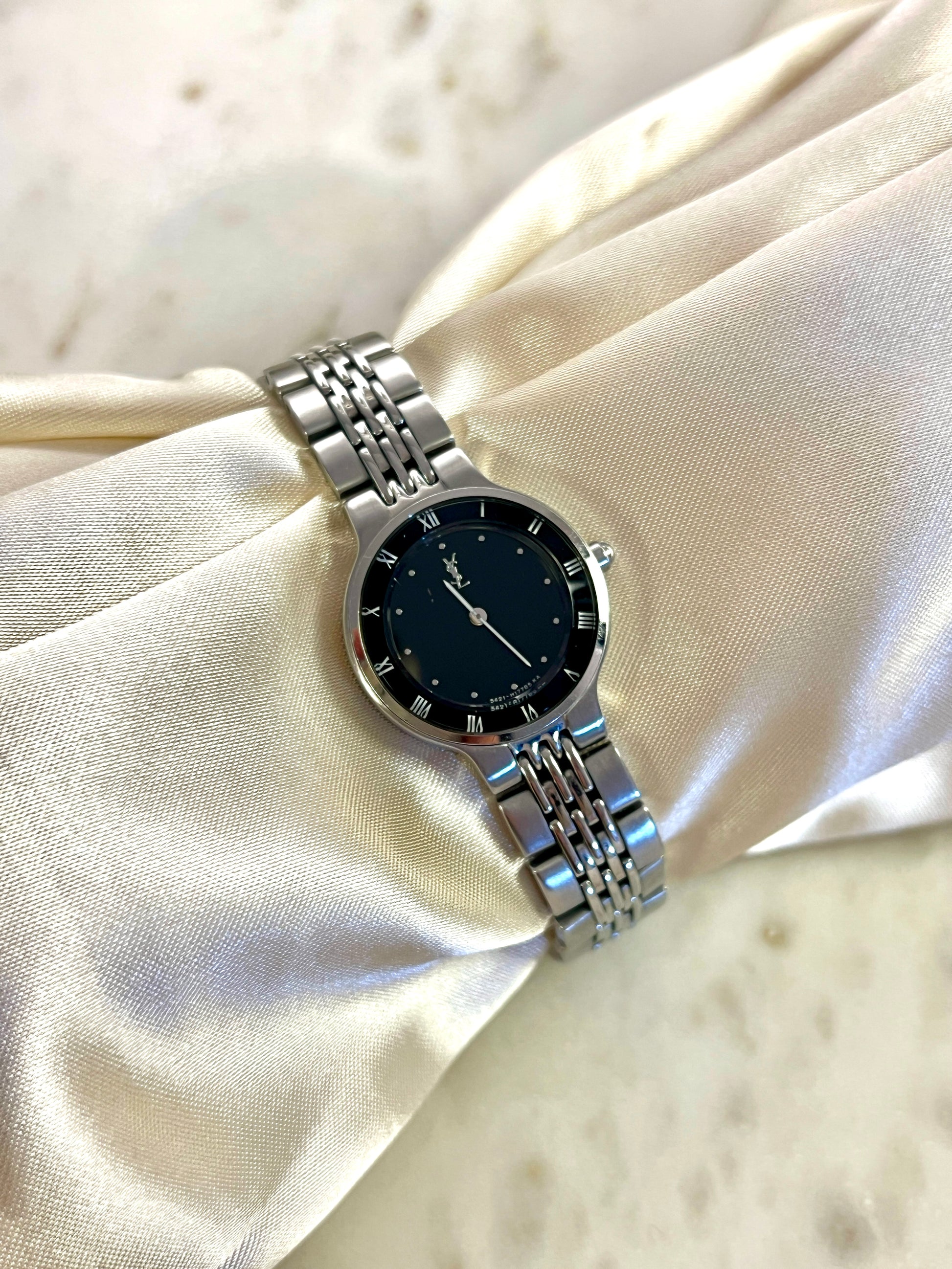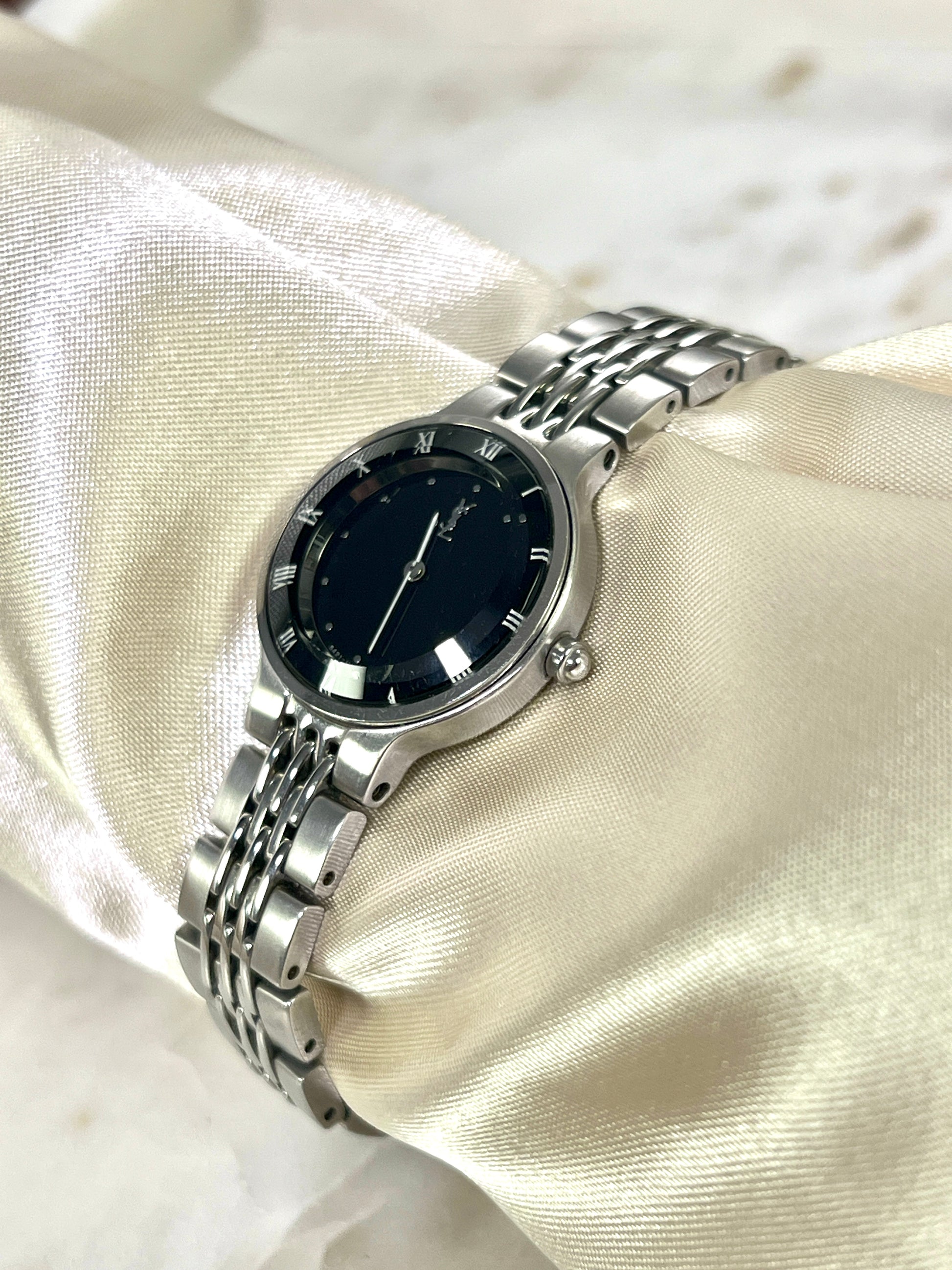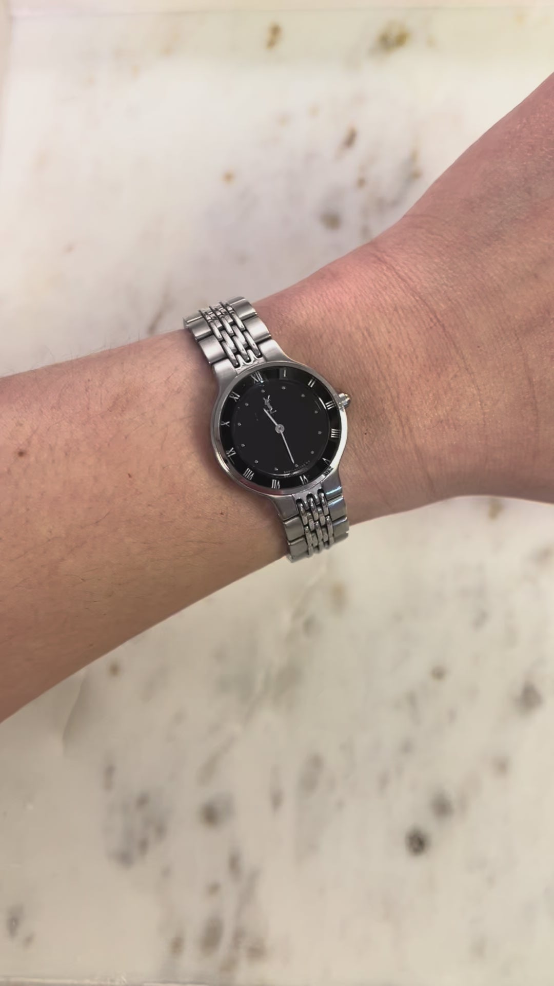 This Yves Saint Laurent ladies watch embodies refined sophistication with a subtle touch of artistry. The polished stainless steel case houses a deep black dial, accented by silver-tone Roman numeral hour markers and the iconic YSL monogram at twelve o’clock.