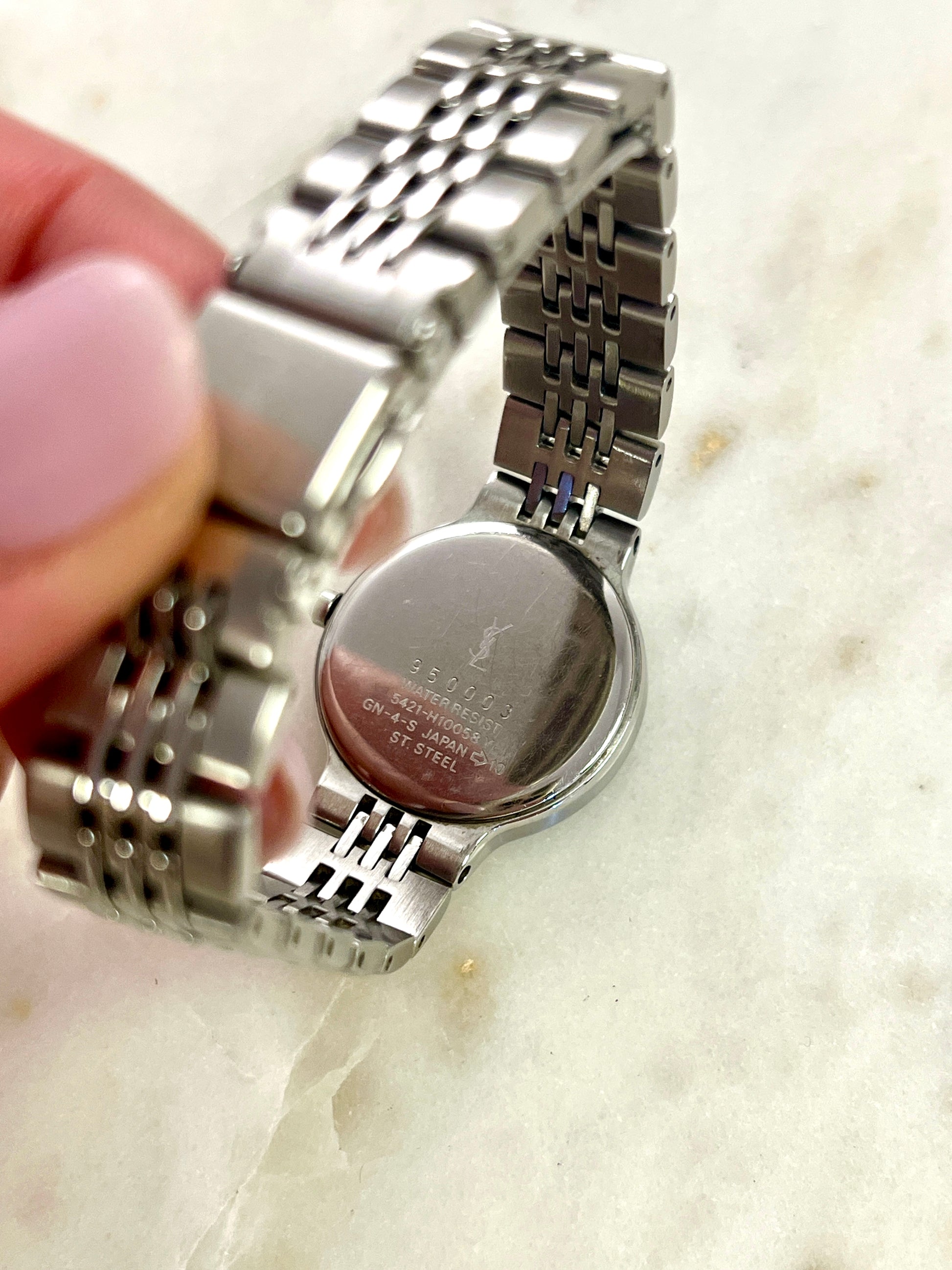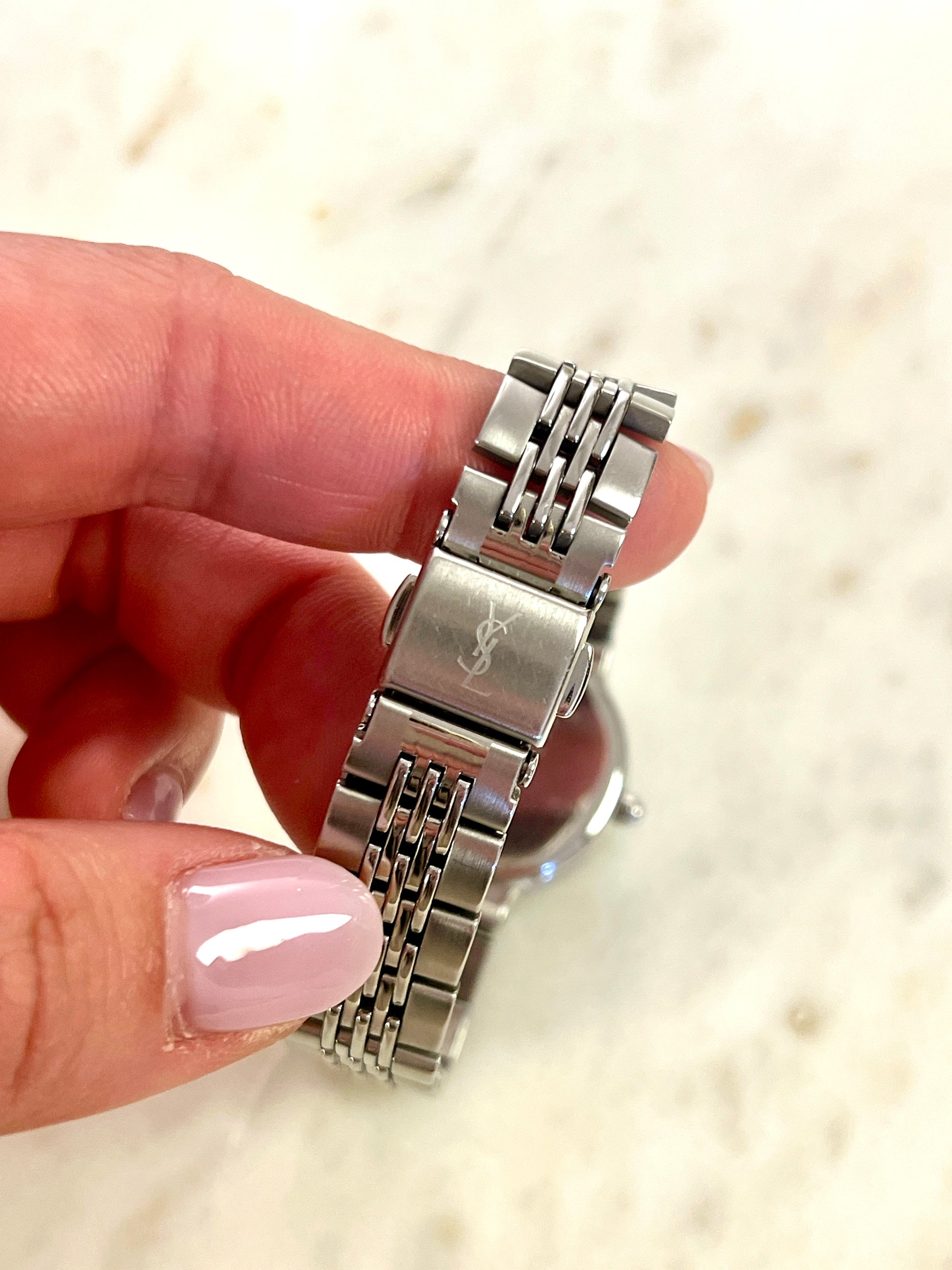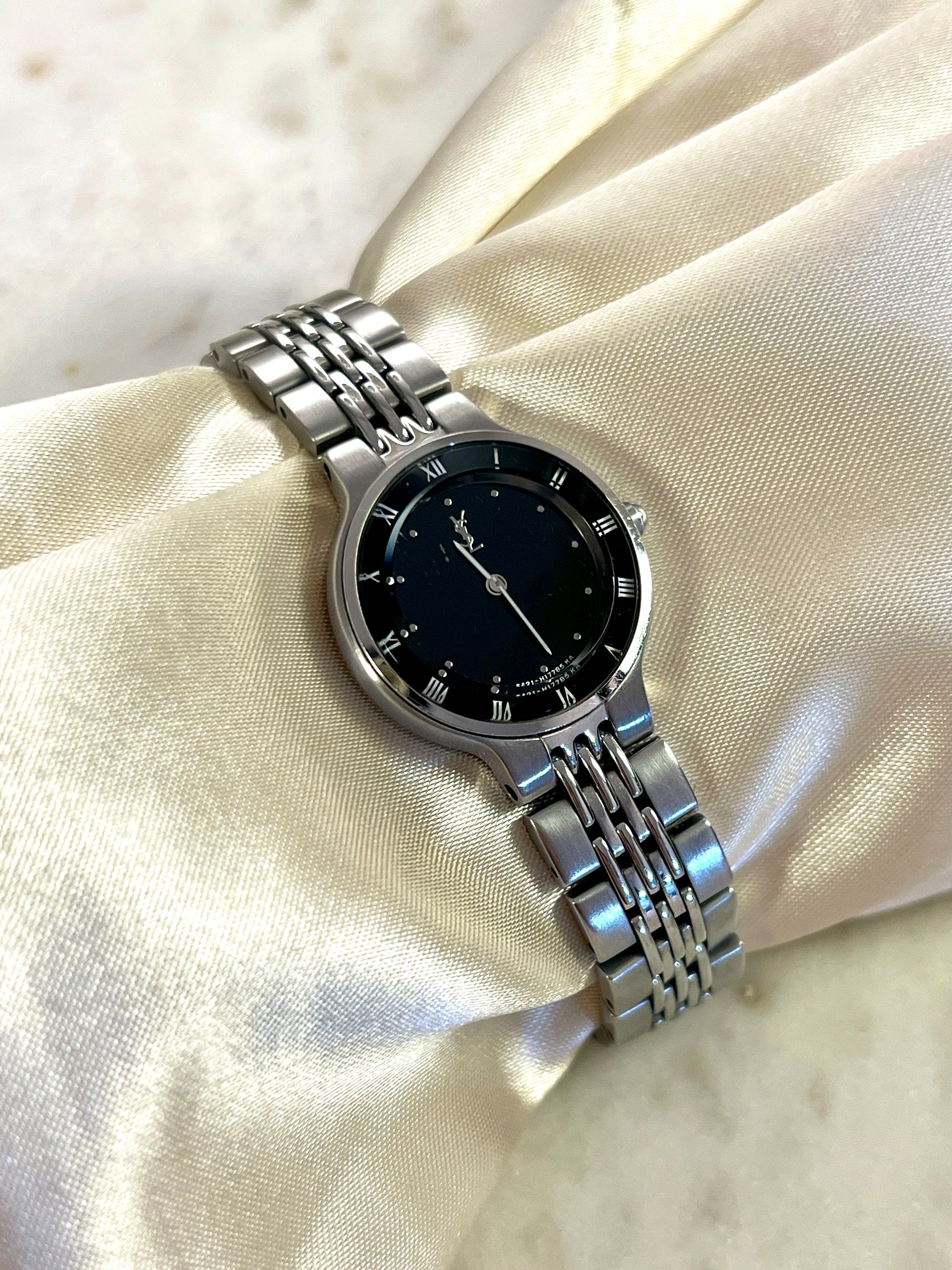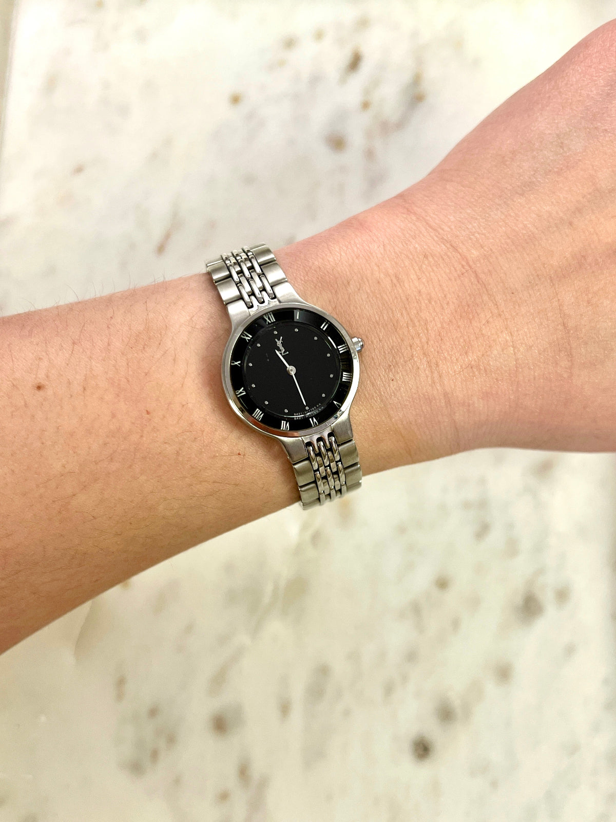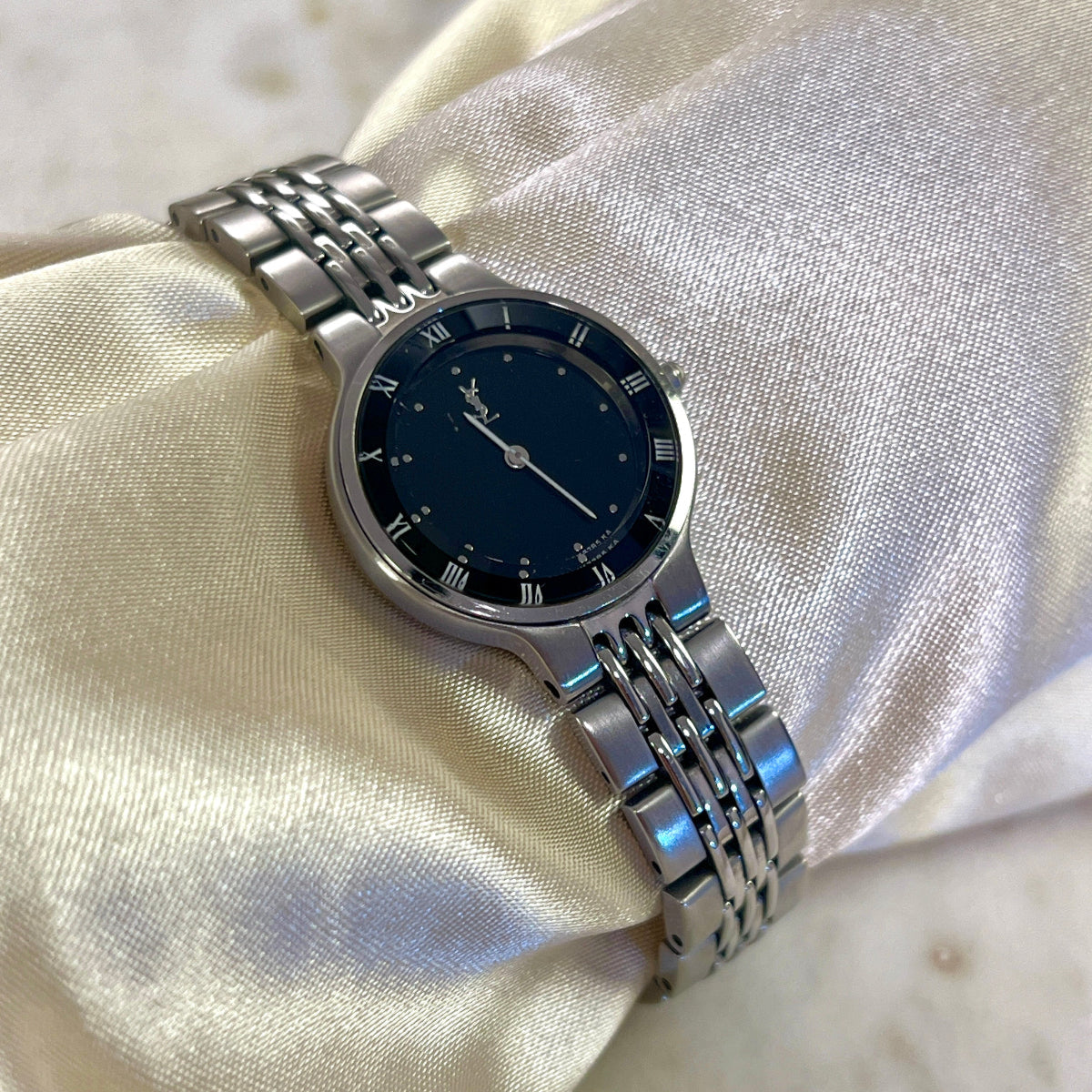 This Yves Saint Laurent ladies watch embodies refined sophistication with a subtle touch of artistry. The polished stainless steel case houses a deep black dial, accented by silver-tone Roman numeral hour markers and the iconic YSL monogram at twelve o’clock.