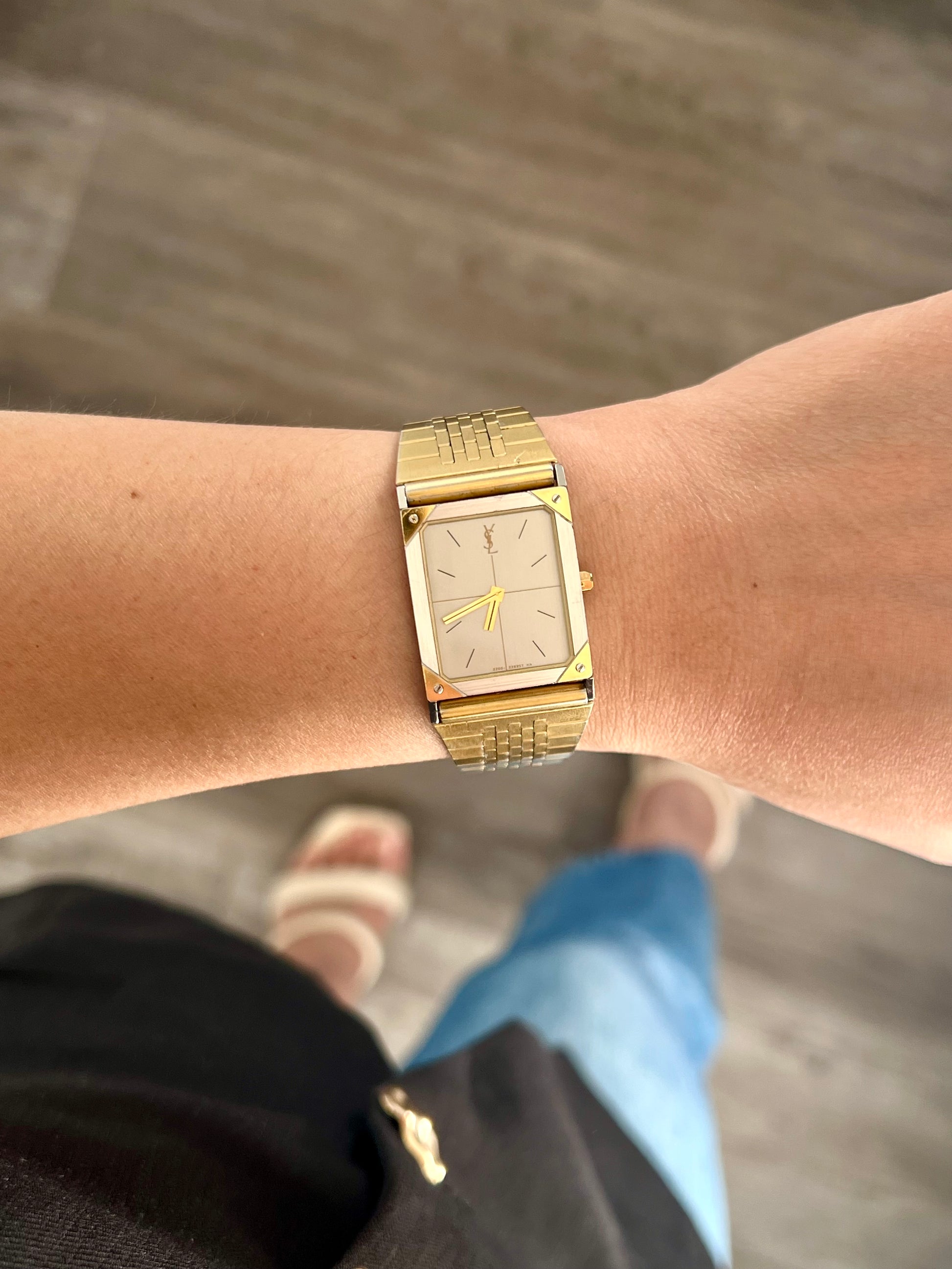 The contrast between cool steel and warm gold creates a harmony found more often in jewellery than in timepieces. The bracelet completes the story with brushed stepped links that move with a draped, fabric like flow. On the wrist the watch feels expressive and elegant, a small but memorable study in confidence, femininity and vintage YSL character. A piece for the woman who enjoys wearing something that feels designed with intention, crafted with flair and finished with a whisper of couture drama.