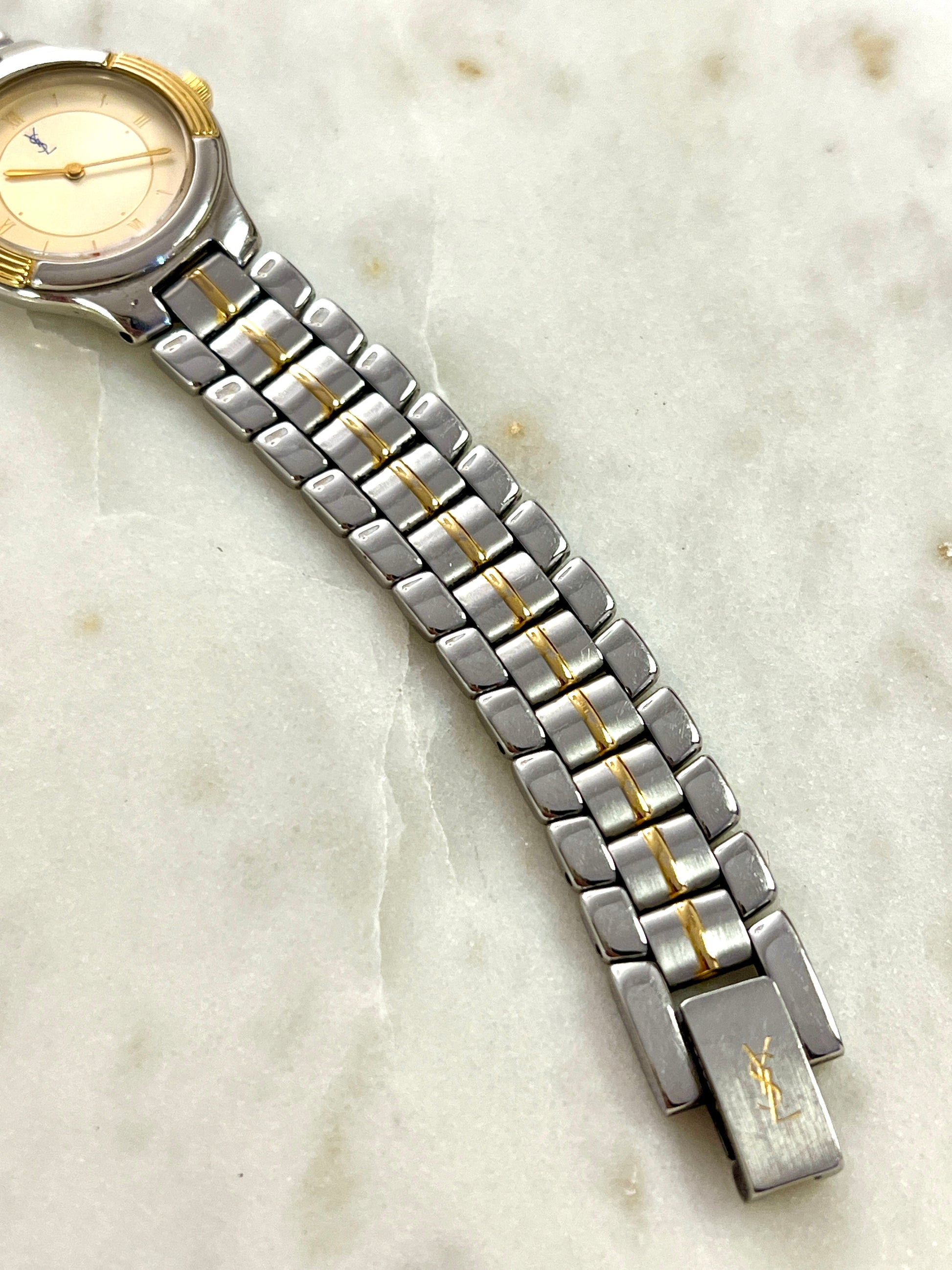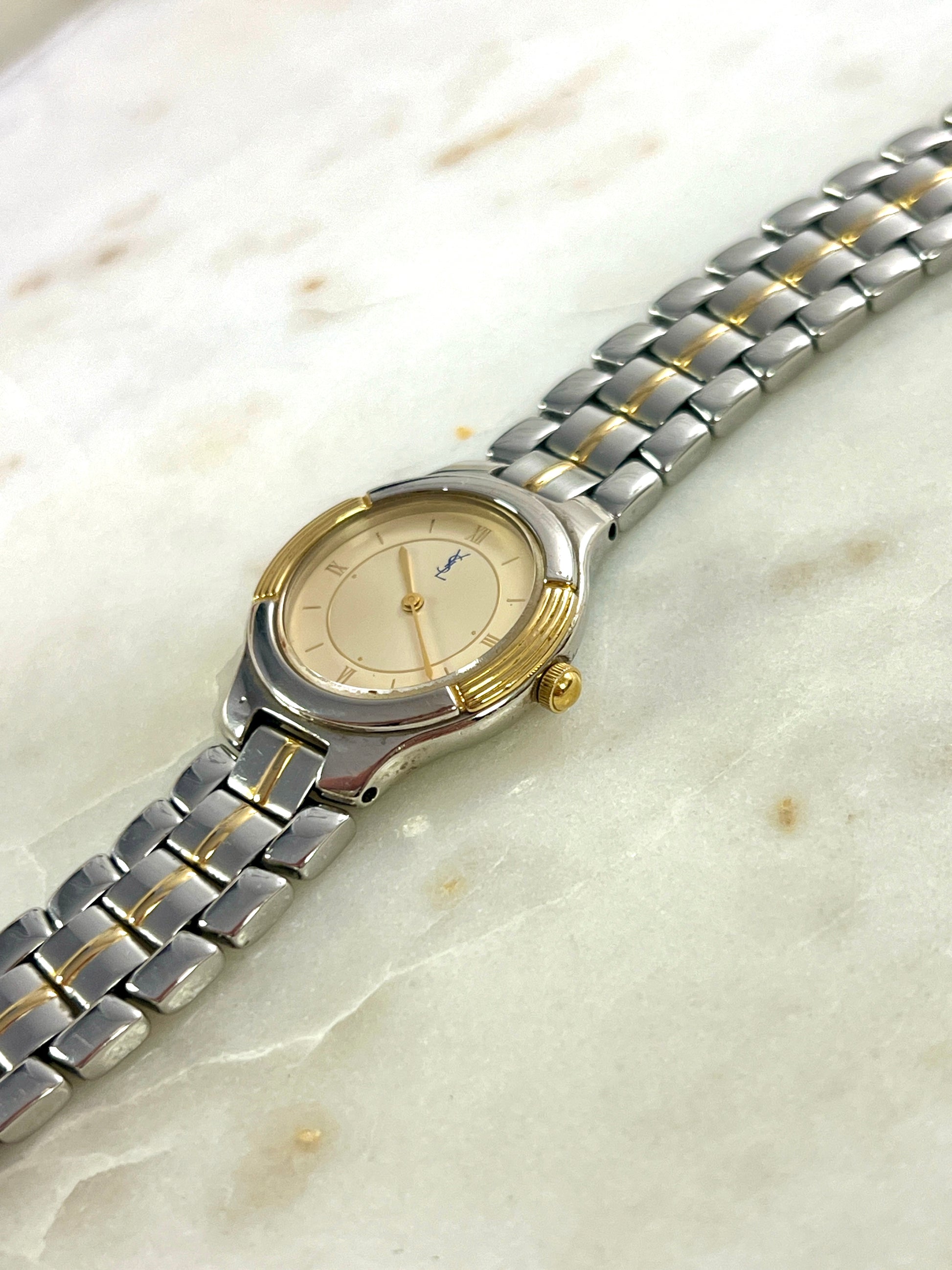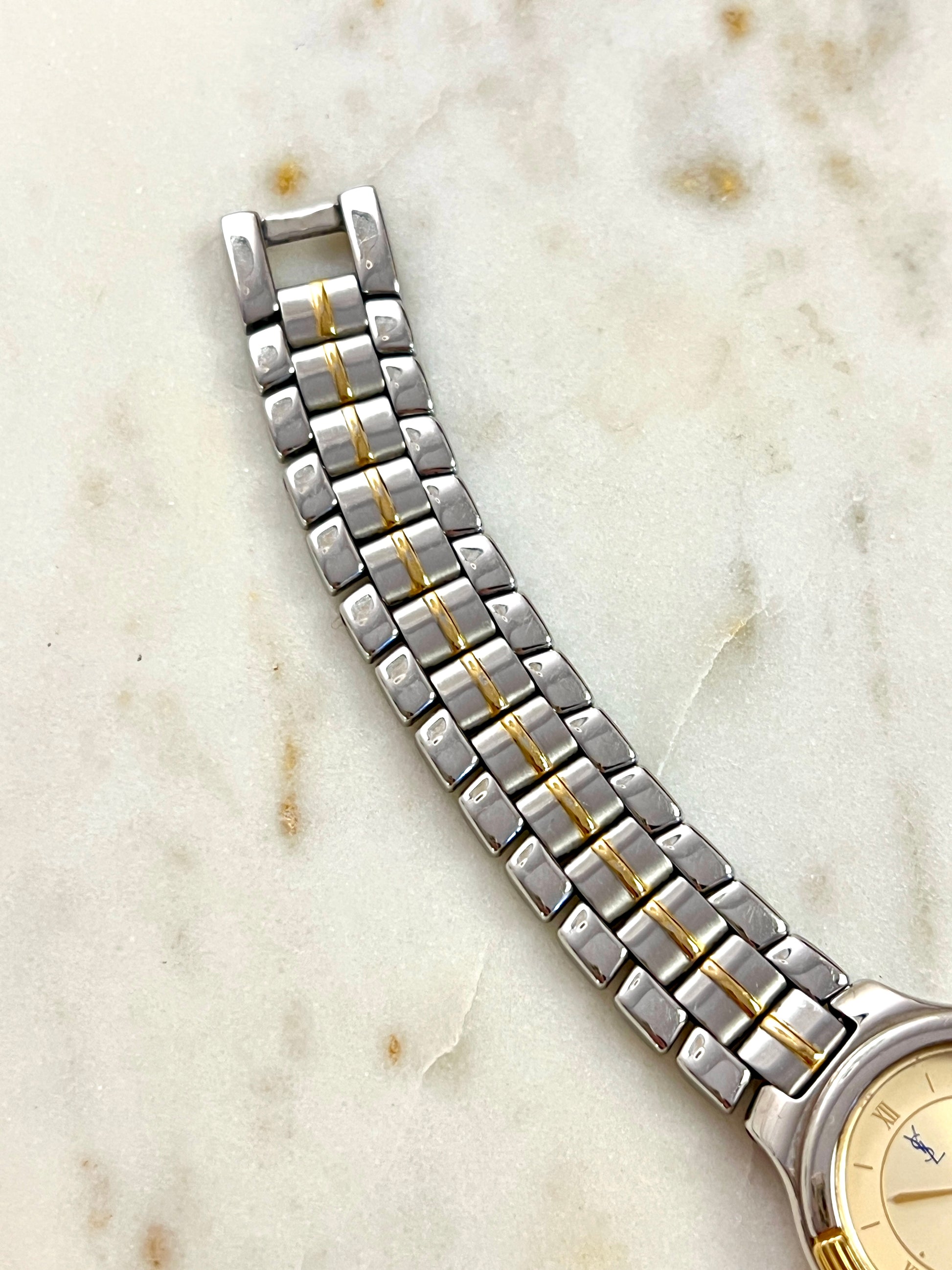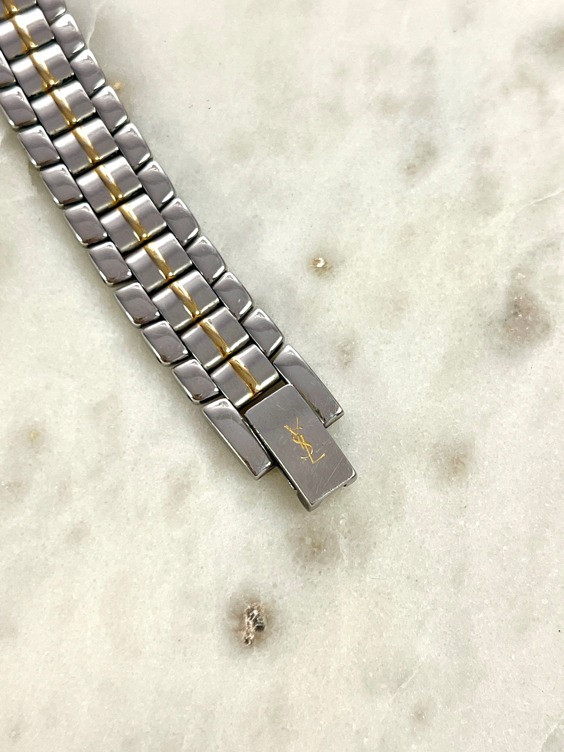 The two-tone bracelet blends stainless steel with gold-tone center links, offering a versatile style that pairs effortlessly with both gold and silver jewelry. Designed for everyday elegance, this YSL watch embodies understated luxury with a touch of vintage charm, making it the perfect accessory for both day and evening wear.