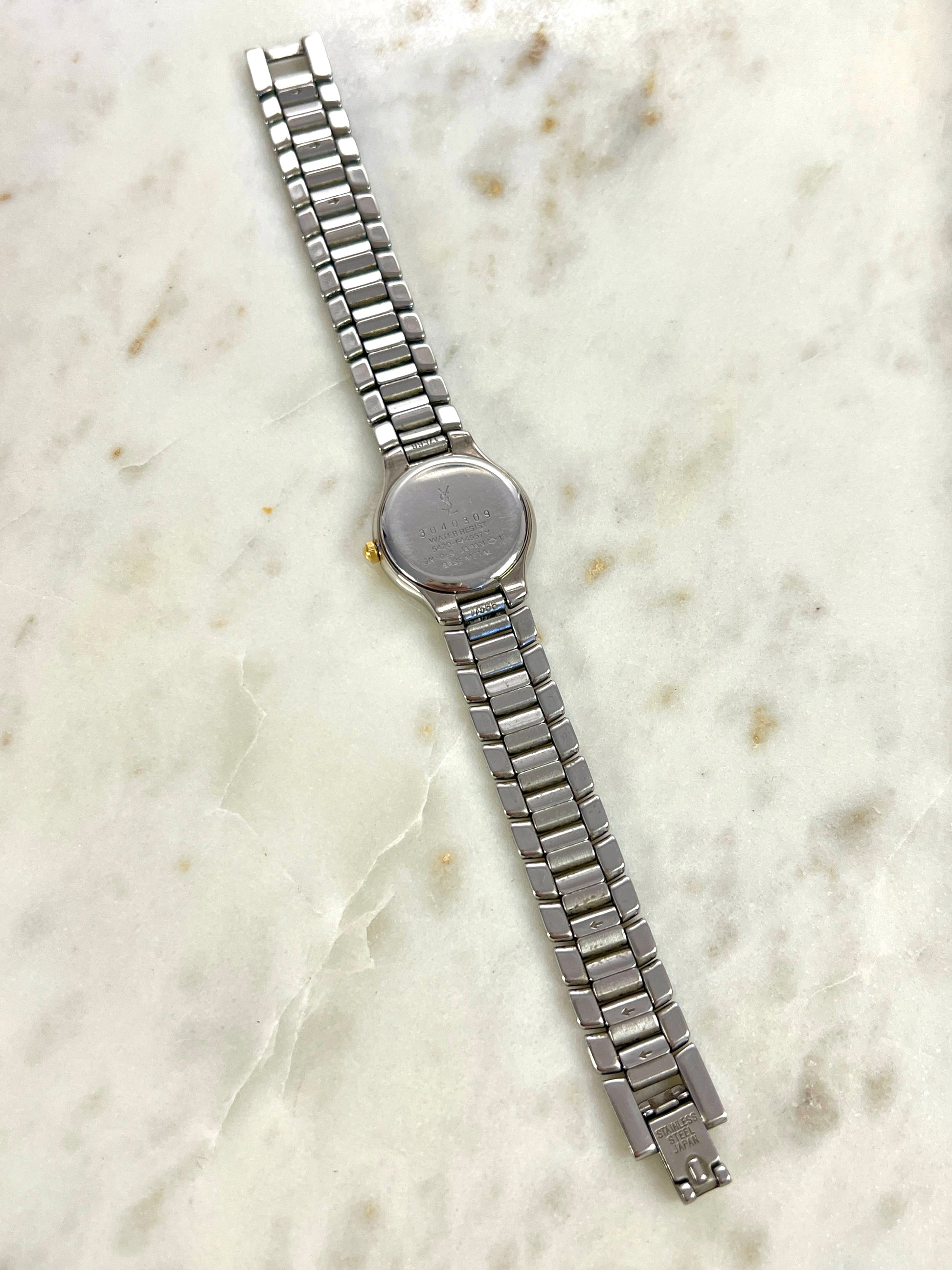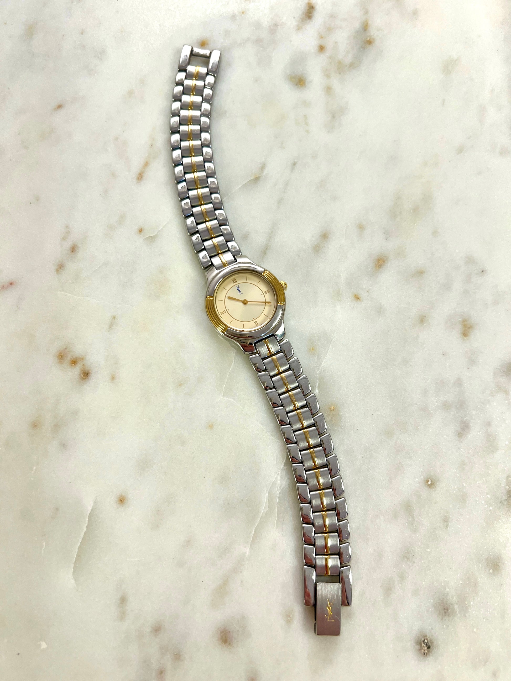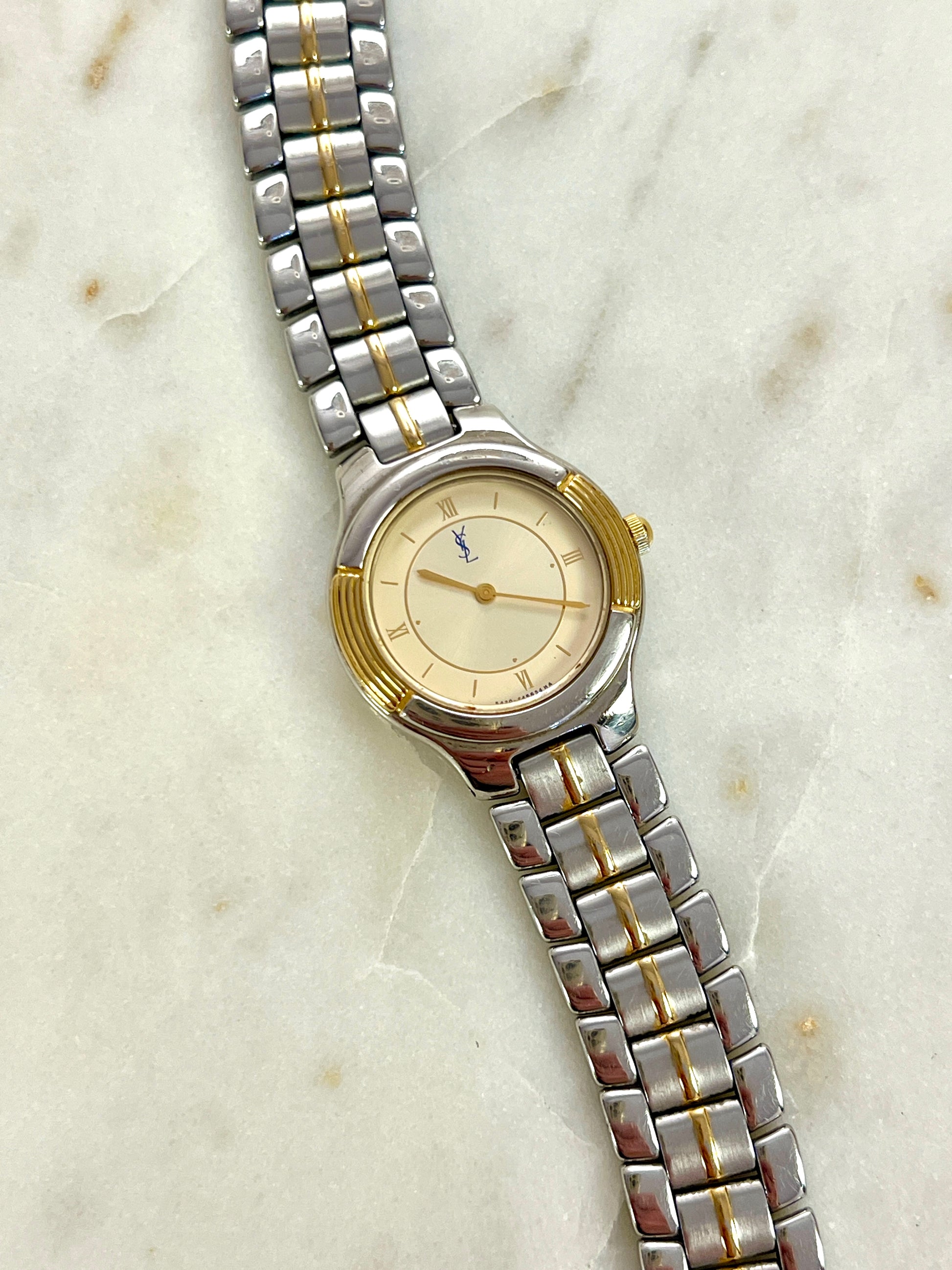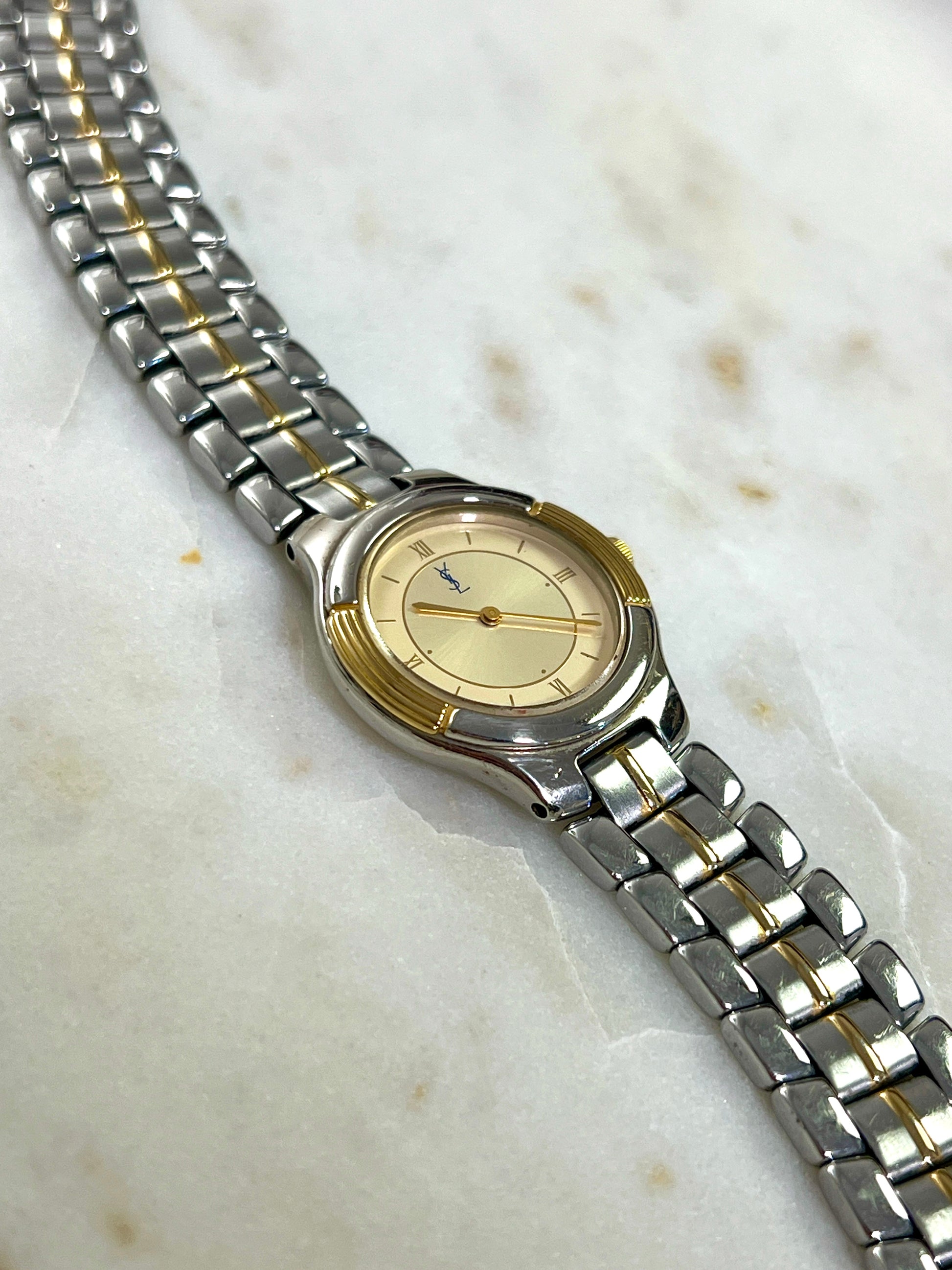 The two-tone bracelet blends stainless steel with gold-tone center links, offering a versatile style that pairs effortlessly with both gold and silver jewelry. Designed for everyday elegance, this YSL watch embodies understated luxury with a touch of vintage charm, making it the perfect accessory for both day and evening wear.